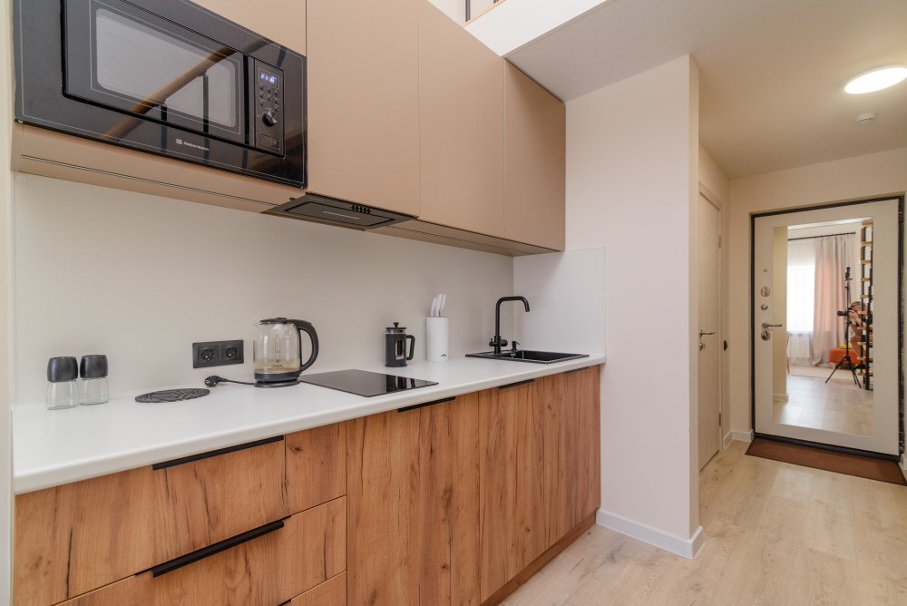 Кухня оборудована всем необходимым: холодильник, варочная панель, духовой шкаф, микроволновка, чайник и посуда.