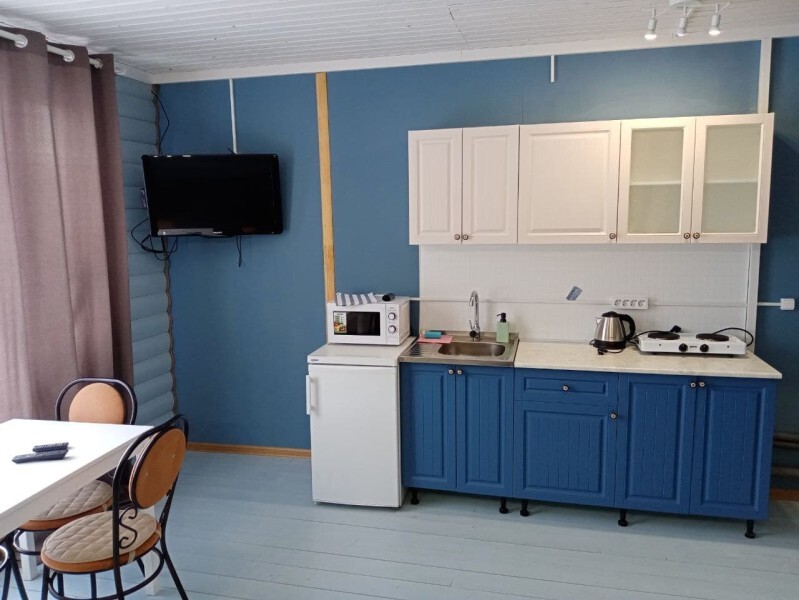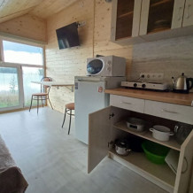 - Кухня (плита, холодильник, раковина, микроволновка, чайник, полный комплект посуды)
