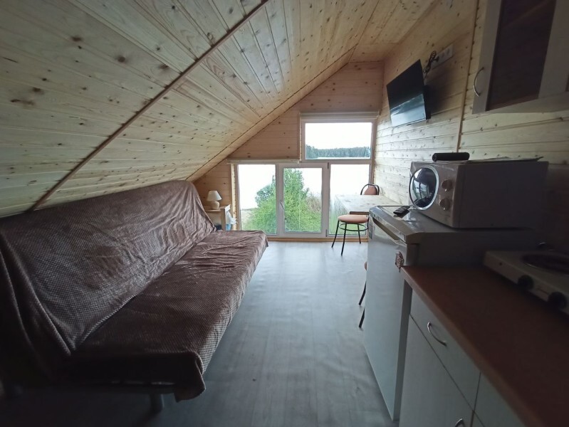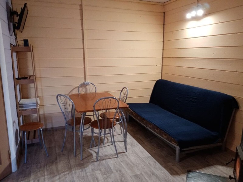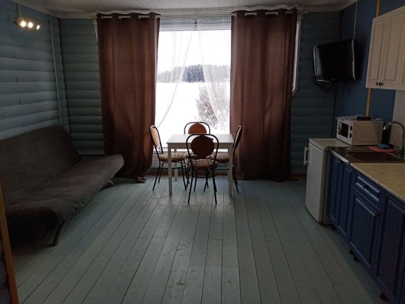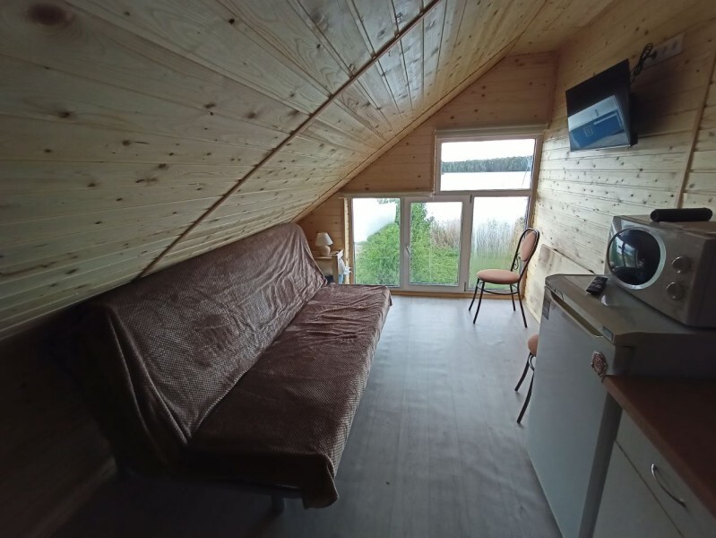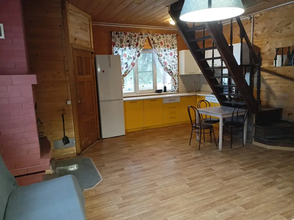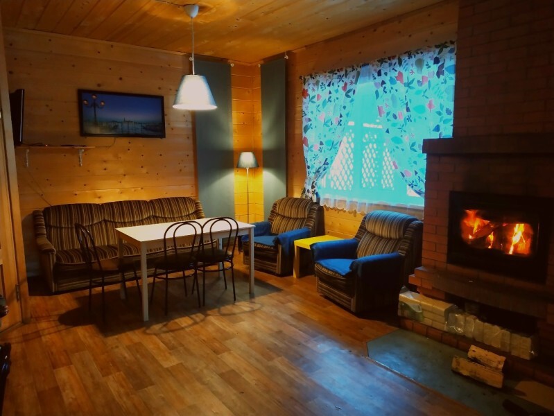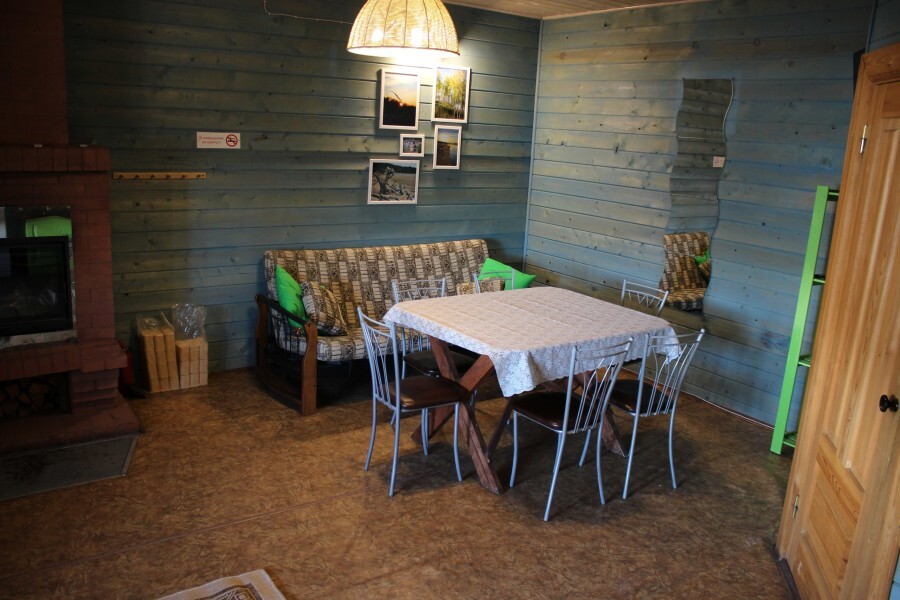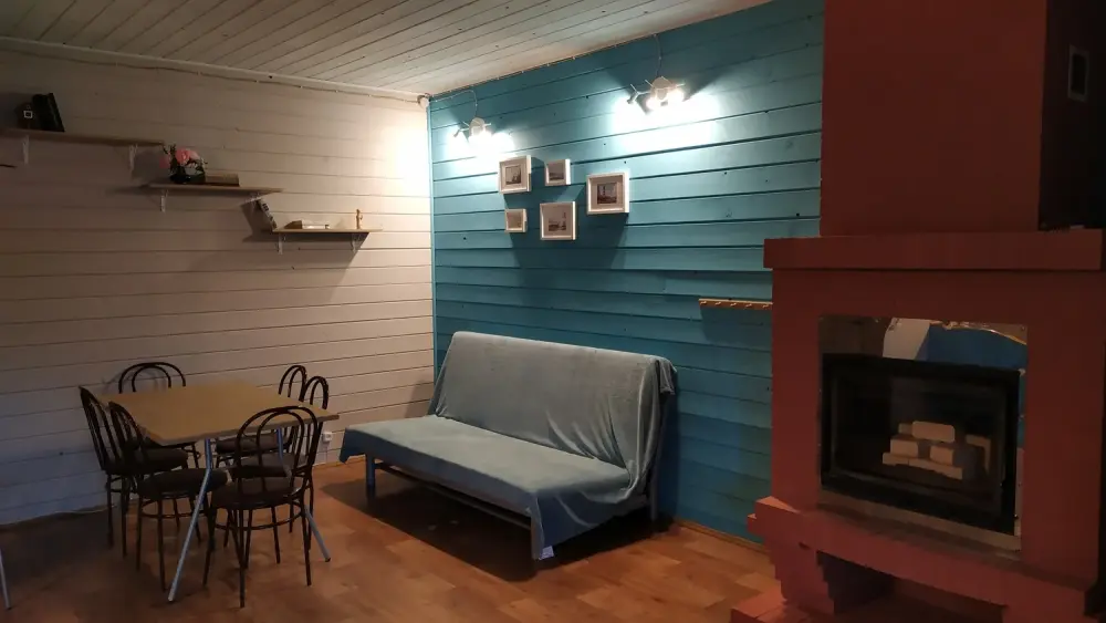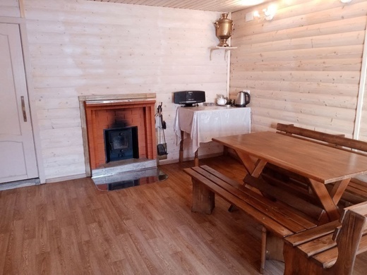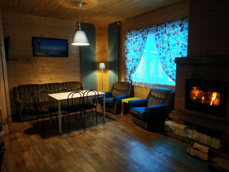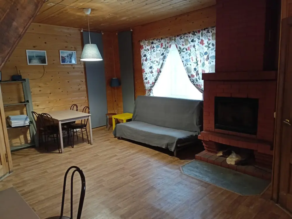 - Гостиная камин, кухня (плита, холодильник, раковина, полный комплект посуды), стол на 6 человек, телевизор, двуспальный раскладной диван, конвектор.