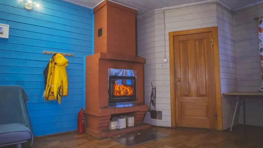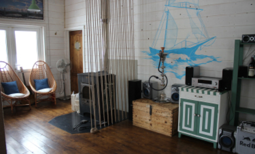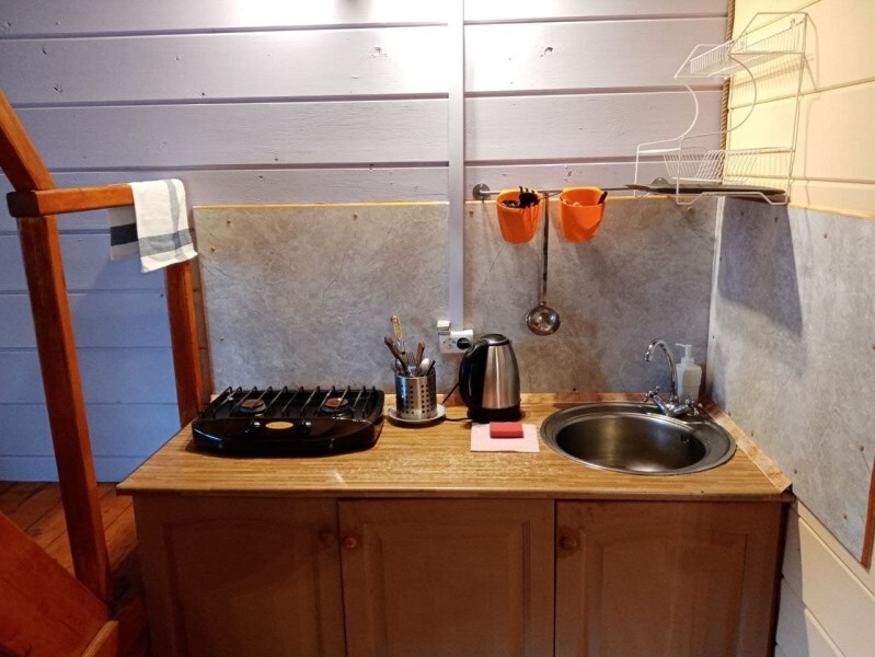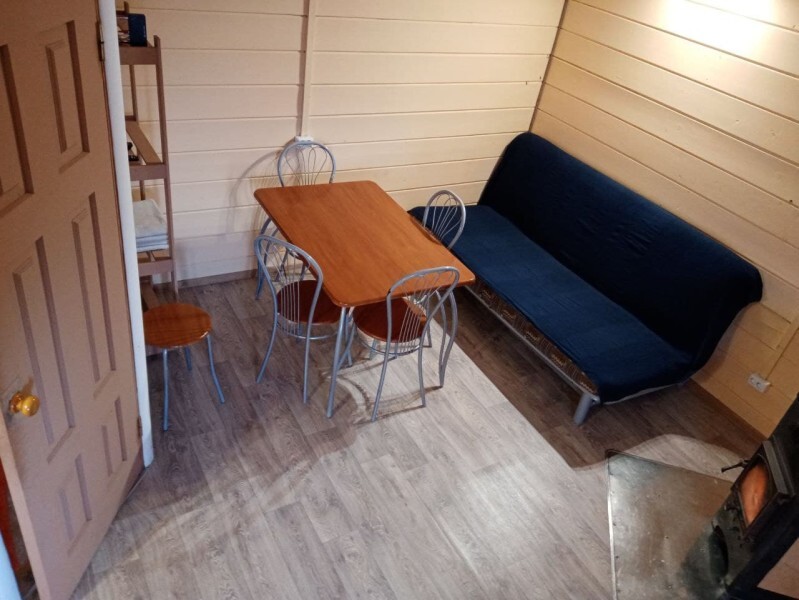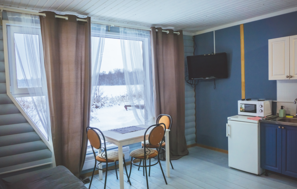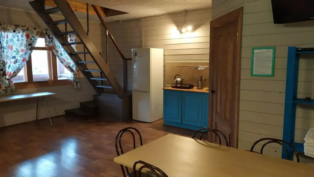 - Гостиная: камин, кухня (плита, холодильник, раковина, полный комплект посуды), 2 стола с комплектом стульев, телевизор, DVD, двуспальный раскладной диван, конвектор.