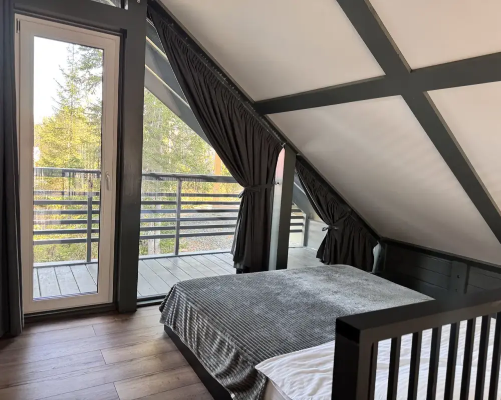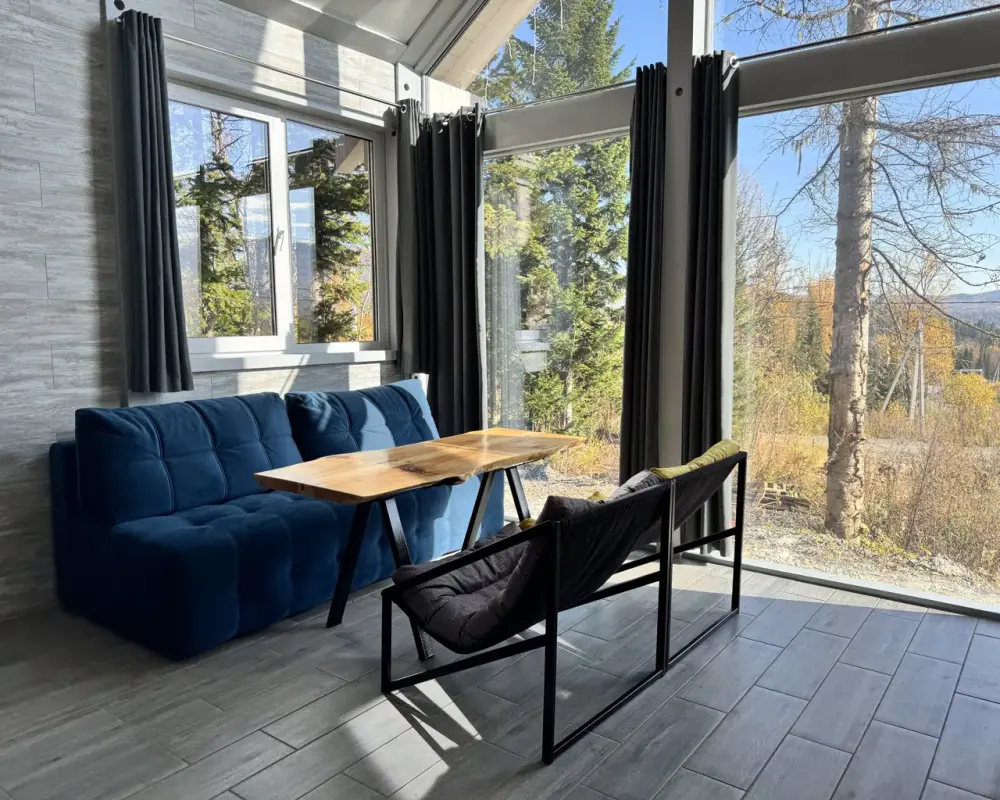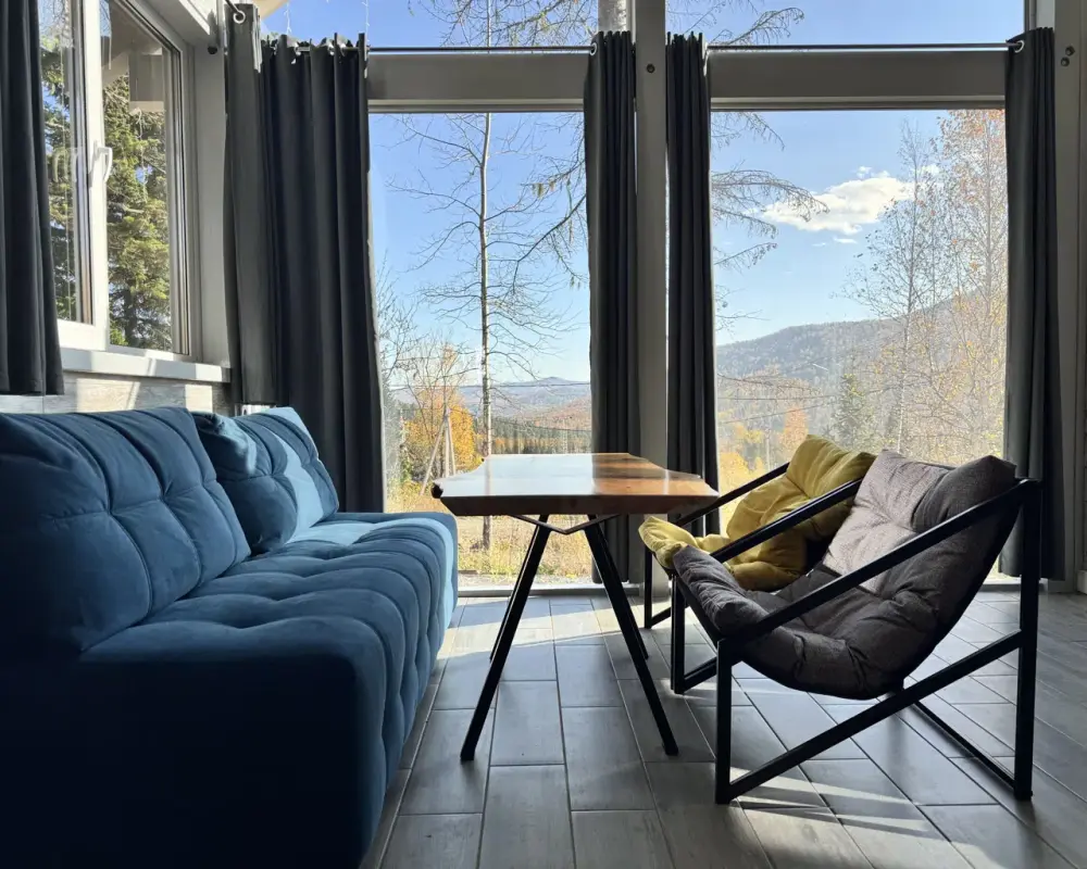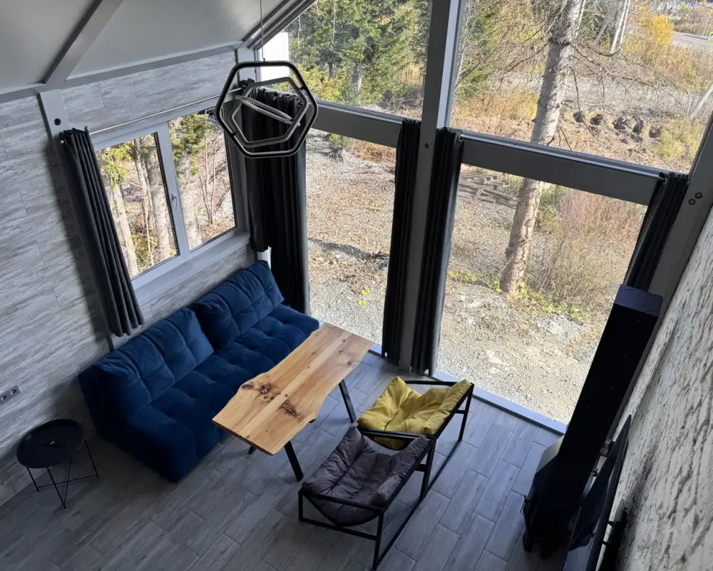 На 1 этаже: полностью оборудованная кухонная зона, раскладывающийся диван, обеденная зона, телевизор, камин с живым огнем и панорамное окно, совмещенный санузел с ванной комнатой.