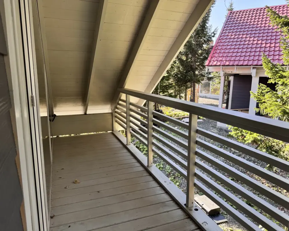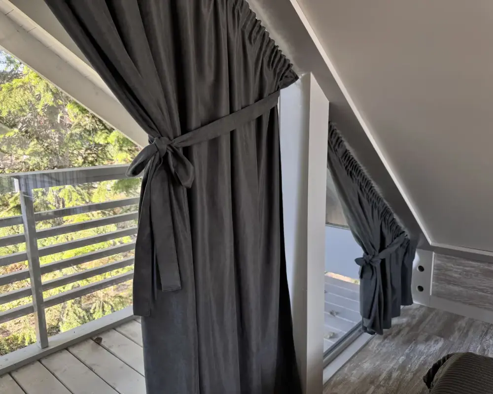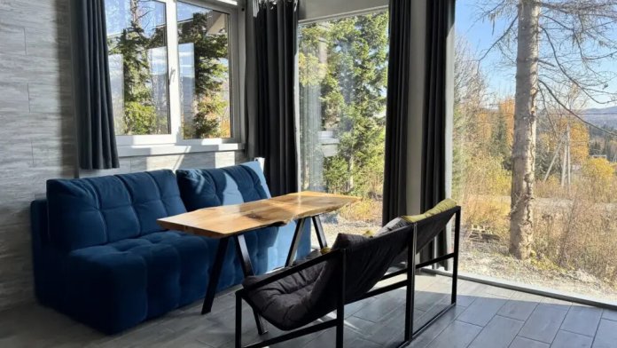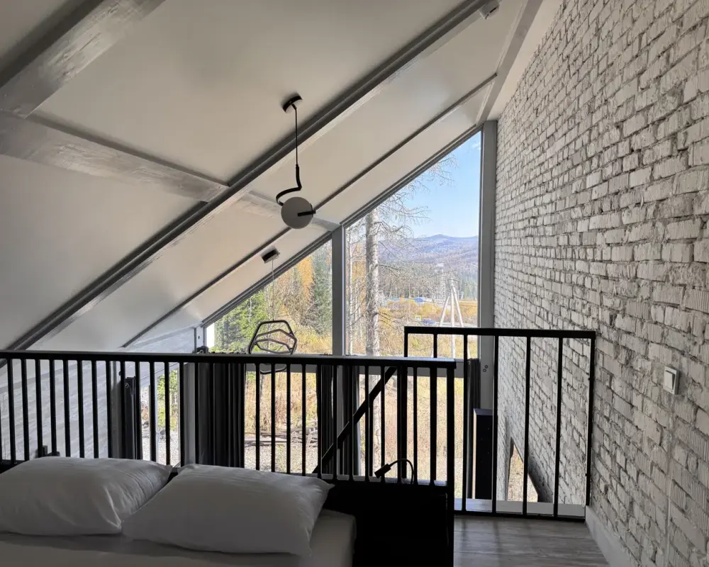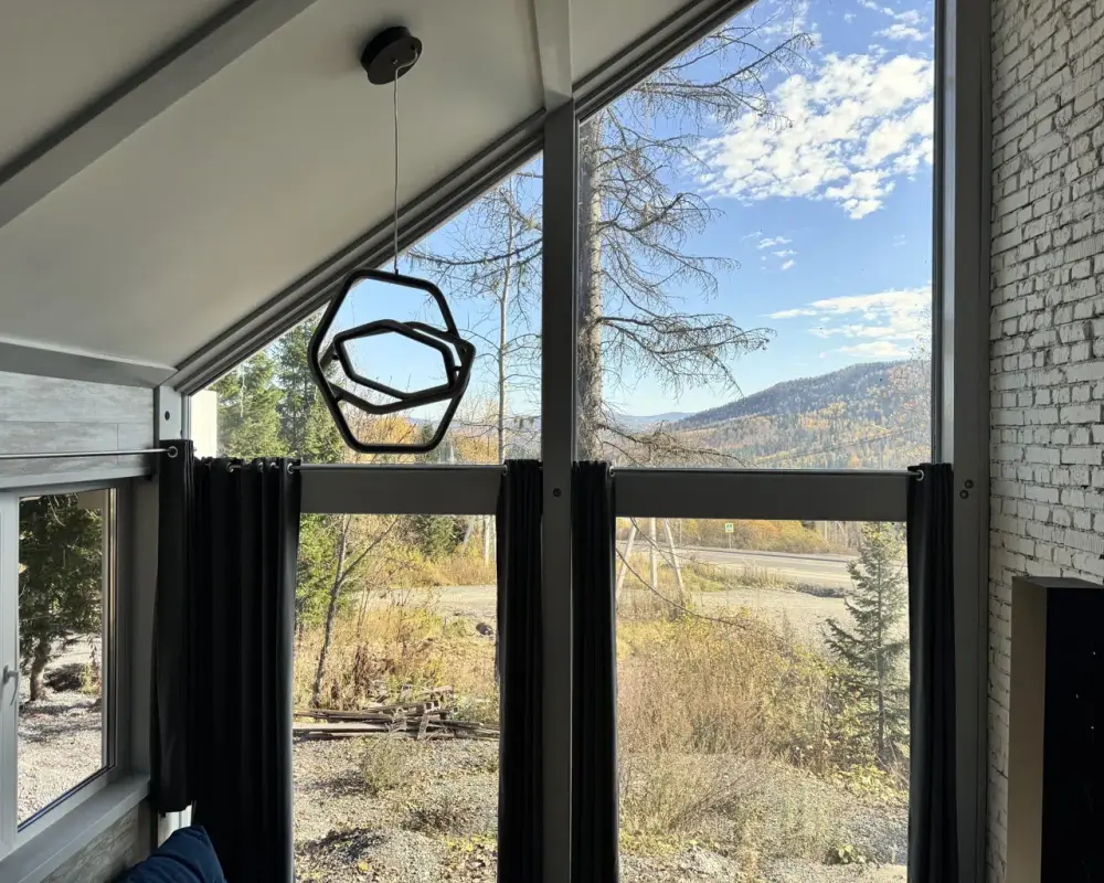 На 1 этаже: полностью оборудованная кухонная зона, раскладывающийся диван, обеденная зона, телевизор, камин с живым огнем и панорамное окно, совмещенный санузел с ванной комнатой.