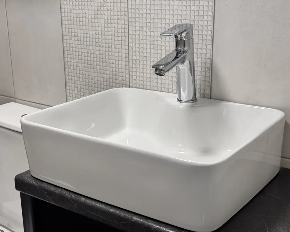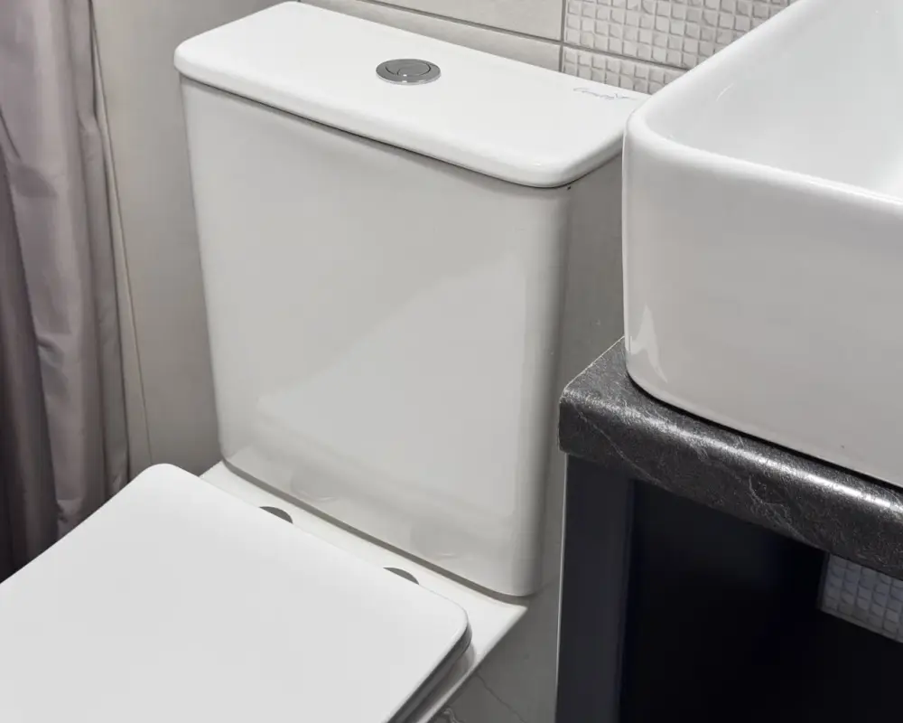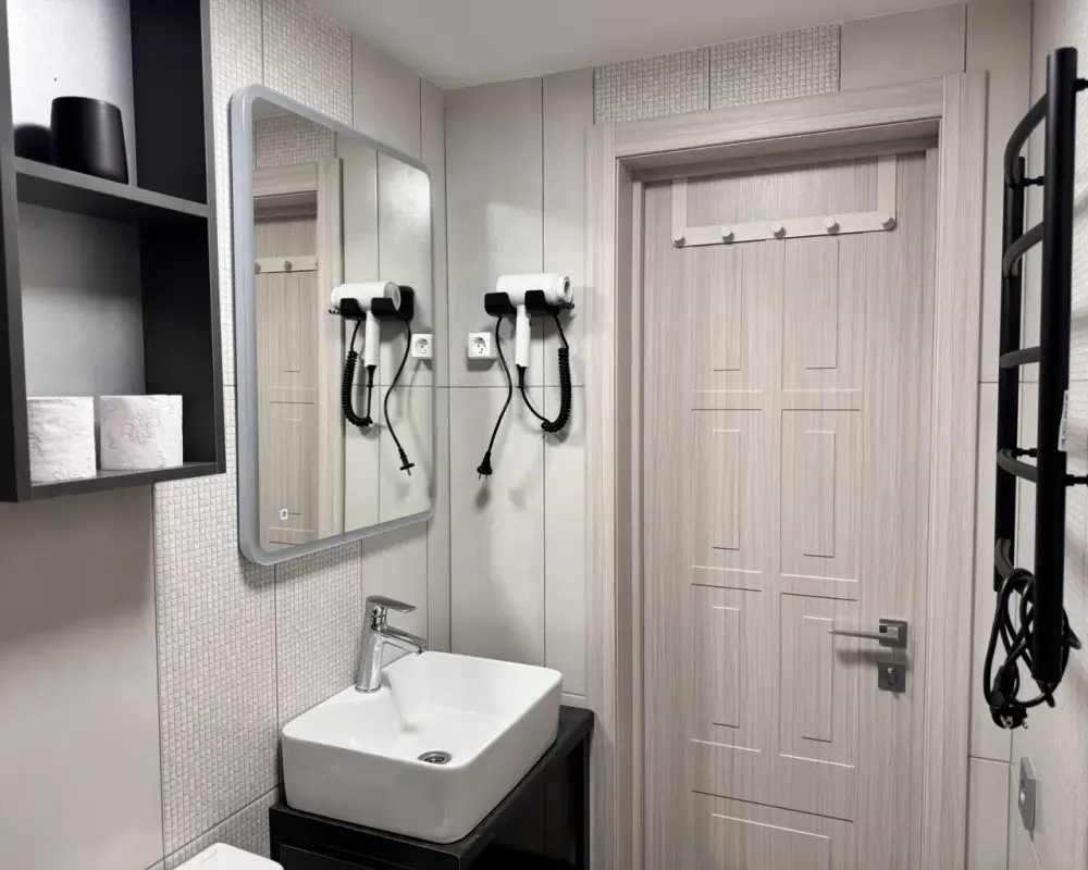 Совмещенный санузел с ванной комнатой: душевая, с/у, раковина для умывания, фен, косметика в диспенсерах.
