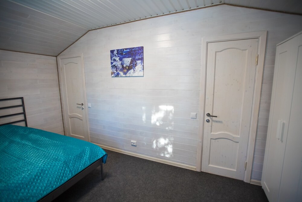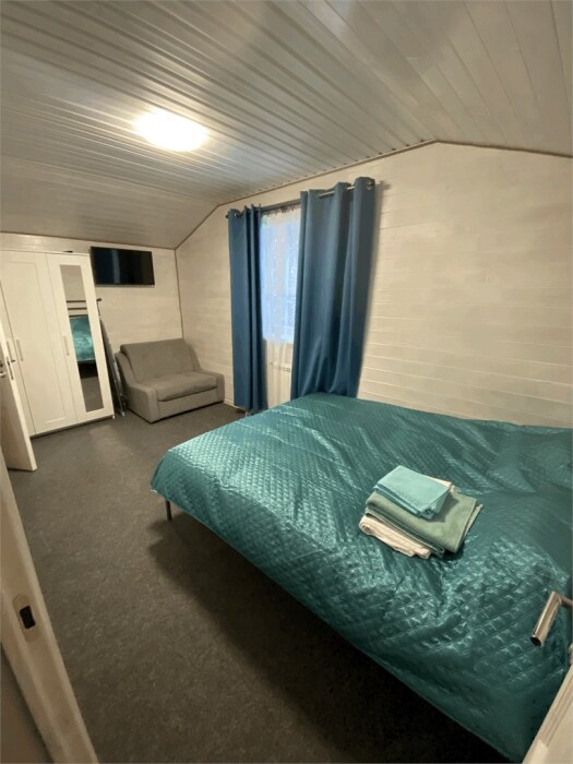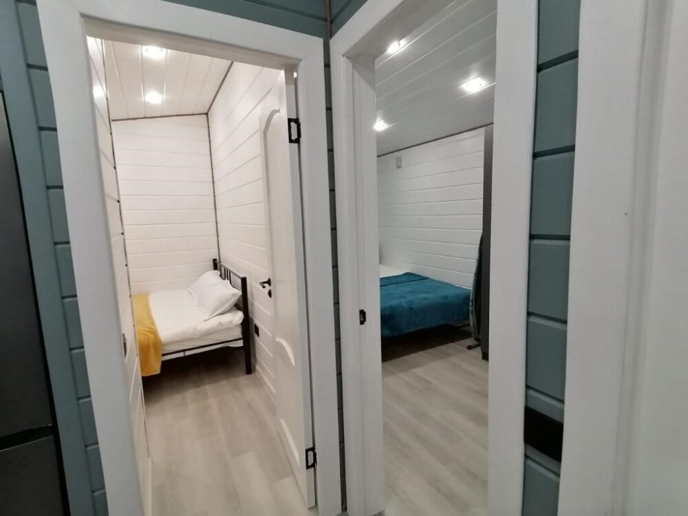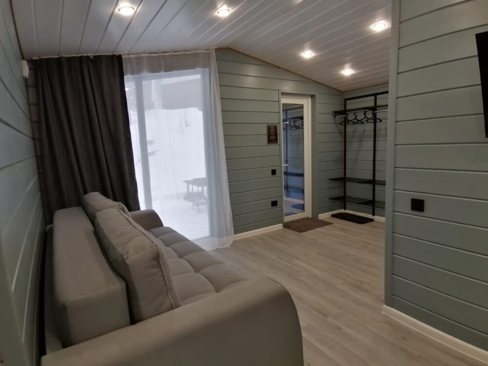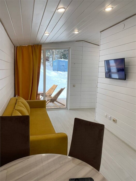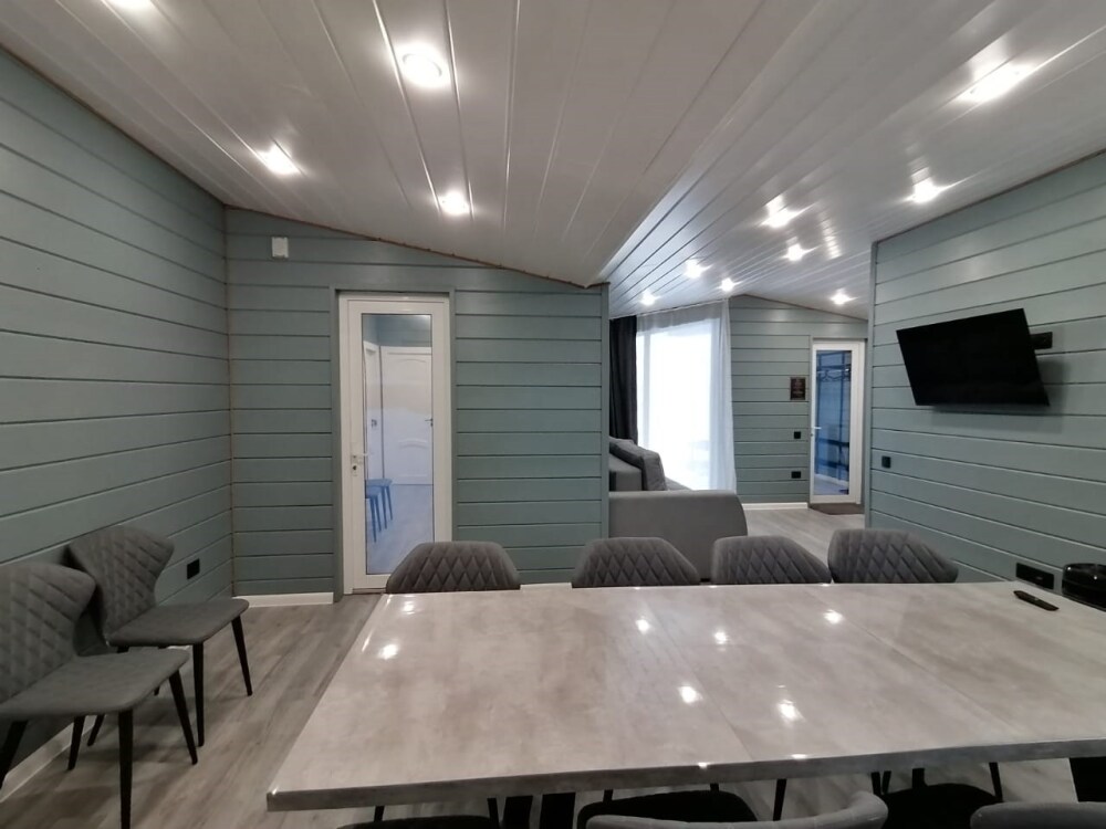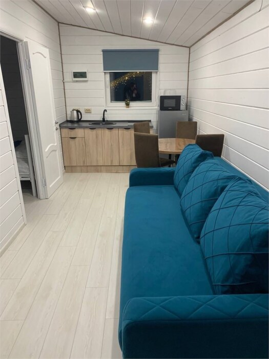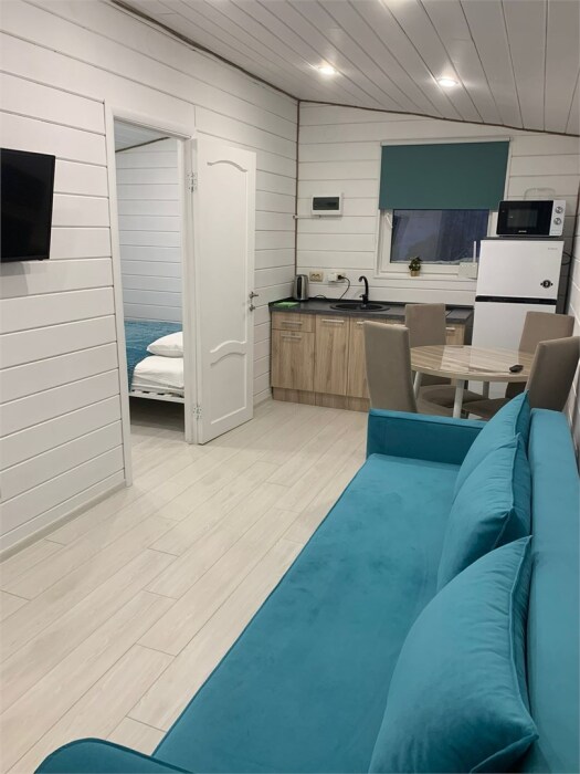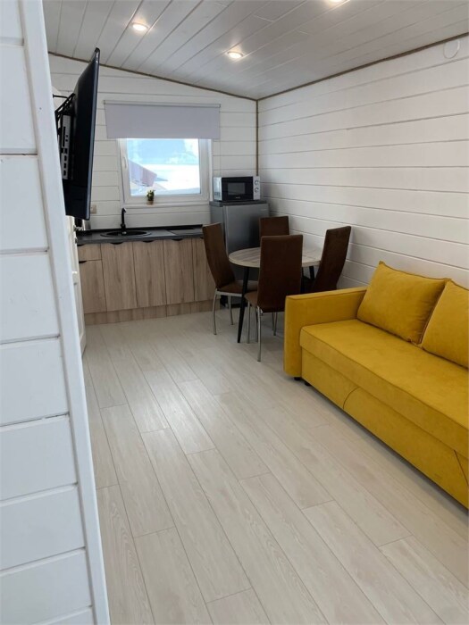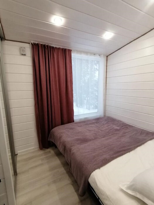 В доме 4 спальных места, прихожая, гостиная-столовая, изолированная спальня с двуспальной кроватью и панорамным окном.