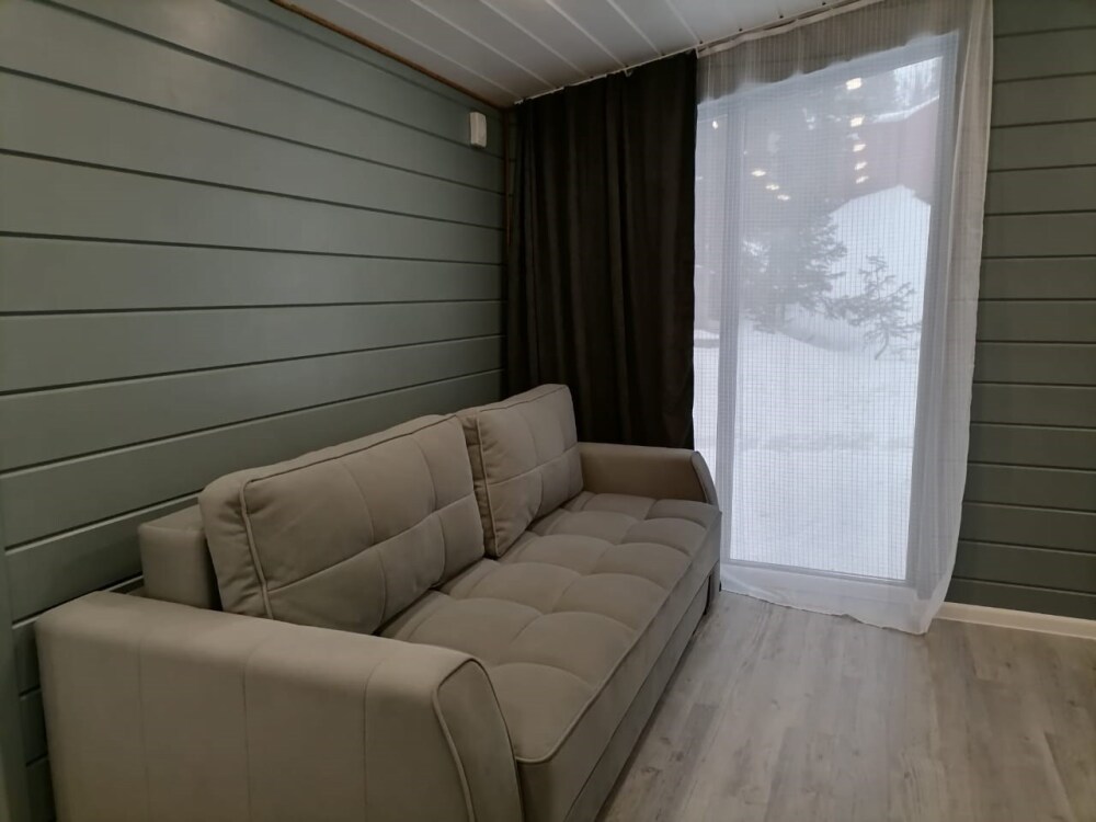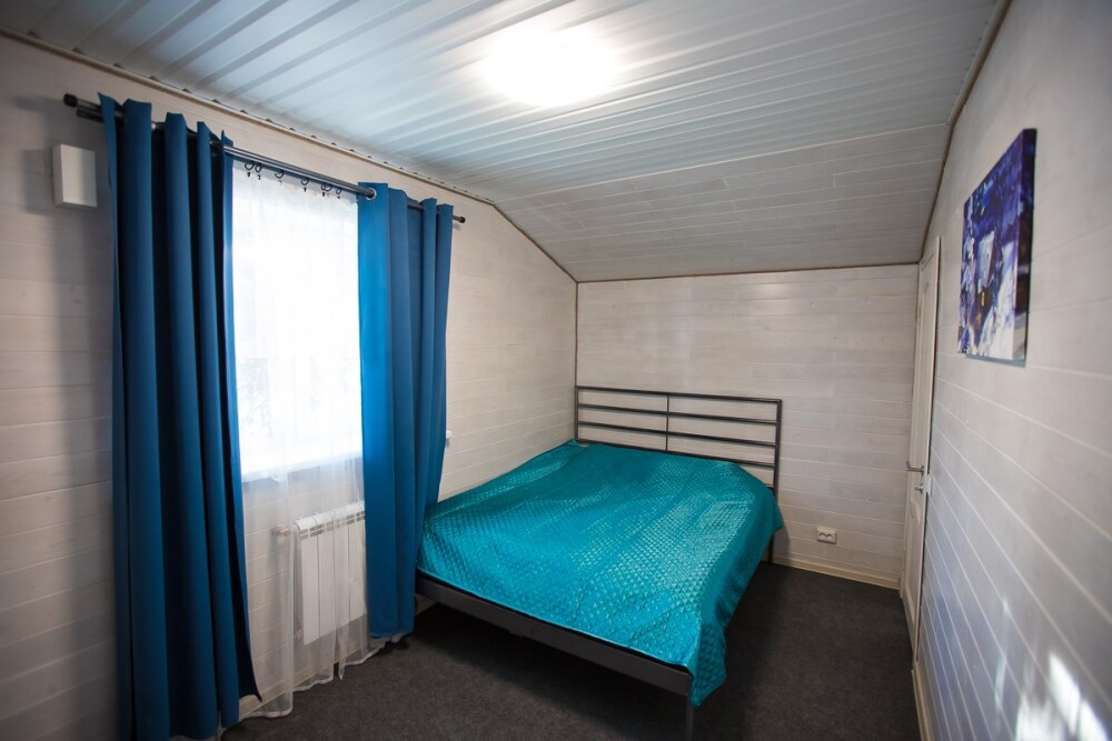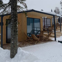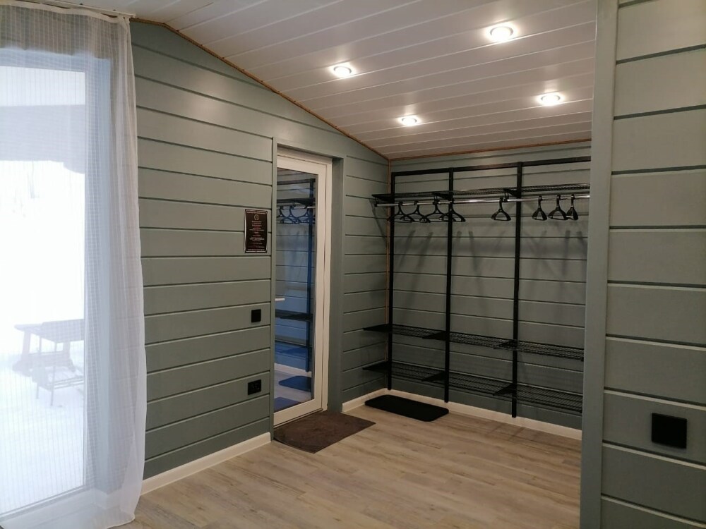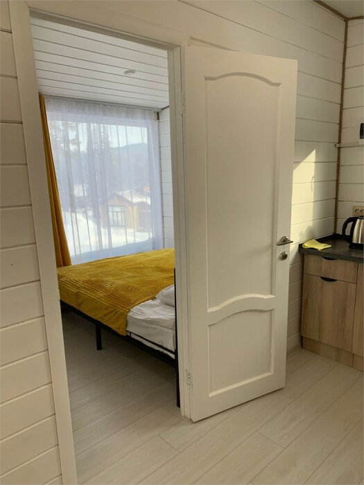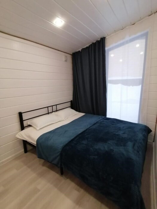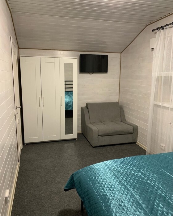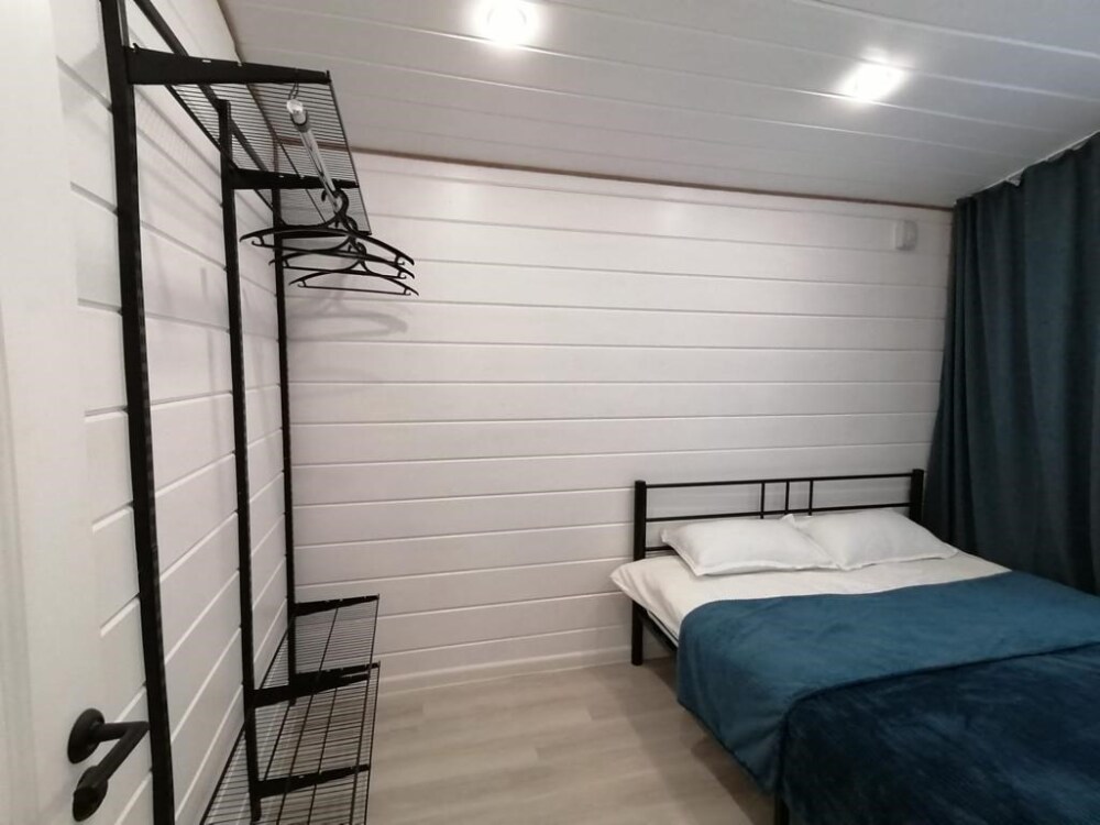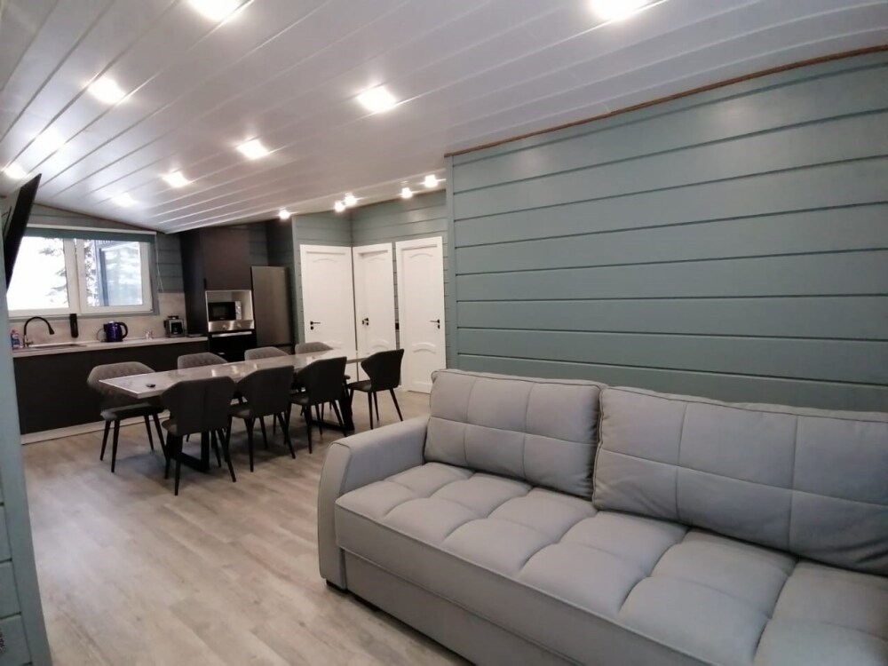 В доме 4 спальных места, прихожая, гостиная-столовая, изолированная спальня с двуспальной кроватью и панорамным окном.
