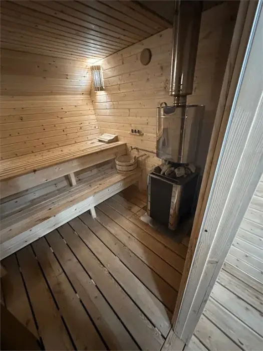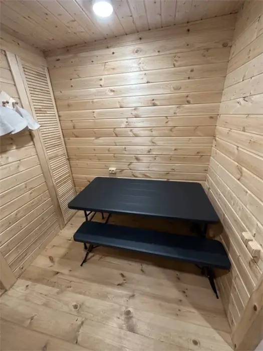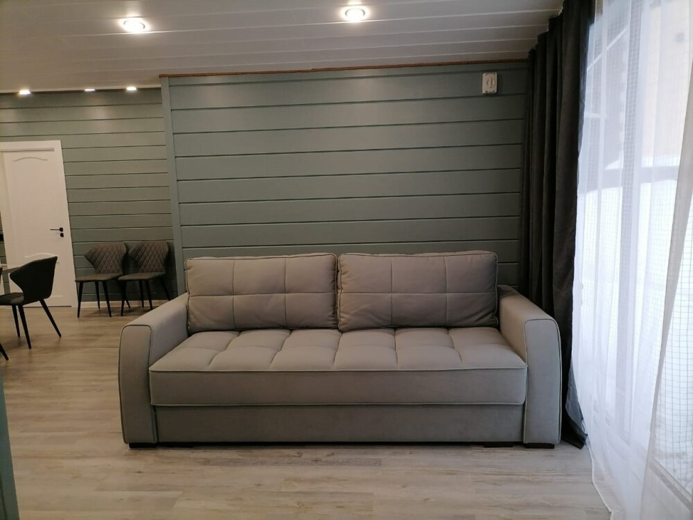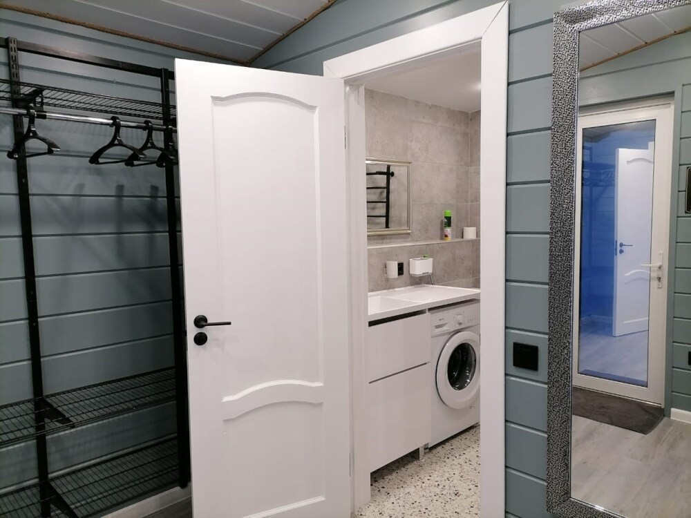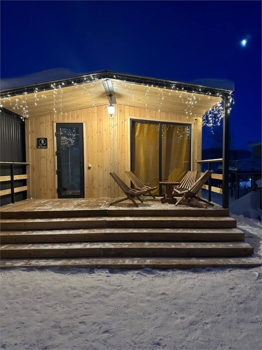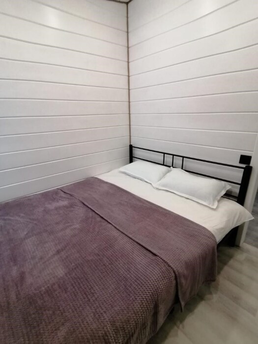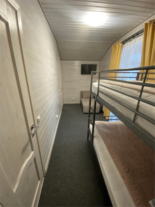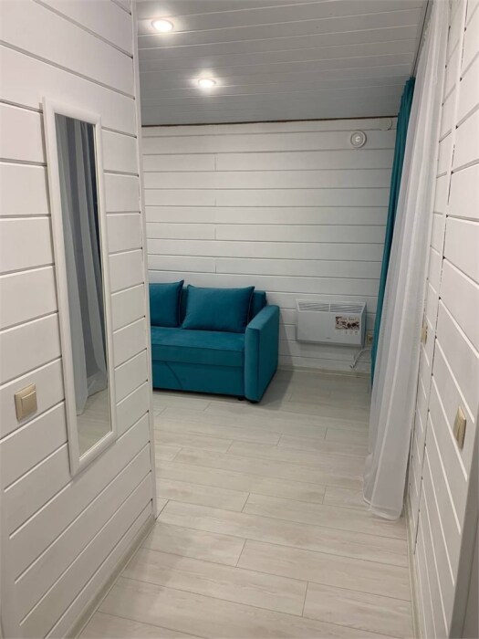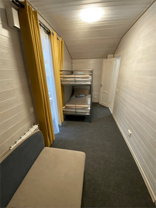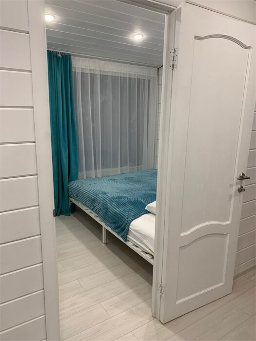 В доме 4 спальных места, прихожая, гостиная-столовая, изолированная спальня с двуспальной кроватью и панорамным окном.