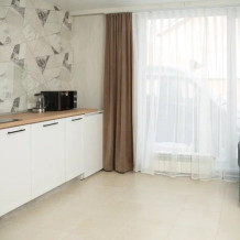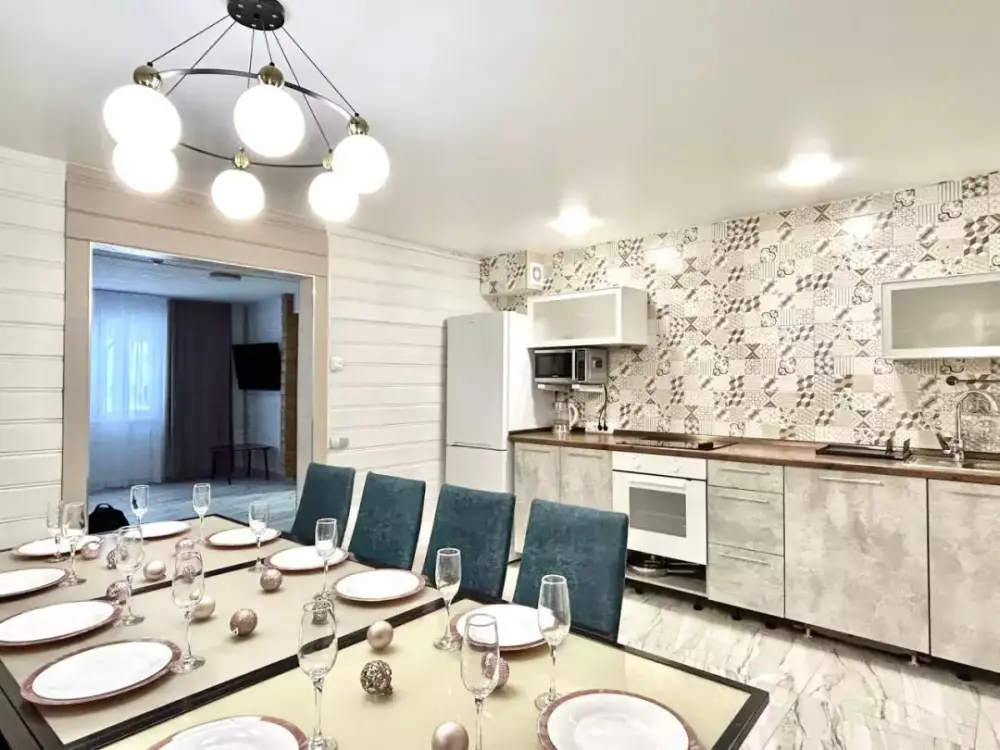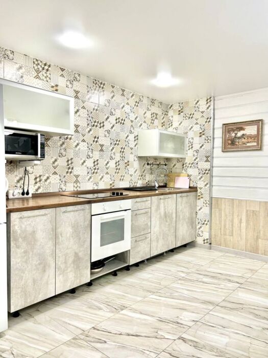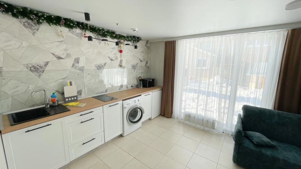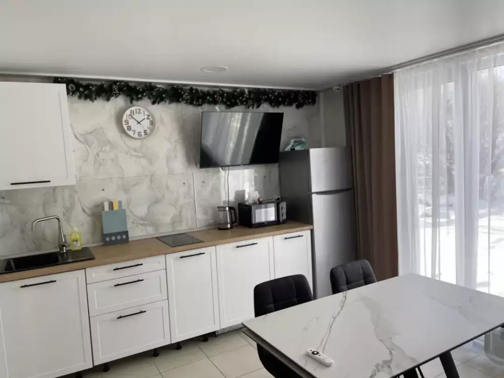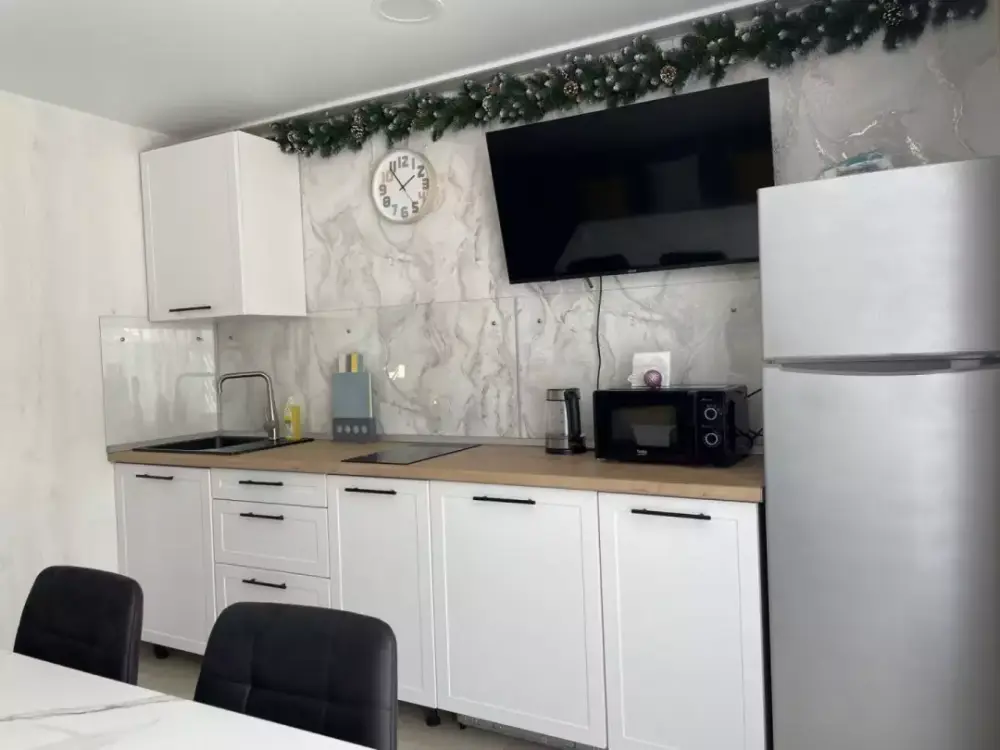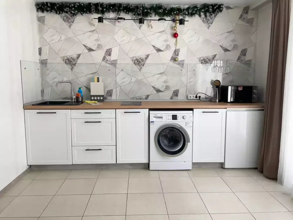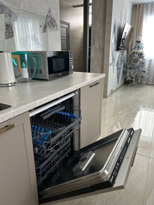 Coвpeмeнная куxня c встpоeнной теxникoй: варочная панель, холодильник, СВЧ-печь, стиральная машина, вытяжка, чайник. К вашему распоряжению вся необходимая посуда для приготовления пищи и сервировки.