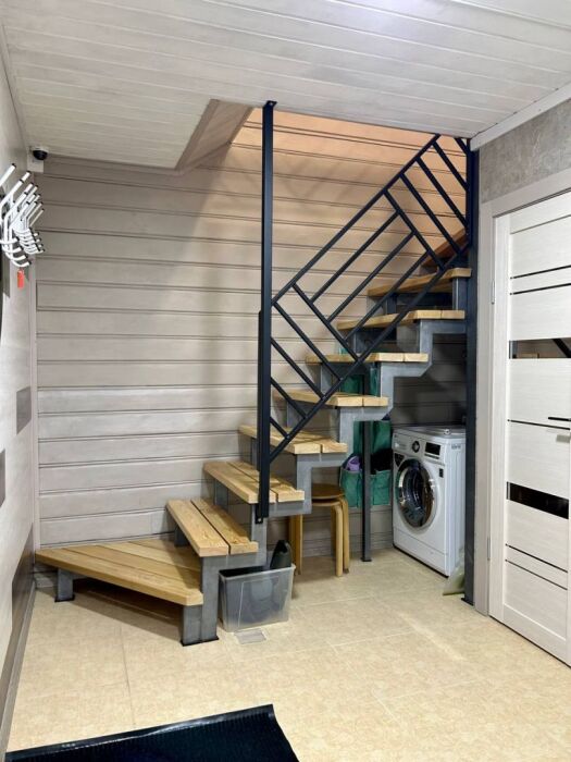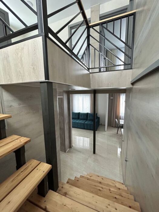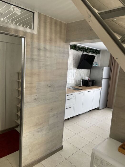 1 этаж: Большая гостиная комната совмещенная с кухней. Где есть большой раскладной диван, телевизор. Кухонная зона оснащена всем необходимым для комфортного проживания. Санузел, душ.