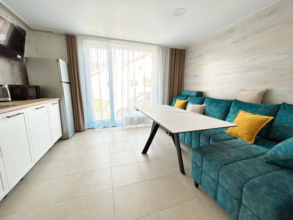 Гостиная с раскладным диваном и кухонной зоной. Спальня с просторной двуспальной кроватью. Санузел и душ.
