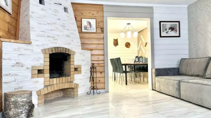 Гостиная с камином и большая кухонная зона