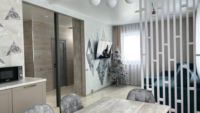 Большая гостиная совмещенная с кухней. Широкий раскладной диван, телевизор.