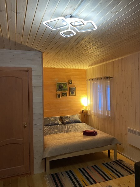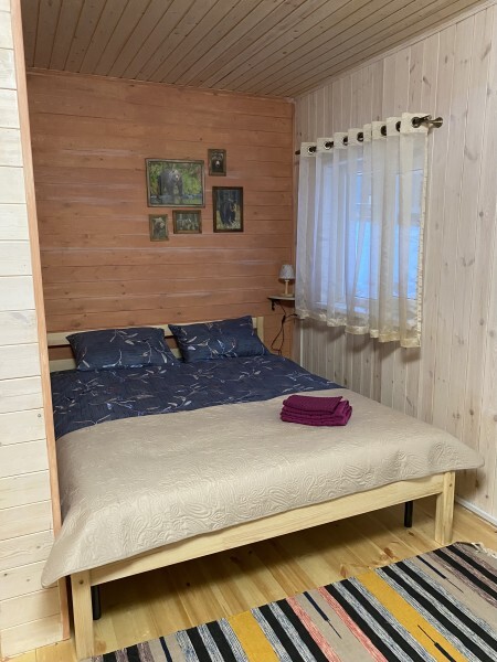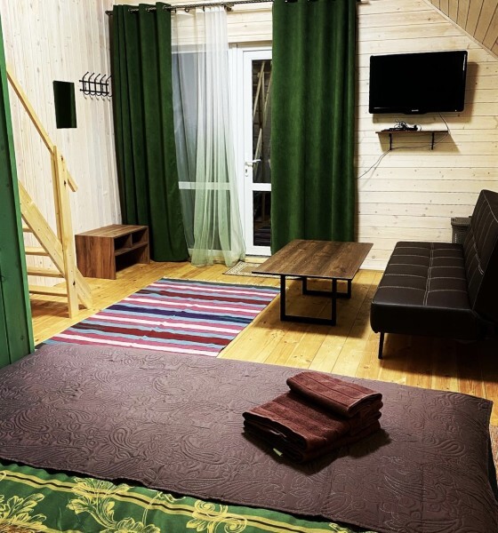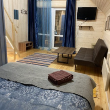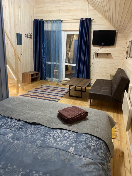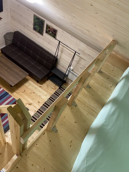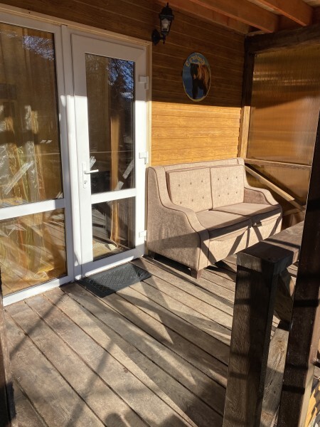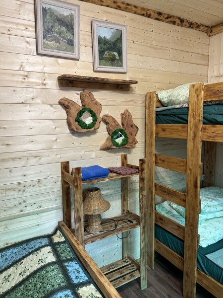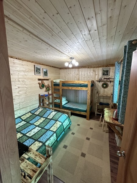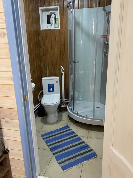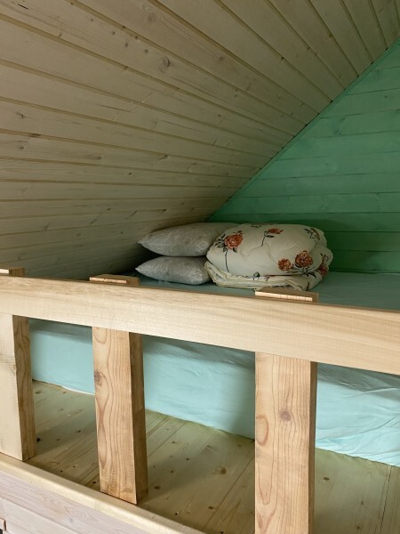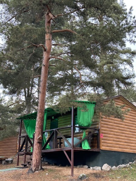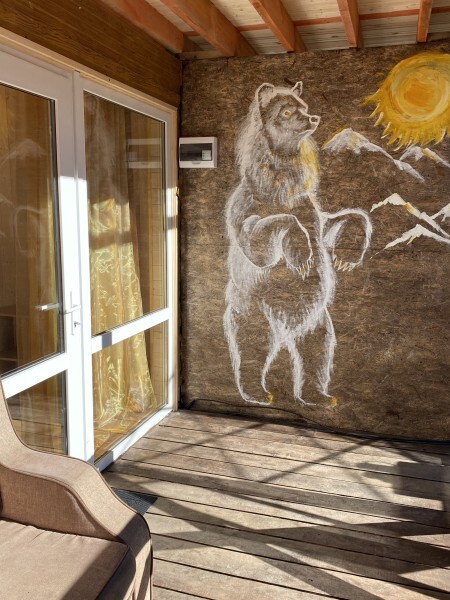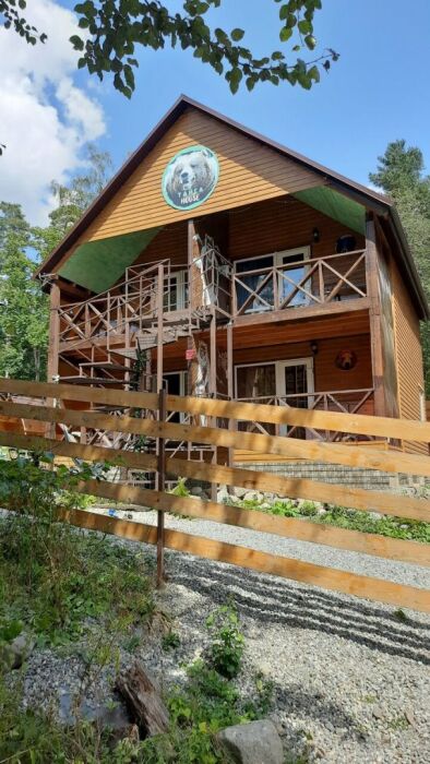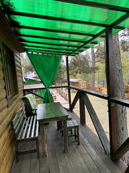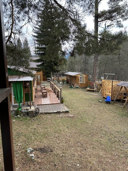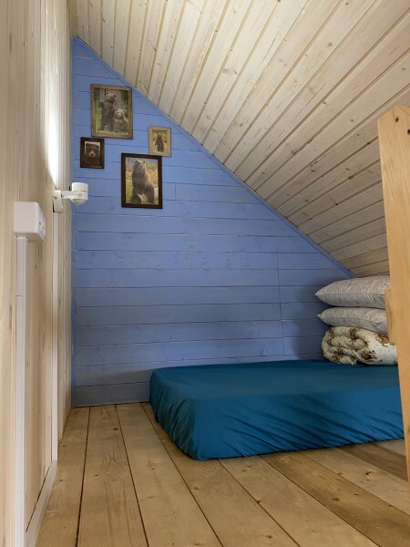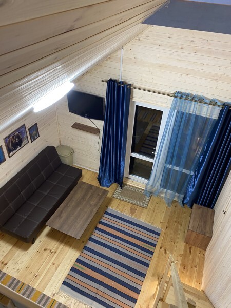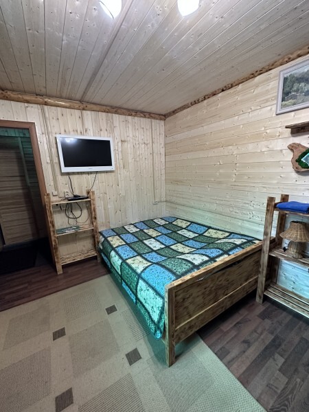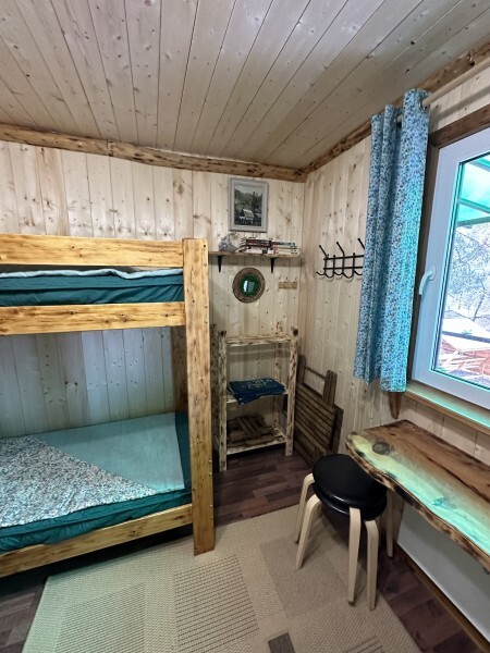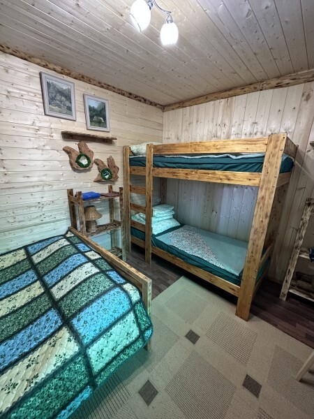 Домик (Берлога 1 и Берлога 2 ). Отдельно стоящий домик с верандой. На веранде стол с лавками. Домик с одной двухспальной кроватью и одной двухъярусной кроватью. В домике телевизор, небольшой холодильник, электрочайник. Постельное белье и полотенца для лица предоставляются. Банные полотенца по запросу. Санузел: душ, туалет, горячая вода бойлер 100л. Отопление электрическое. С веранды домика открывается красивый вид на горы.