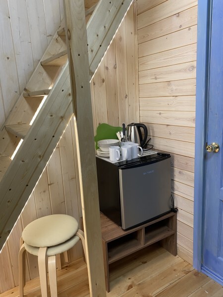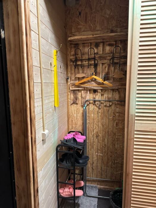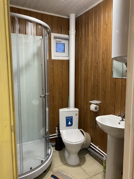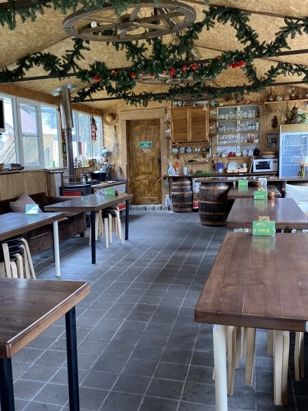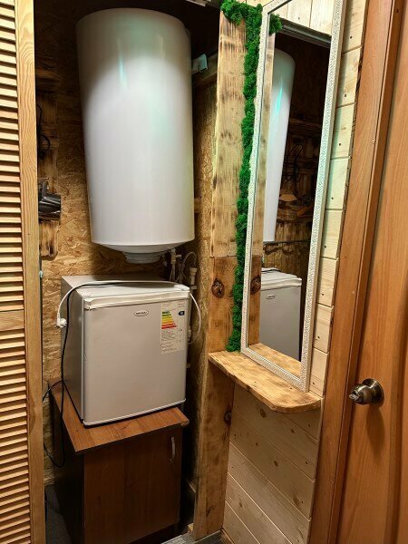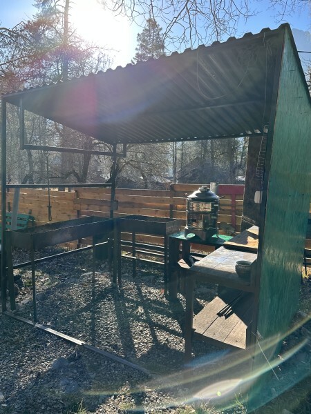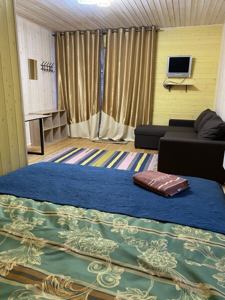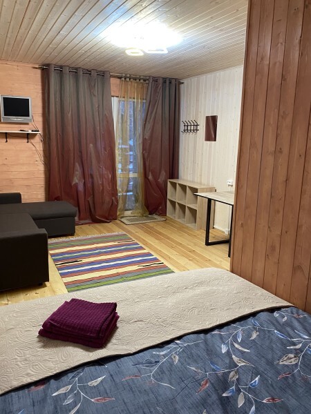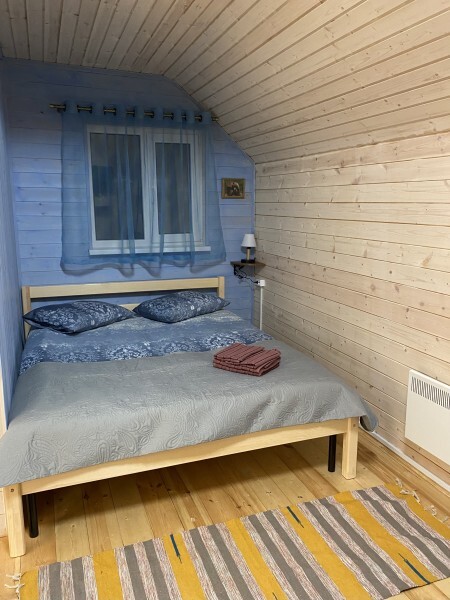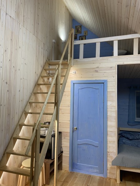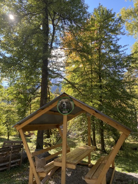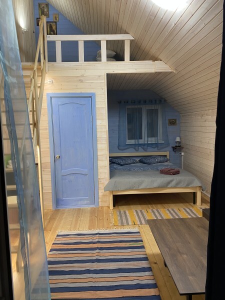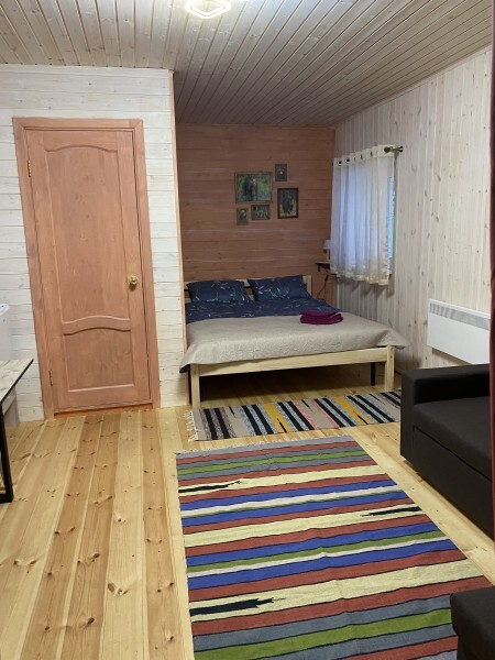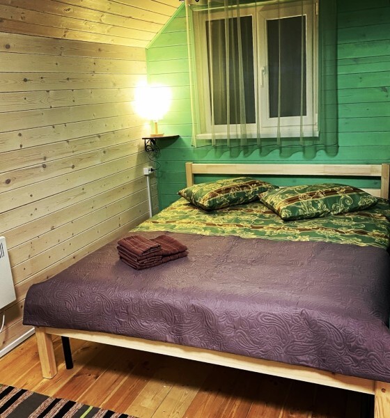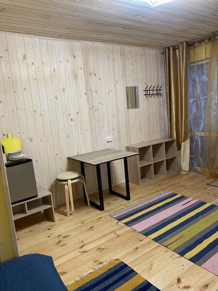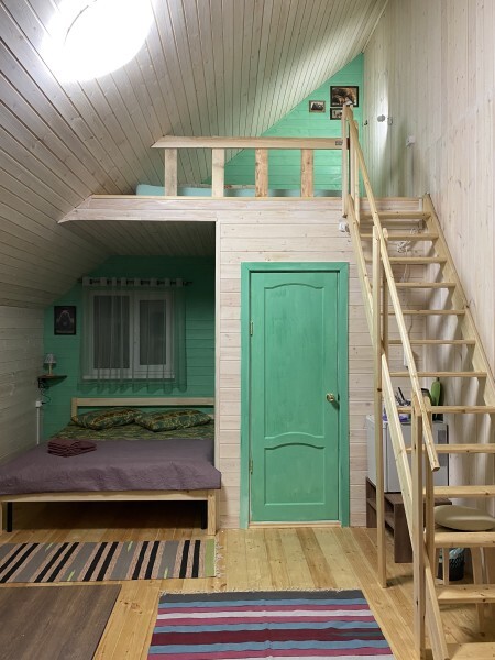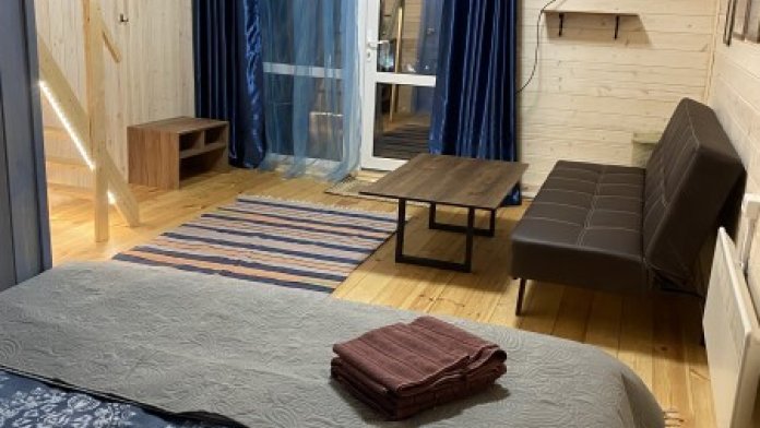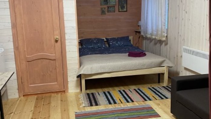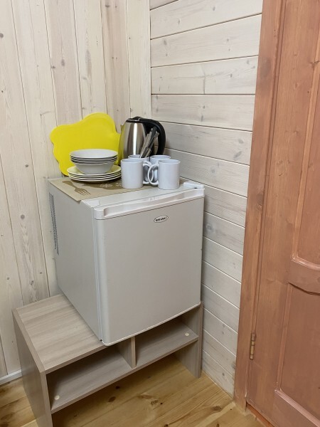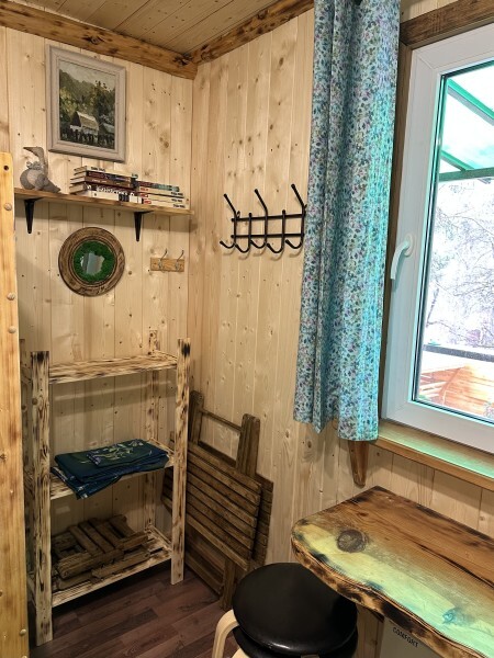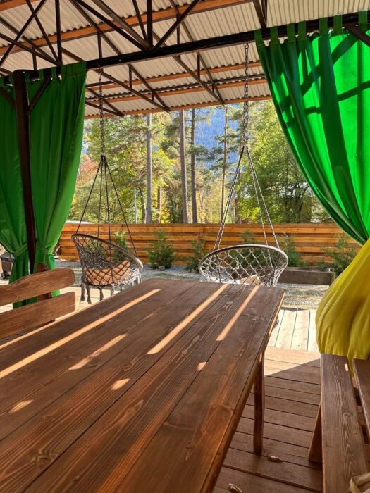 Домик (Берлога 1 и Берлога 2 ). Отдельно стоящий домик с верандой. На веранде стол с лавками. Домик с одной двухспальной кроватью и одной двухъярусной кроватью. В домике телевизор, небольшой холодильник, электрочайник. Постельное белье и полотенца для лица предоставляются. Банные полотенца по запросу. Санузел: душ, туалет, горячая вода бойлер 100л. Отопление электрическое. С веранды домика открывается красивый вид на горы.