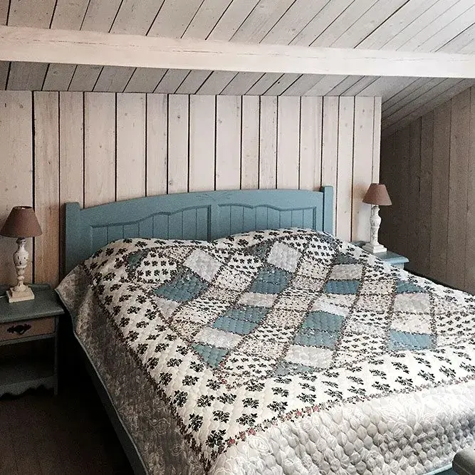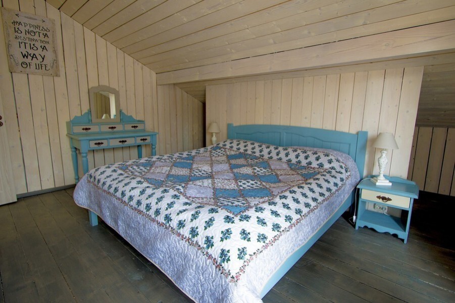 Интерьер в стиле «прованс» — светлый, натуральный, пастельный. Деревянные стены с трещинками, терракотовая плитка в санузле, только натуральные материалы. Мебель с коваными элементами, крючки, подставки из керамики, фарфора, дерева , настенные натюрморты из картона, часы с росписью, подсвечники, полочки, зеркала в простых крашеных рамах, текстиль в деревенской манере.