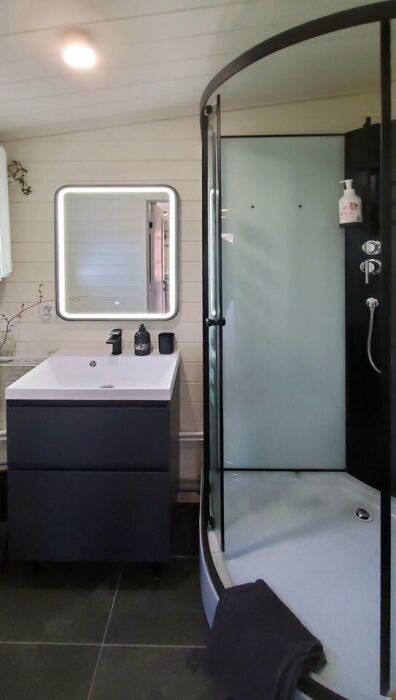 - Современный санузел: душевая кабина, унитаз, раковина, фен, жидкое мыло;