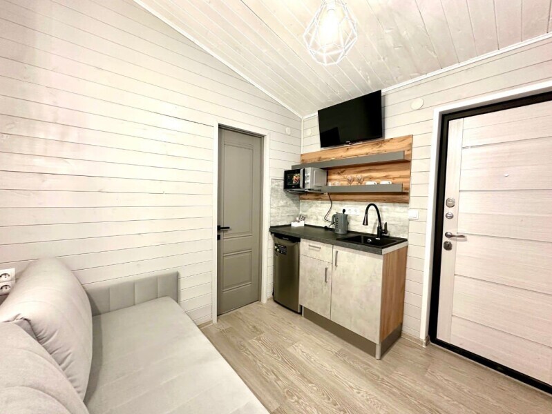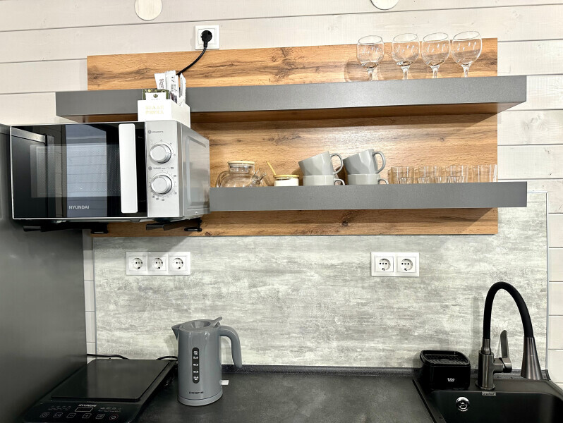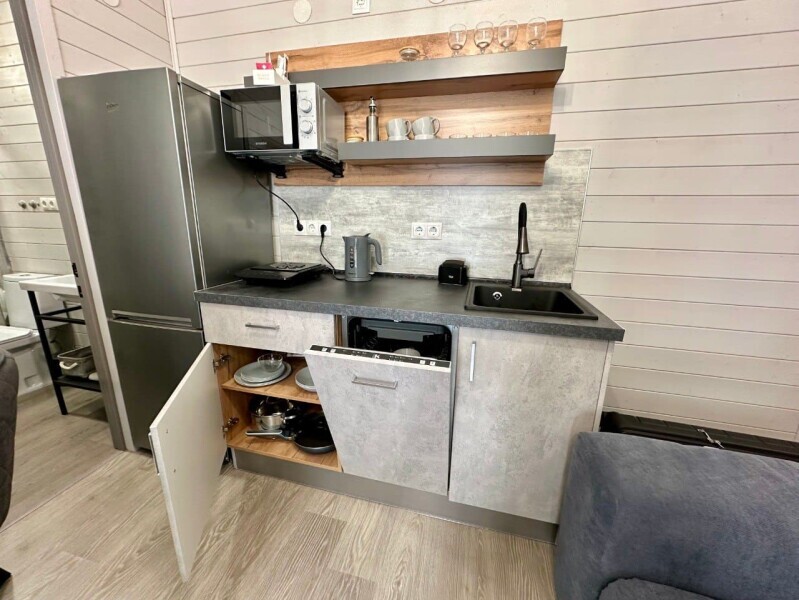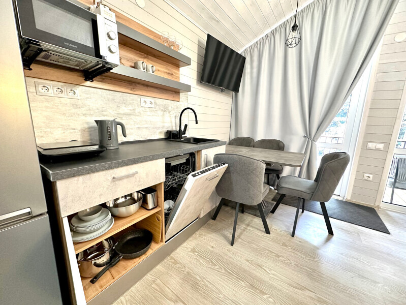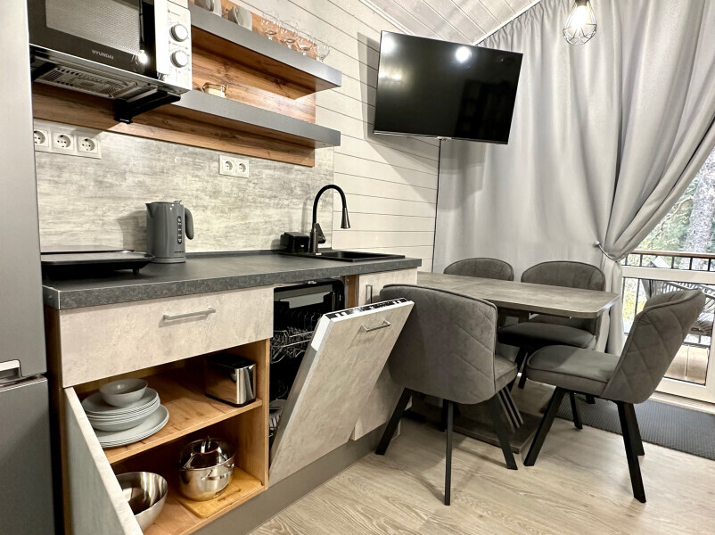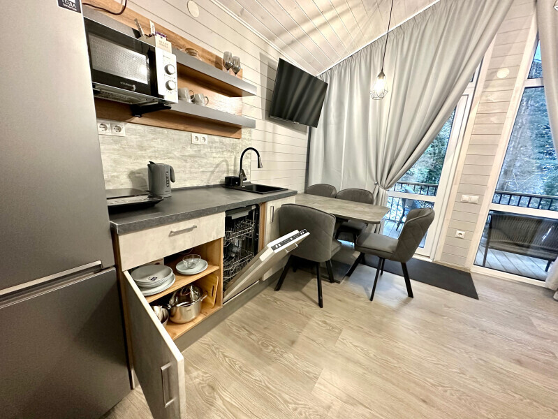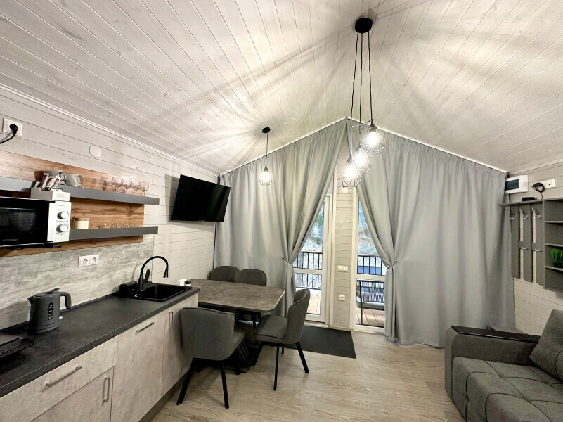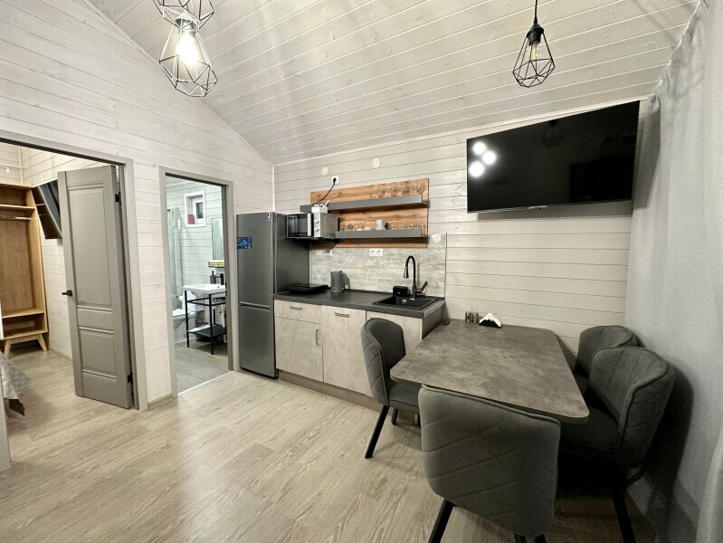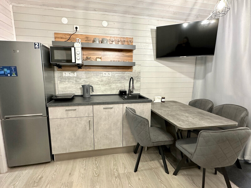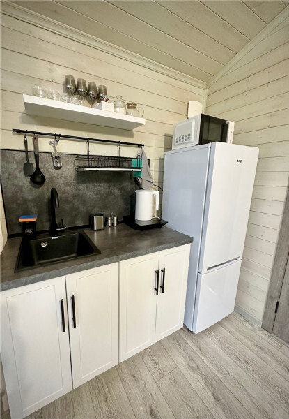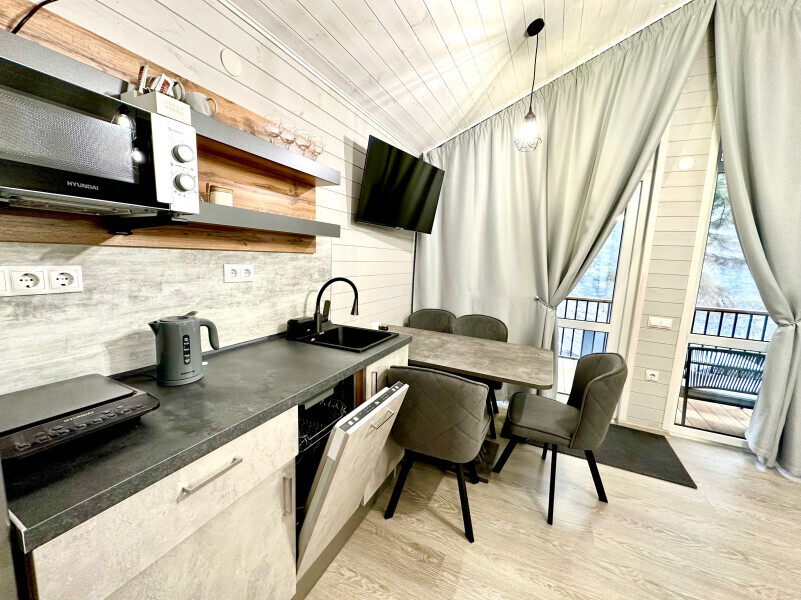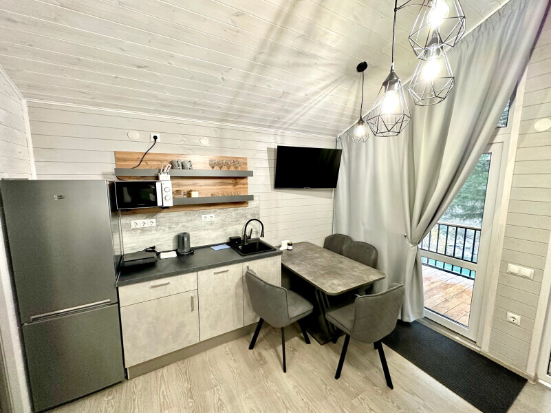 колонкой «Алиса»; Smart TV; санузлом, с большой душевой кабиной, бойлером, феном, полотенцами, банными принадлежностями и средствами личной гигиены; кухней, холодильником, микроволновой печью, электроплитой, чайником, посудой; чайной станцией и питьевой водой из артезианской скважины; собственной мангальной зоной; шампуры, решетки для мангала (у администратора по запросу бесплатно).