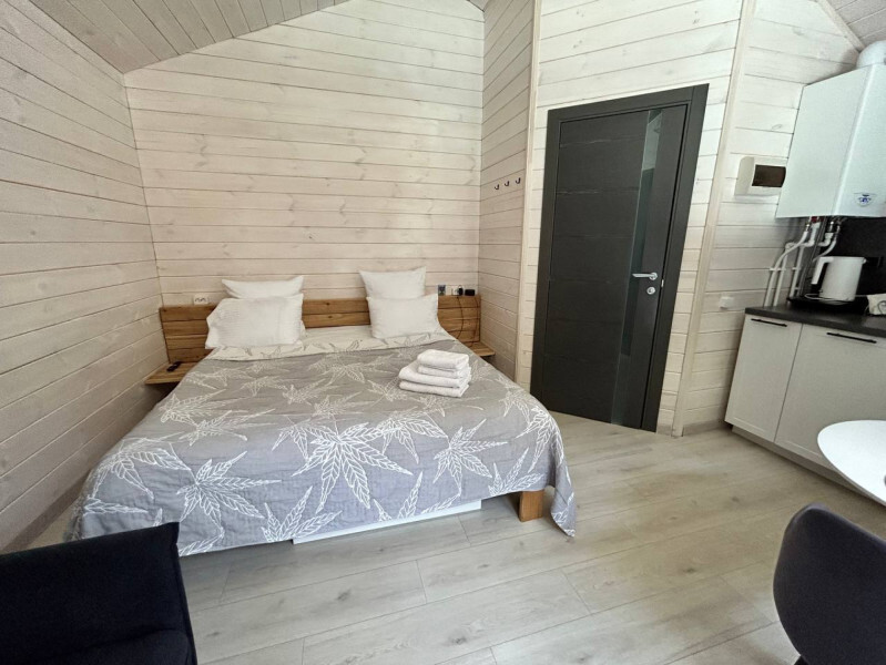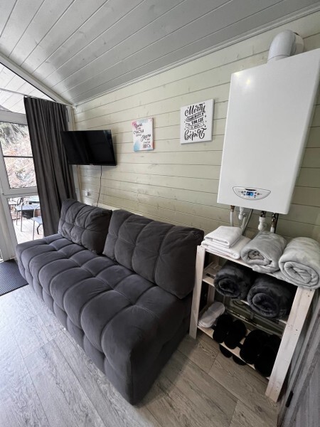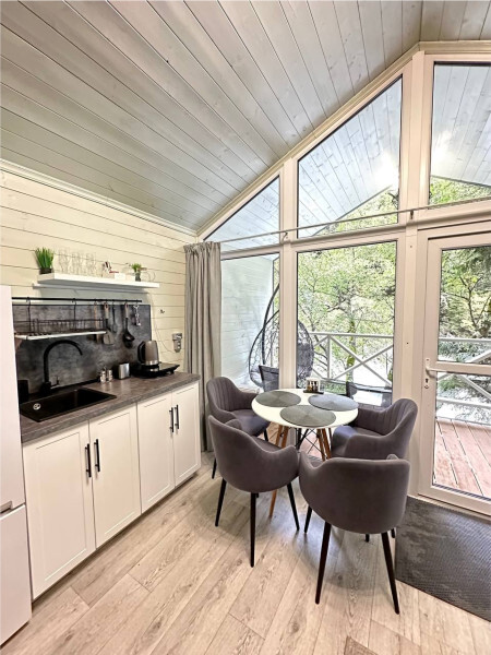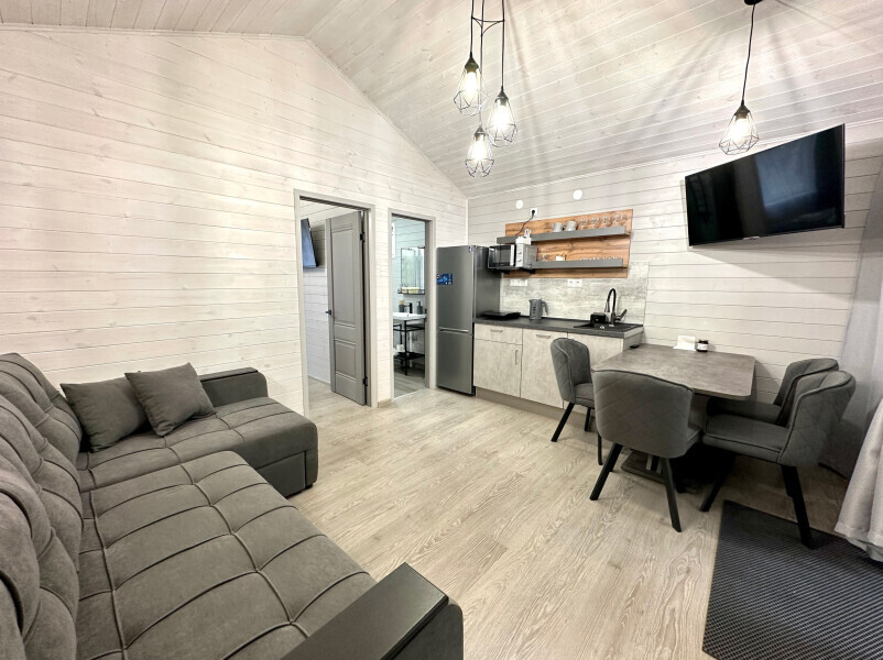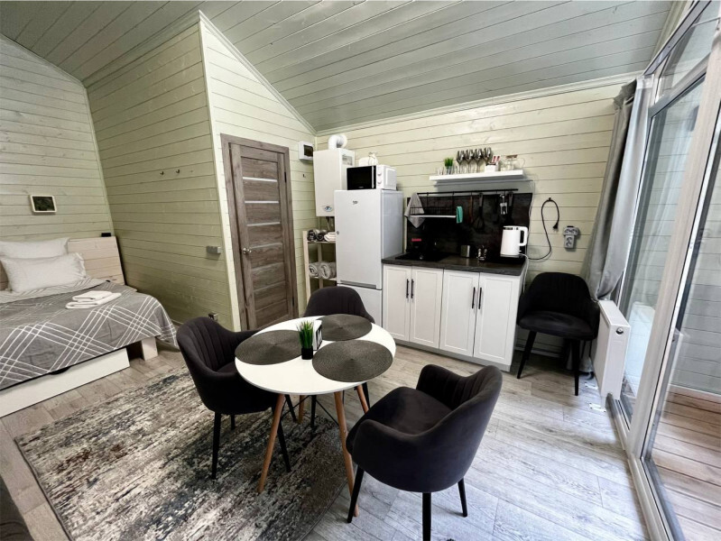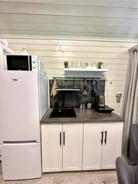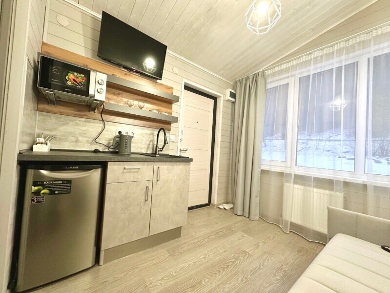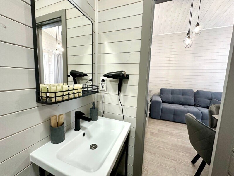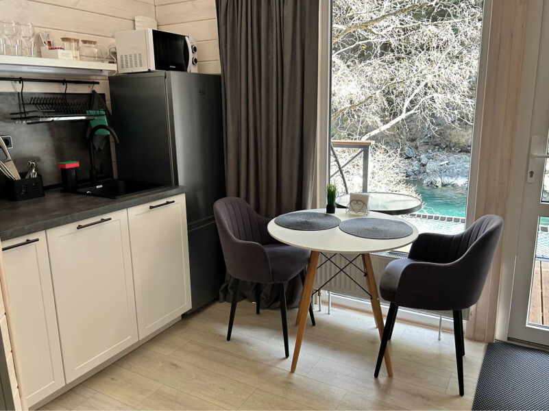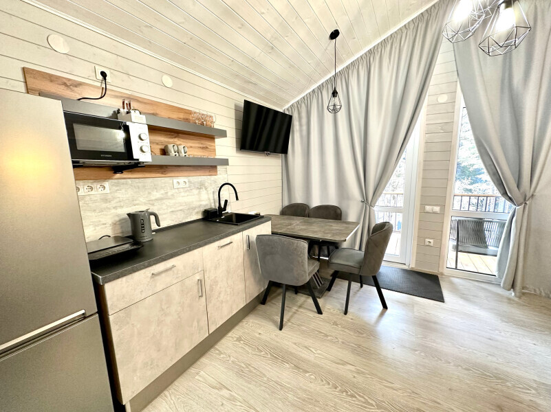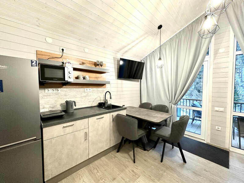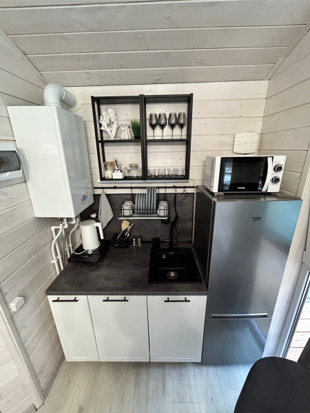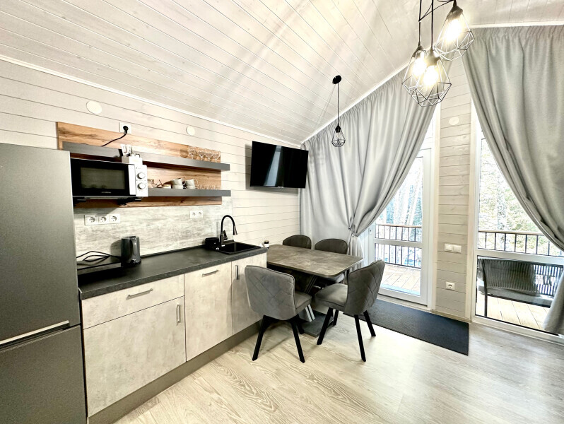 колонкой «Алиса»; Smart TV; санузлом, с большой душевой кабиной, бойлером, феном, полотенцами, банными принадлежностями и средствами личной гигиены; кухней, холодильником, микроволновой печью, электроплитой, чайником, посудой; чайной станцией и питьевой водой из артезианской скважины; собственной мангальной зоной; шампуры, решетки для мангала (у администратора по запросу бесплатно).