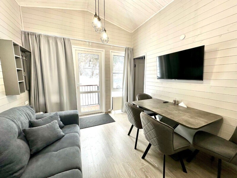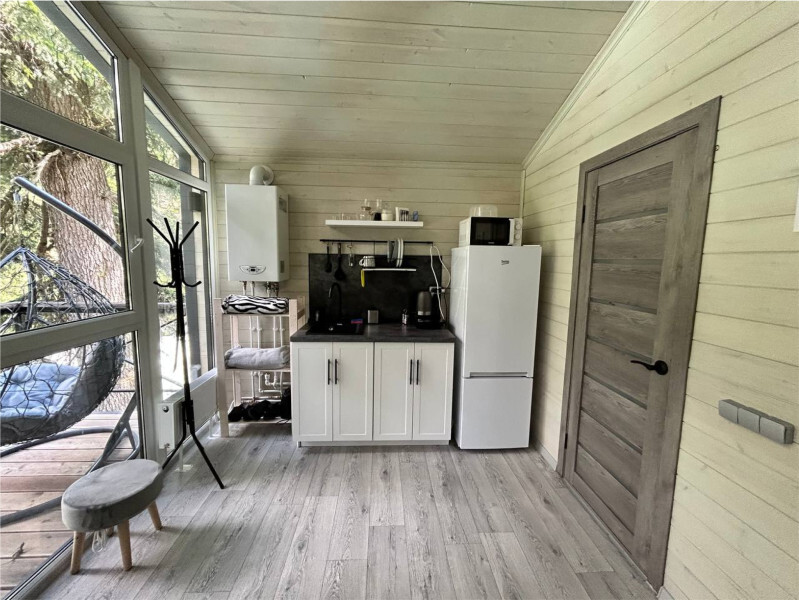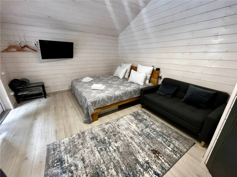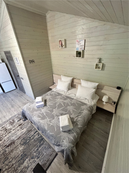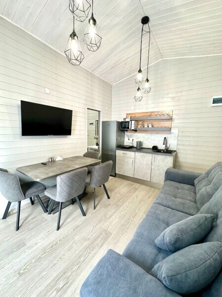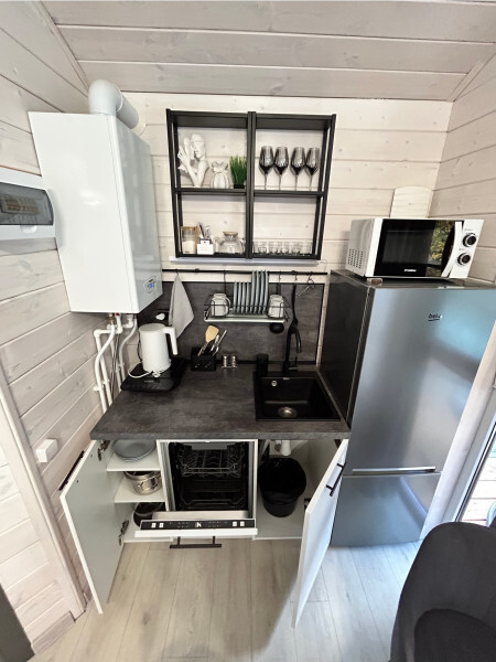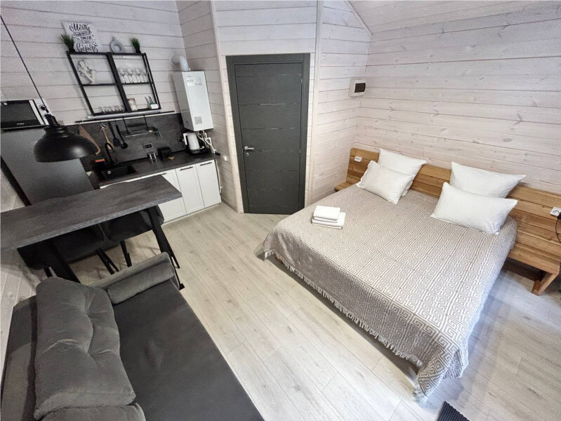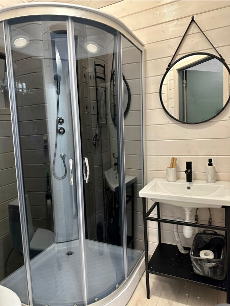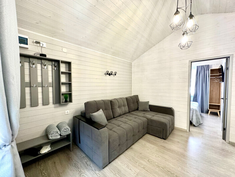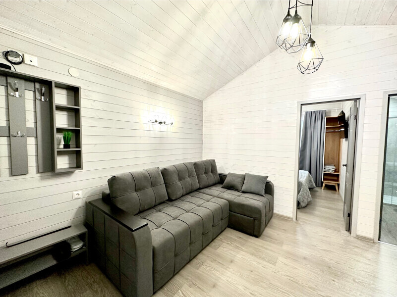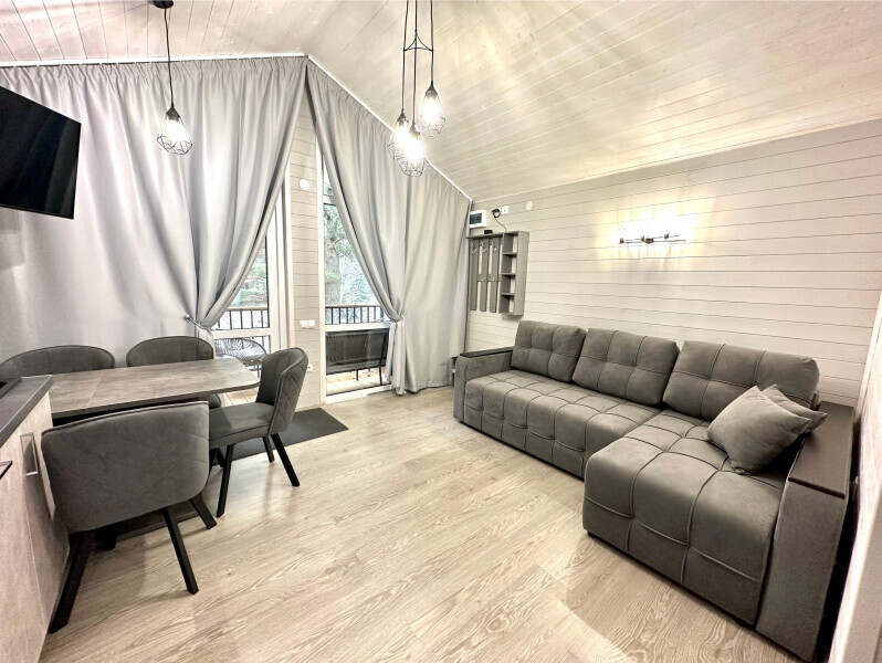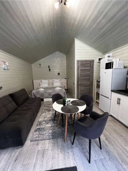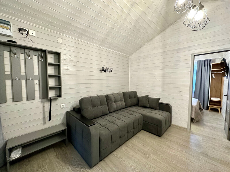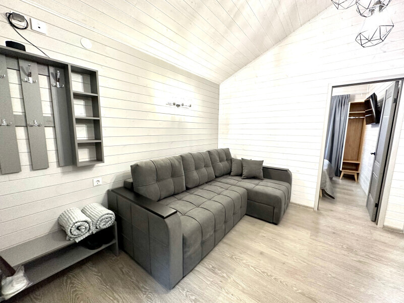 колонкой «Алиса»; Smart TV; санузлом, с большой душевой кабиной, бойлером, феном, полотенцами, банными принадлежностями и средствами личной гигиены; кухней, холодильником, микроволновой печью, электроплитой, чайником, посудой; чайной станцией и питьевой водой из артезианской скважины; собственной мангальной зоной; шампуры, решетки для мангала (у администратора по запросу бесплатно).