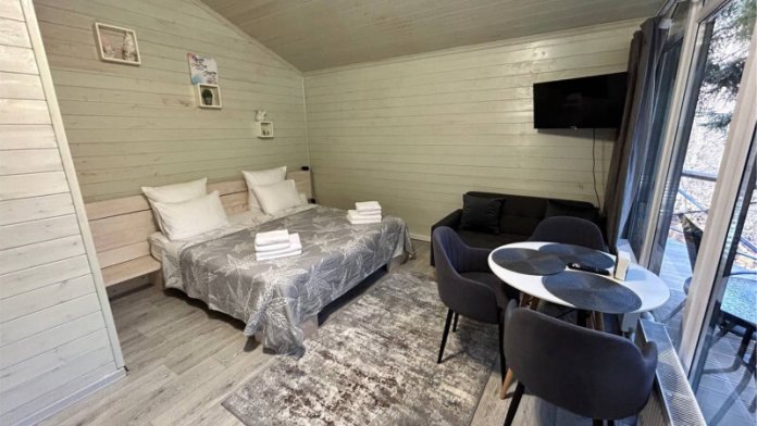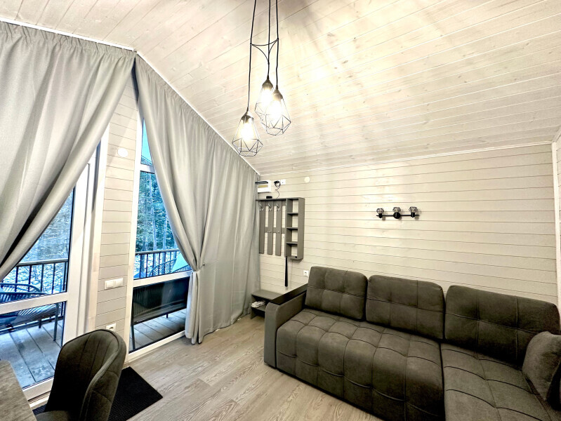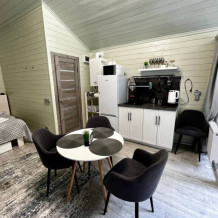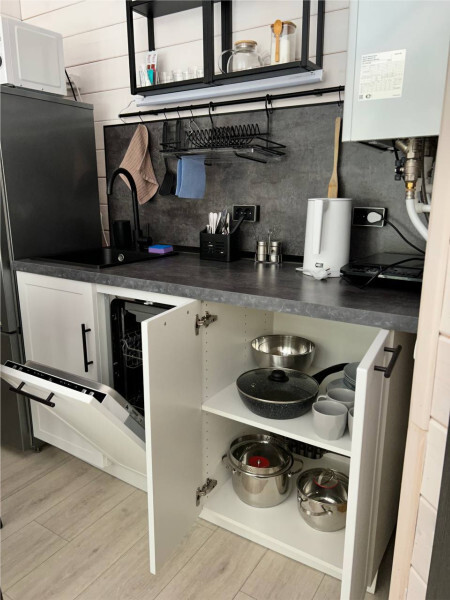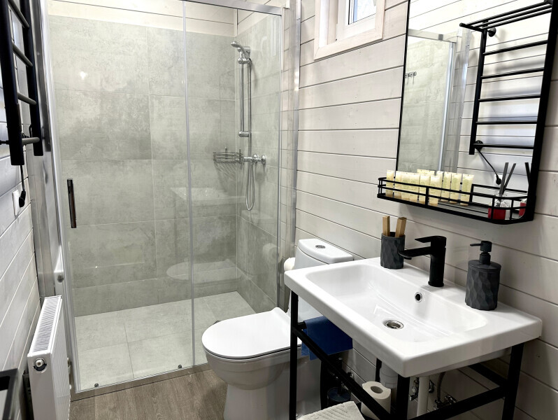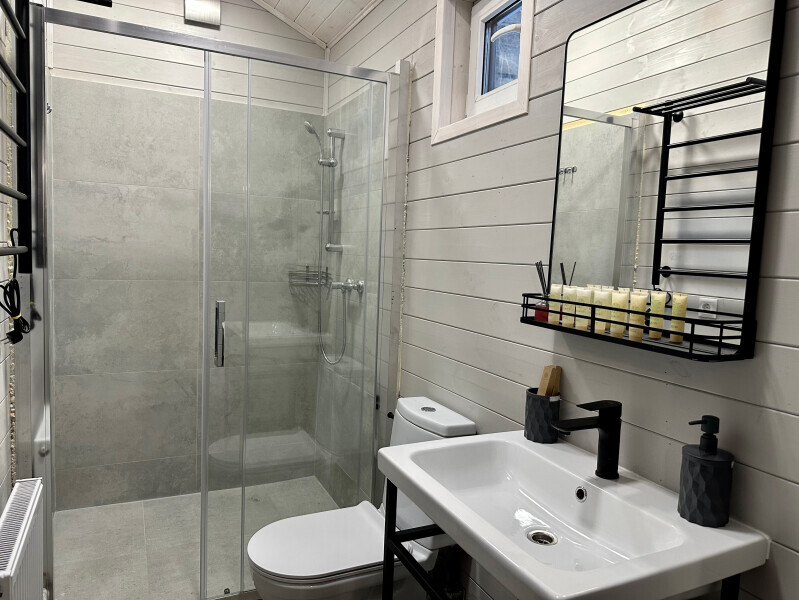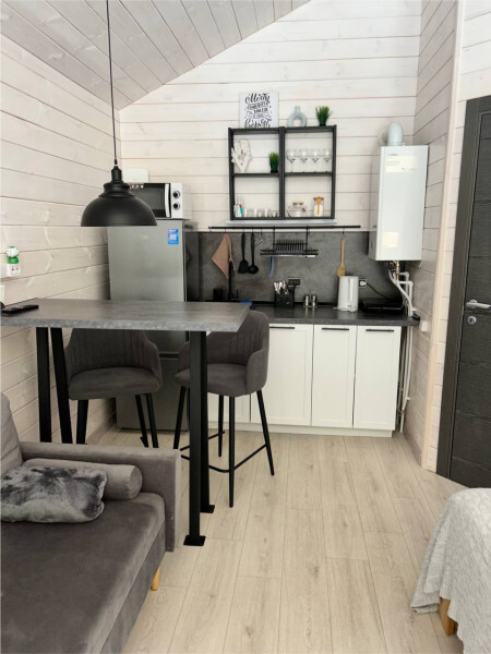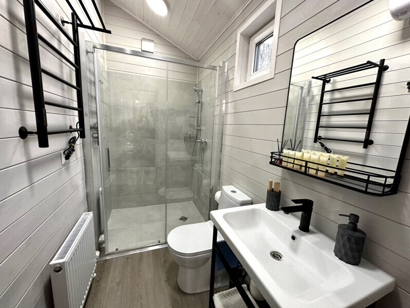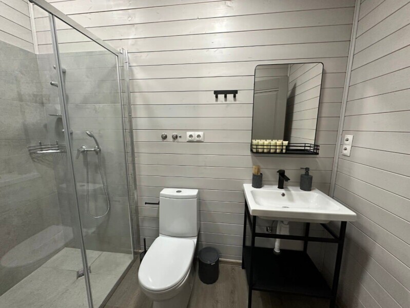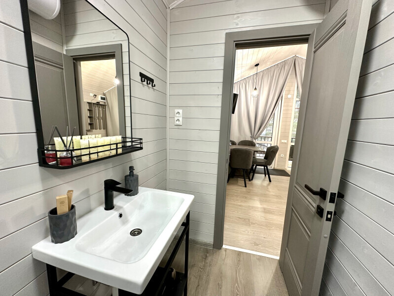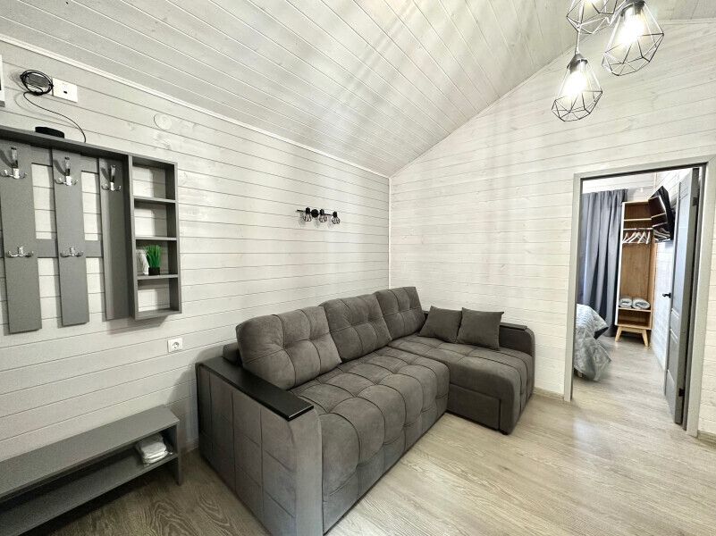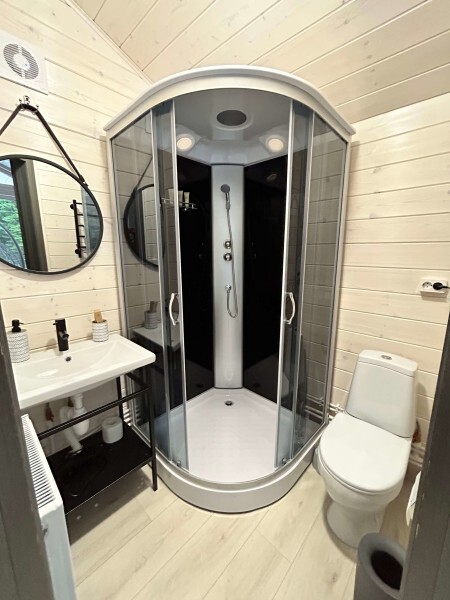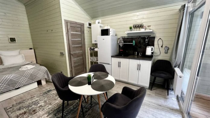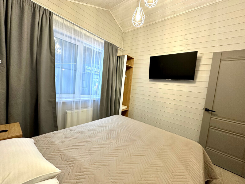 колонкой «Алиса»; Smart TV; санузлом, с большой душевой кабиной, бойлером, феном, полотенцами, банными принадлежностями и средствами личной гигиены; кухней, холодильником, микроволновой печью, электроплитой, чайником, посудой; чайной станцией и питьевой водой из артезианской скважины; собственной мангальной зоной; шампуры, решетки для мангала (у администратора по запросу бесплатно).