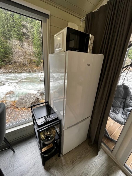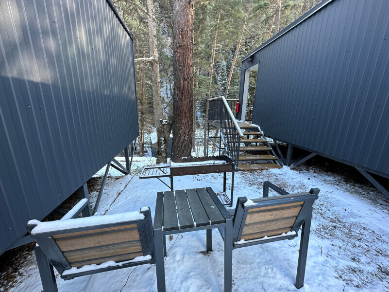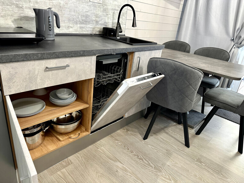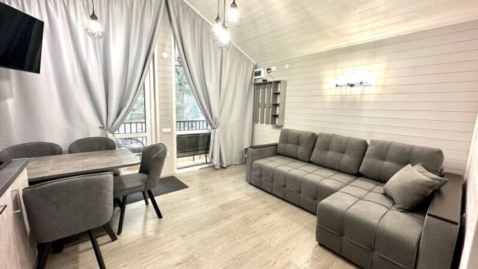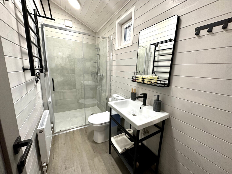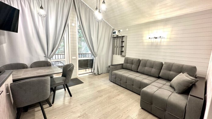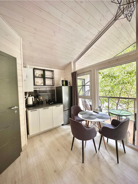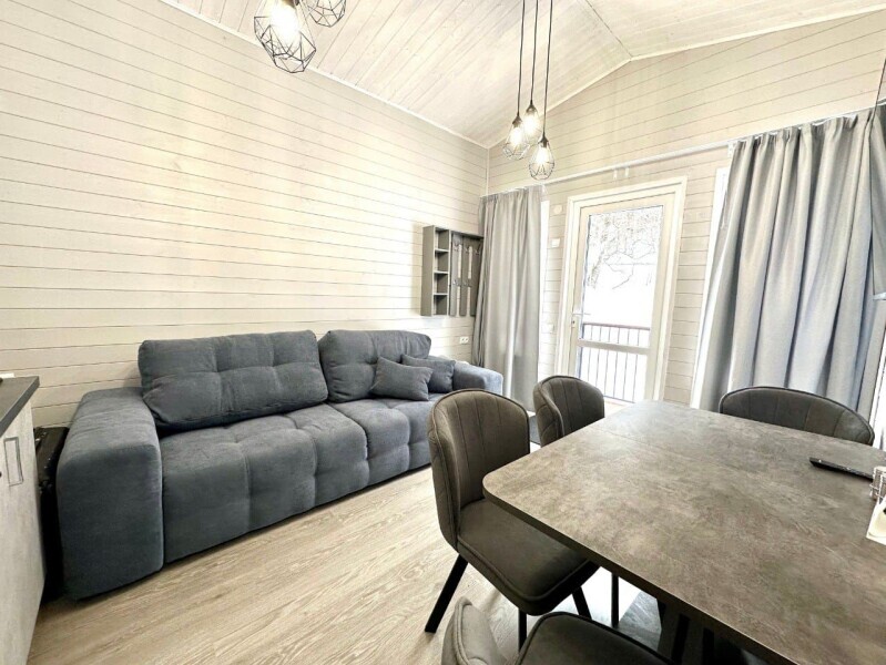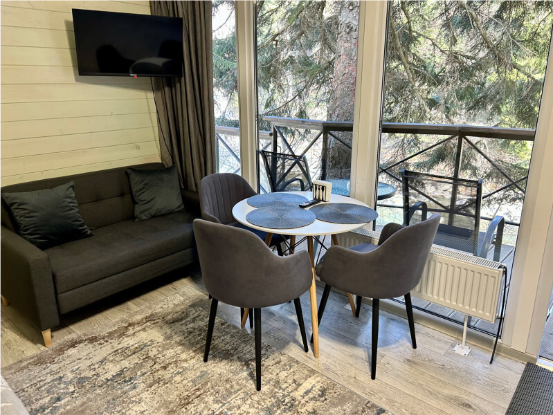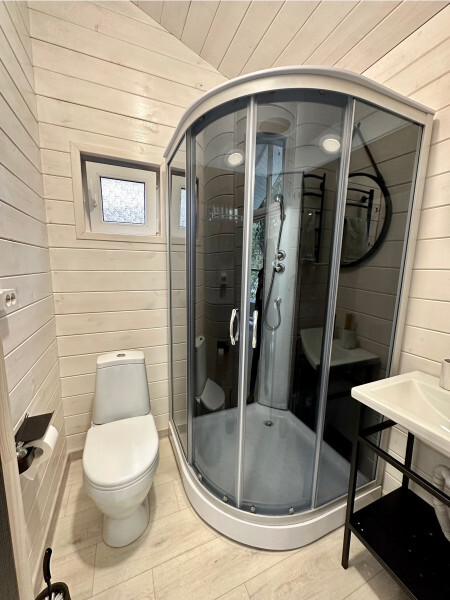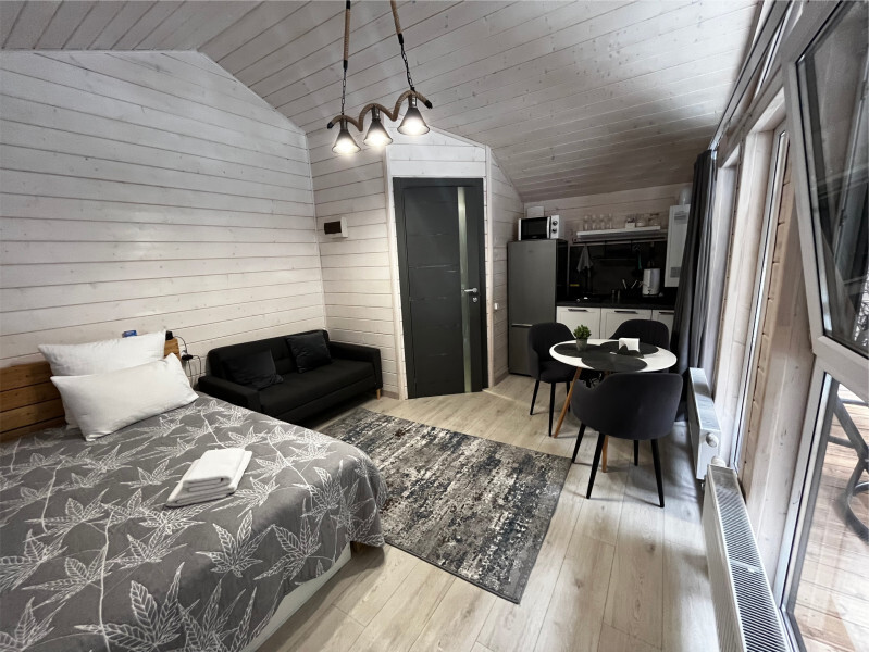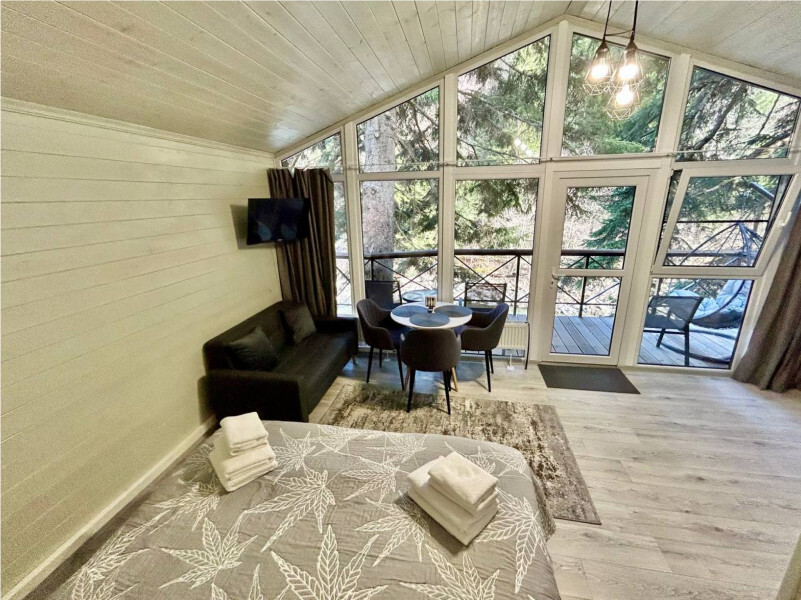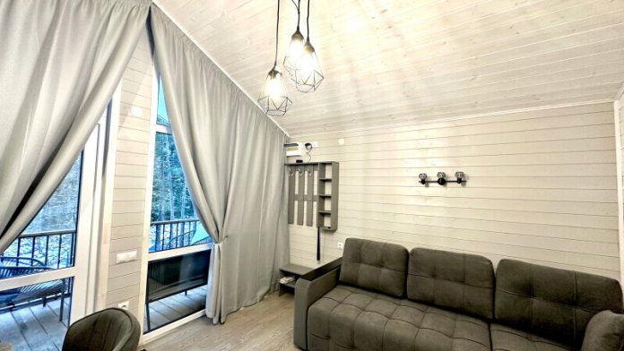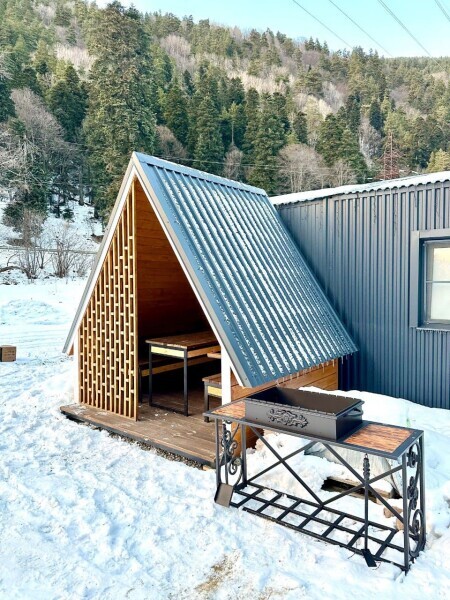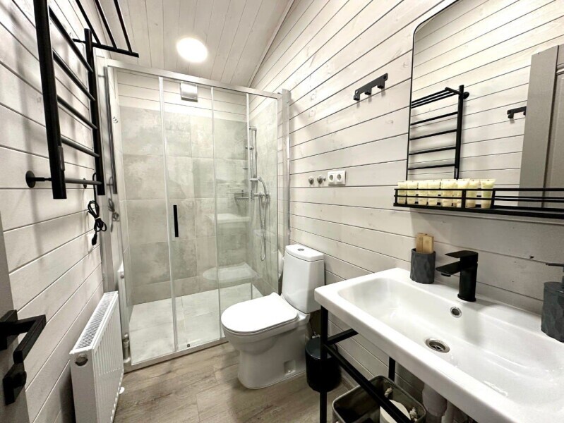 колонкой «Алиса»; Smart TV; санузлом, с большой душевой кабиной, бойлером, феном, полотенцами, банными принадлежностями и средствами личной гигиены; кухней, холодильником, микроволновой печью, электроплитой, чайником, посудой; чайной станцией и питьевой водой из артезианской скважины; собственной мангальной зоной; шампуры, решетки для мангала (у администратора по запросу бесплатно).