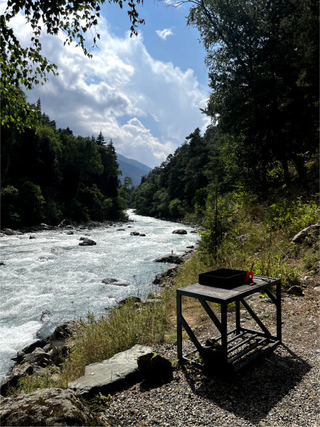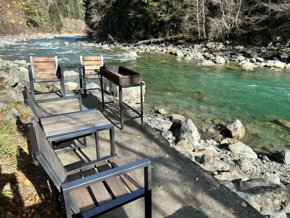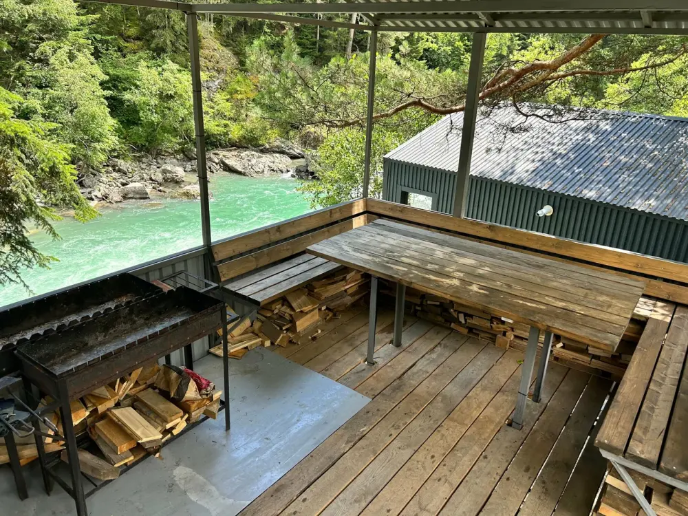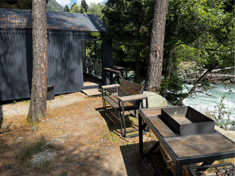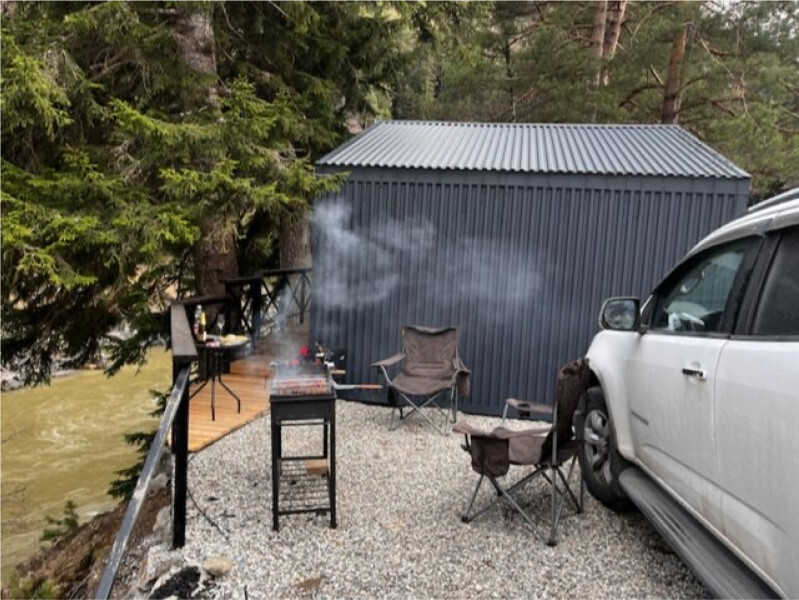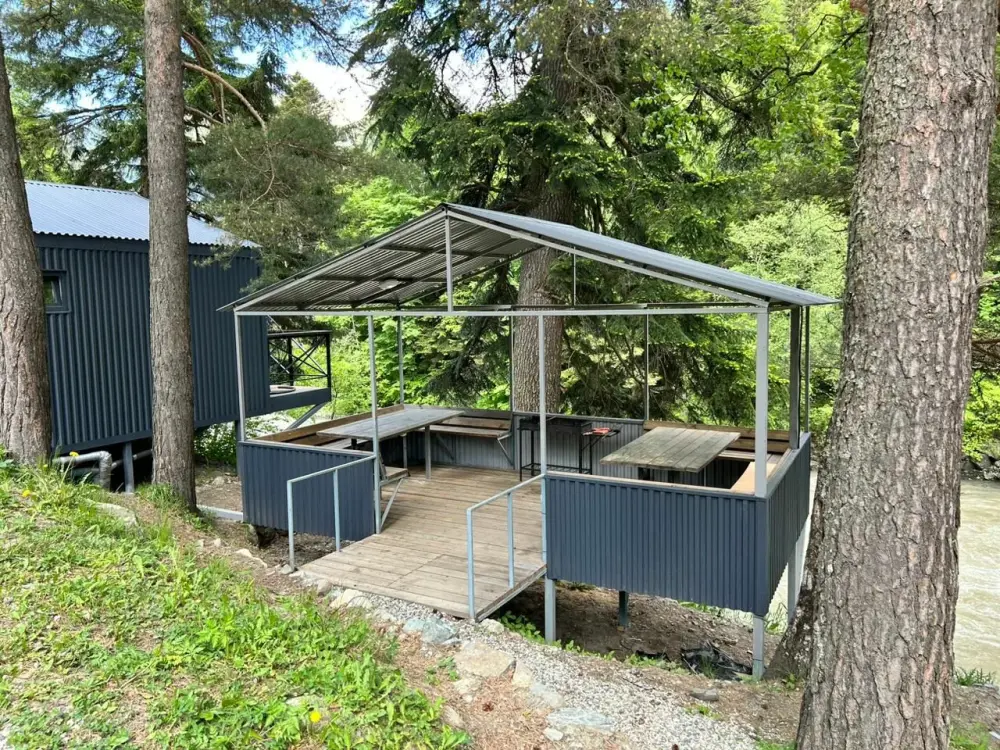 - Большую крытую беседку с мангалом на 20 человек на берегу реки;