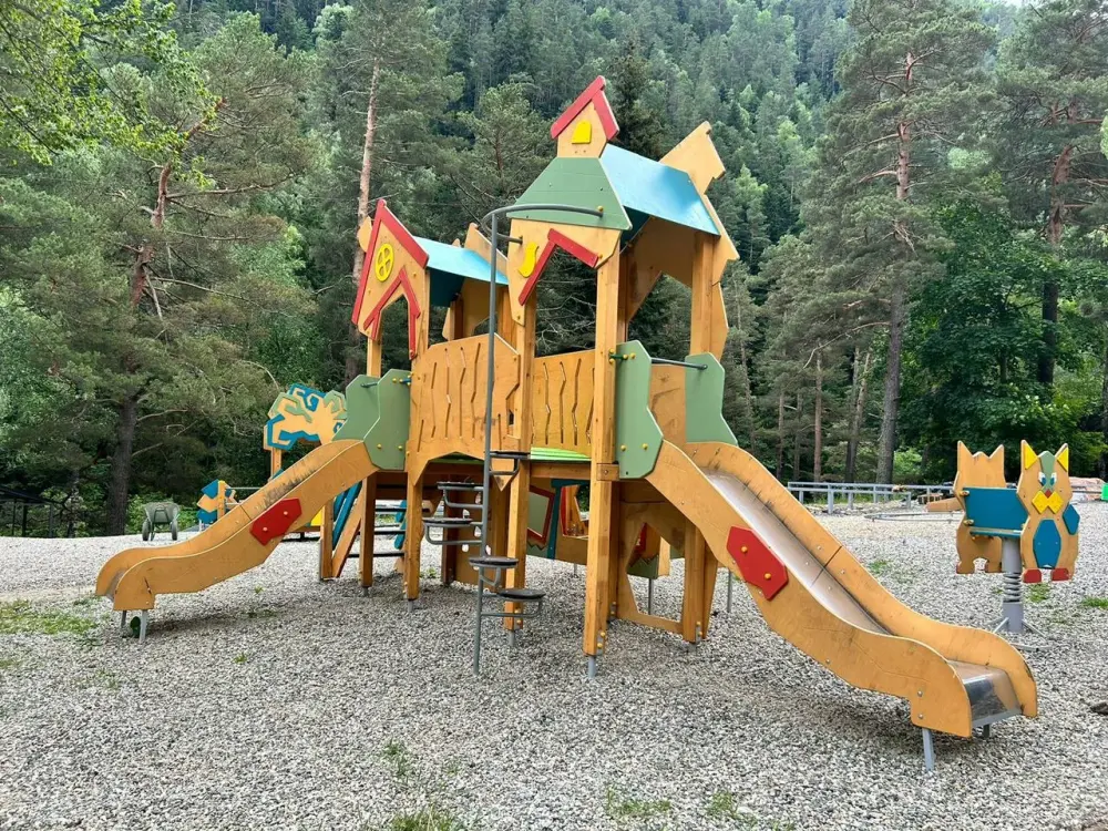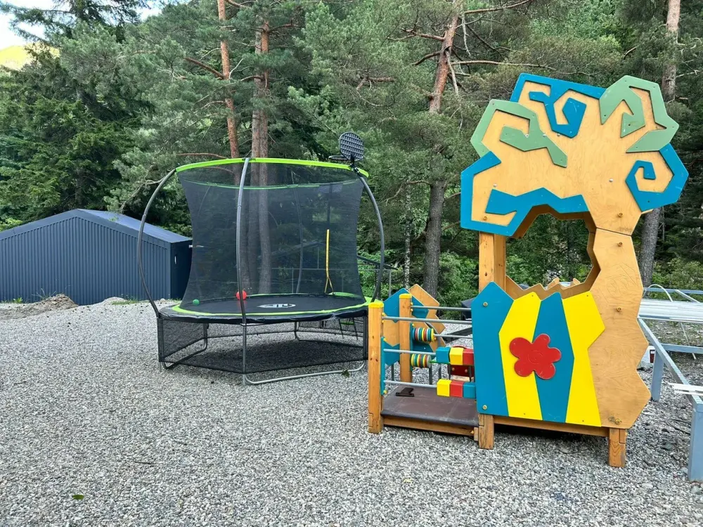 - Большую оборудованную детскую игровую зону с горкой, батутом и песочницей;