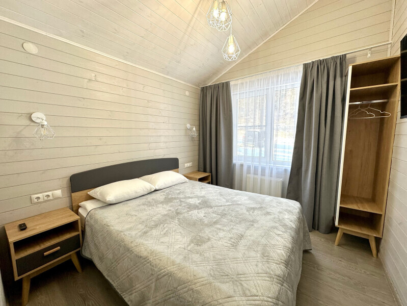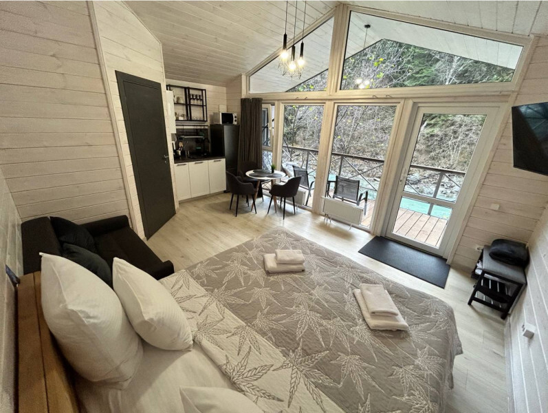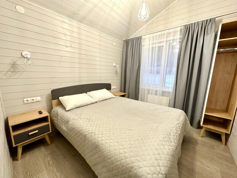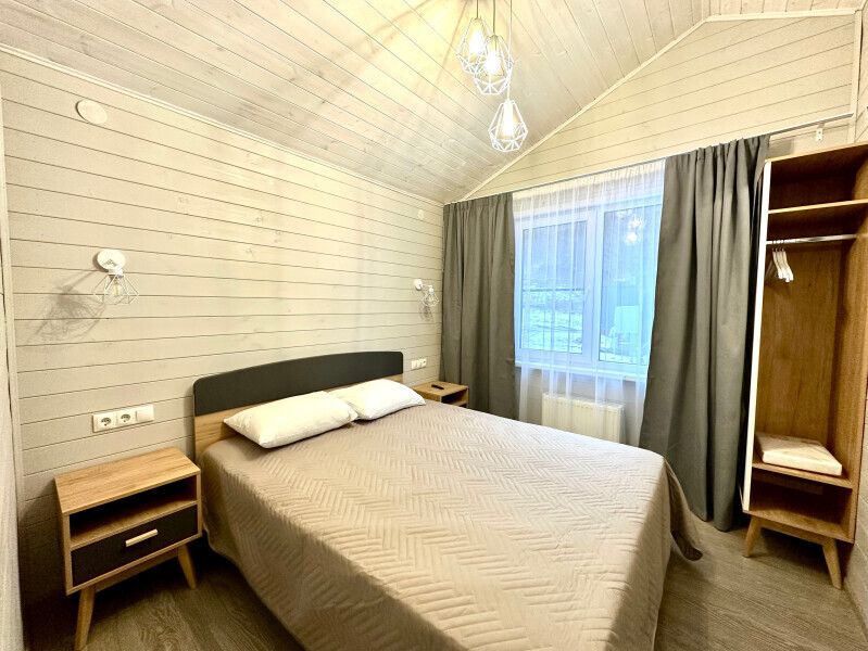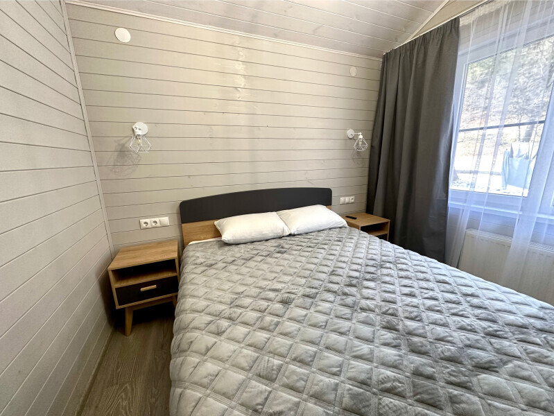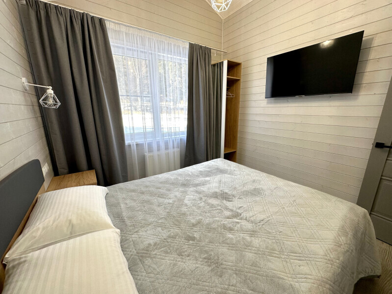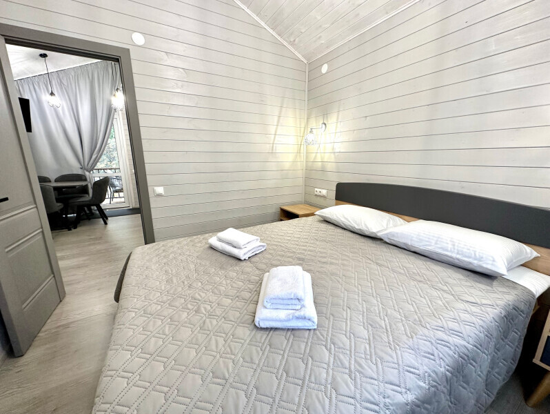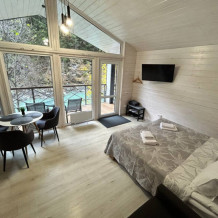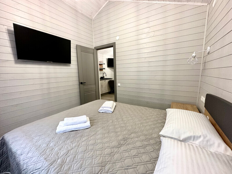 Дом 2-комнатный оснащен: крытой террасой с видом на реку; 2-спальной кроватью с хорошим ортопедическим матрасом (160х200); раскладным диваном (160х200); качественным постельным бельем, подушками и одеялом; колонкой «Алиса»; Smart TV; санузлом с бойлером, феном, полотенцами, банными принадлежностями и средствами личной гигиены; кухней, холодильником, микроволновой печью, электроплитой, чайником, посудой; чайной станцией и питьевой водой из артезианской скважины; собственной мангальной зоной; шампуры, решетки для мангала (у администратора по запросу бесплатно).
