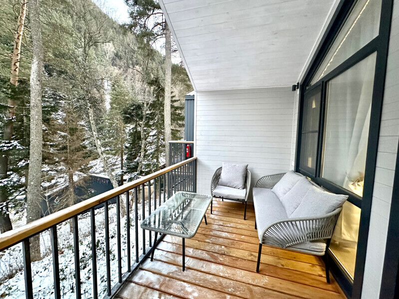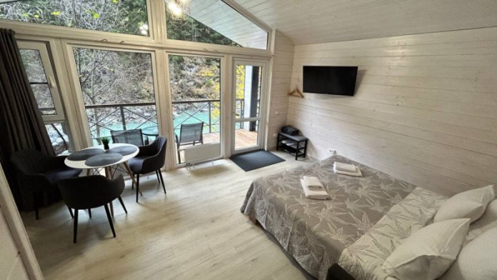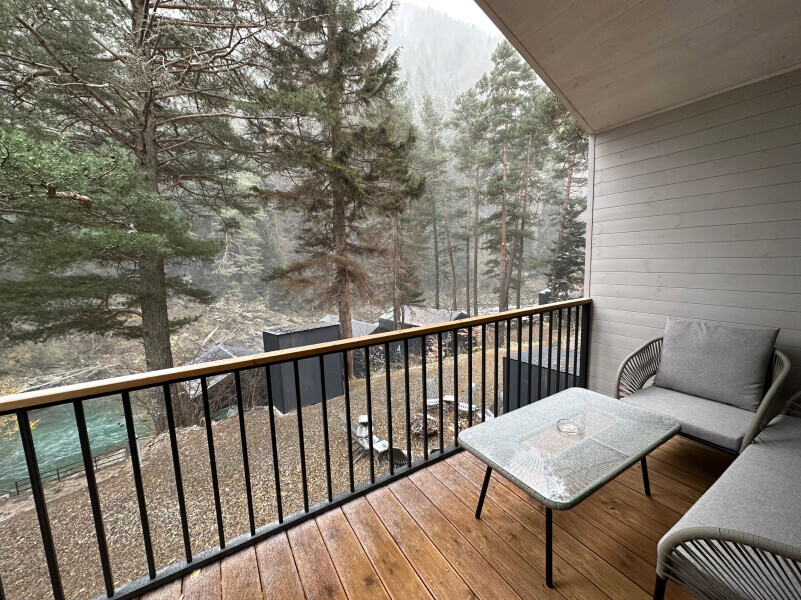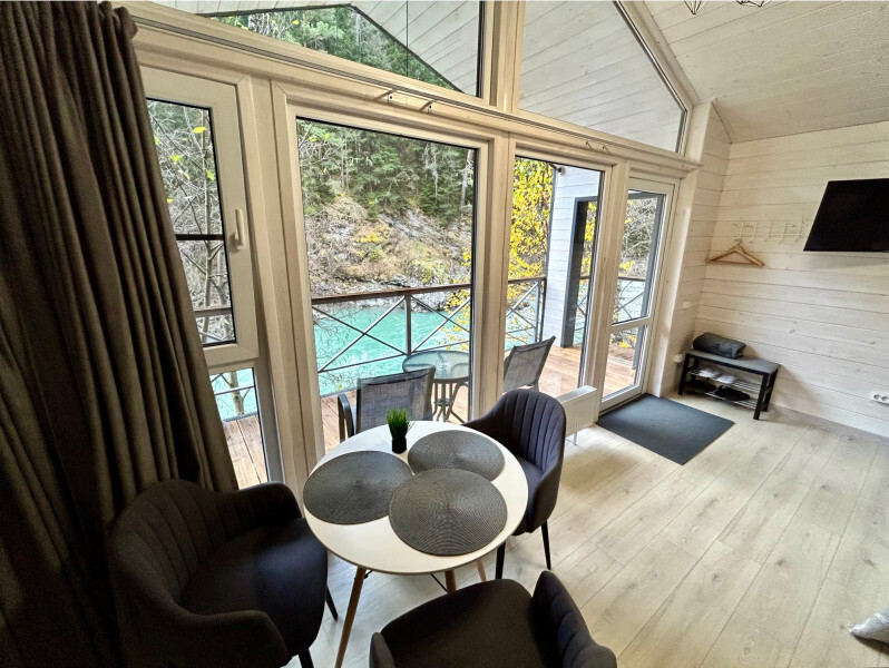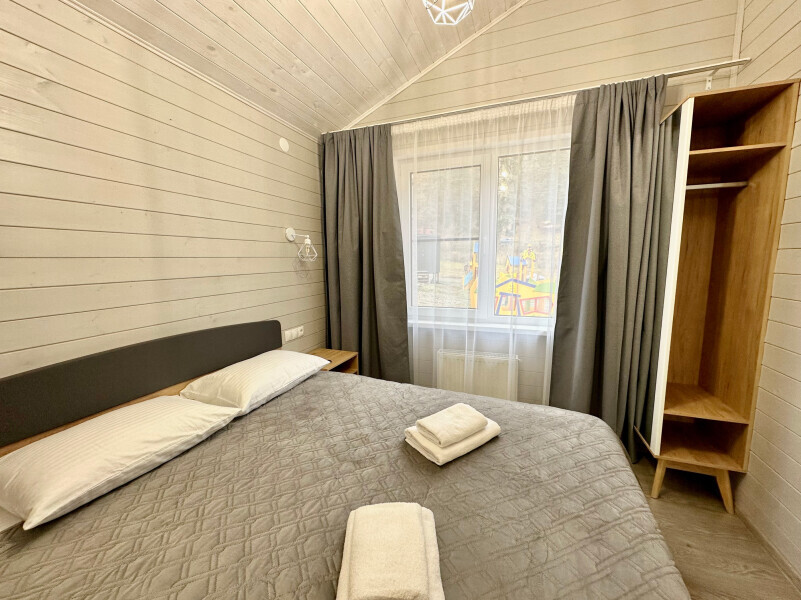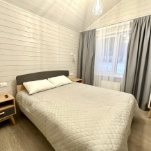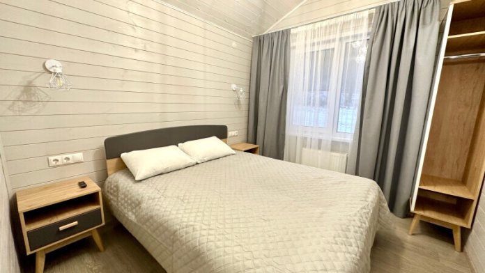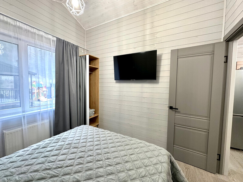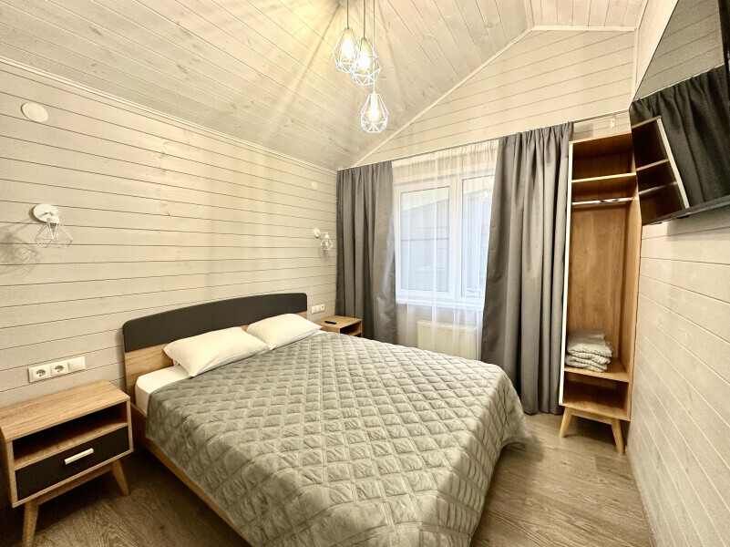 Дом 2-комнатный оснащен: крытой террасой с видом на реку; 2-спальной кроватью с хорошим ортопедическим матрасом (160х200); раскладным диваном (160х200); качественным постельным бельем, подушками и одеялом; колонкой «Алиса»; Smart TV; санузлом с бойлером, феном, полотенцами, банными принадлежностями и средствами личной гигиены; кухней, холодильником, микроволновой печью, электроплитой, чайником, посудой; чайной станцией и питьевой водой из артезианской скважины; собственной мангальной зоной; шампуры, решетки для мангала (у администратора по запросу бесплатно).
