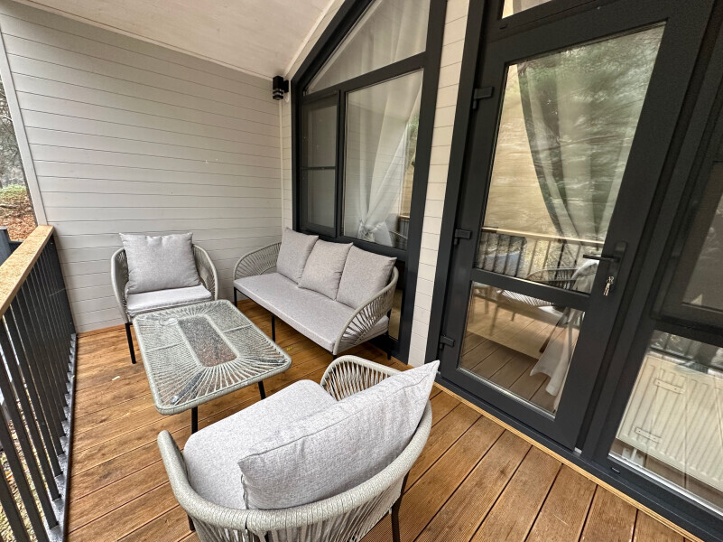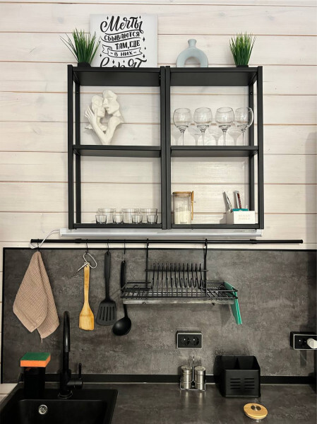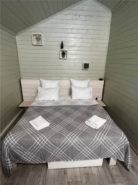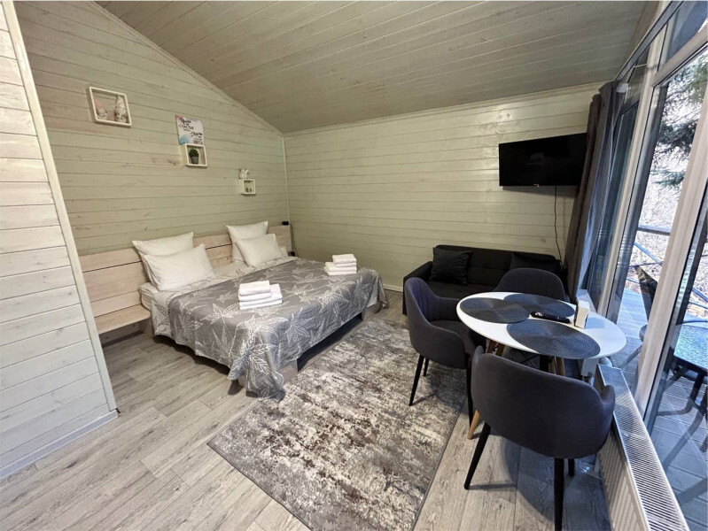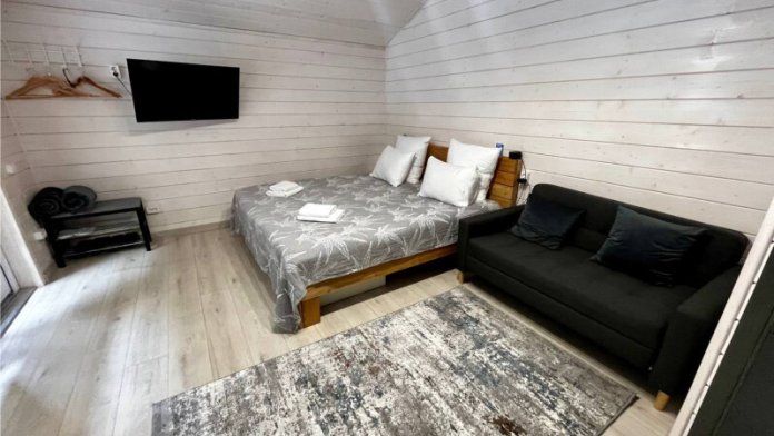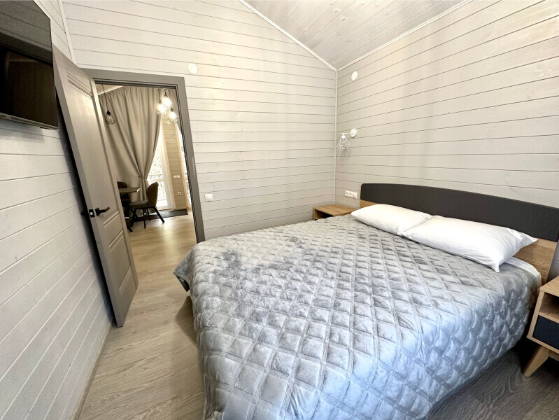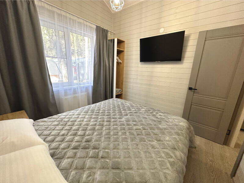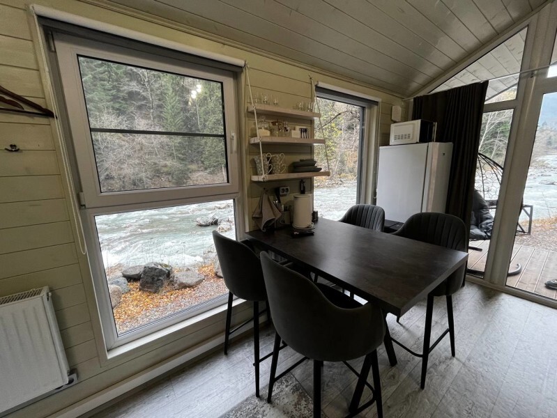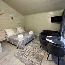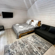 Дом двухкомнатный оснащен: крытой террасой с видом на реку; 2-спальной кроватью с хорошим ортопедическим матрасом (160х200); раскладным диваном (160х200); качественным постельным бельем, подушками и одеялом; колонкой «Алиса»; wi-fi; Smart TV; санузлом с бойлером, феном, полотенцами, банными принадлежностями и средствами личной гигиены; кухней, холодильником, микроволновой печью, электроплитой, чайником, посудой; чайной станцией и питьевой водой из артезианской скважины; собственной мангальной зоной; шампуры, решетки для мангала (у администратора по запросу бесплатно).