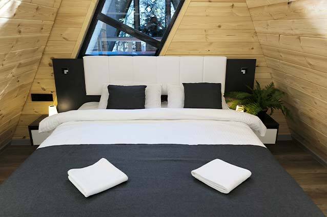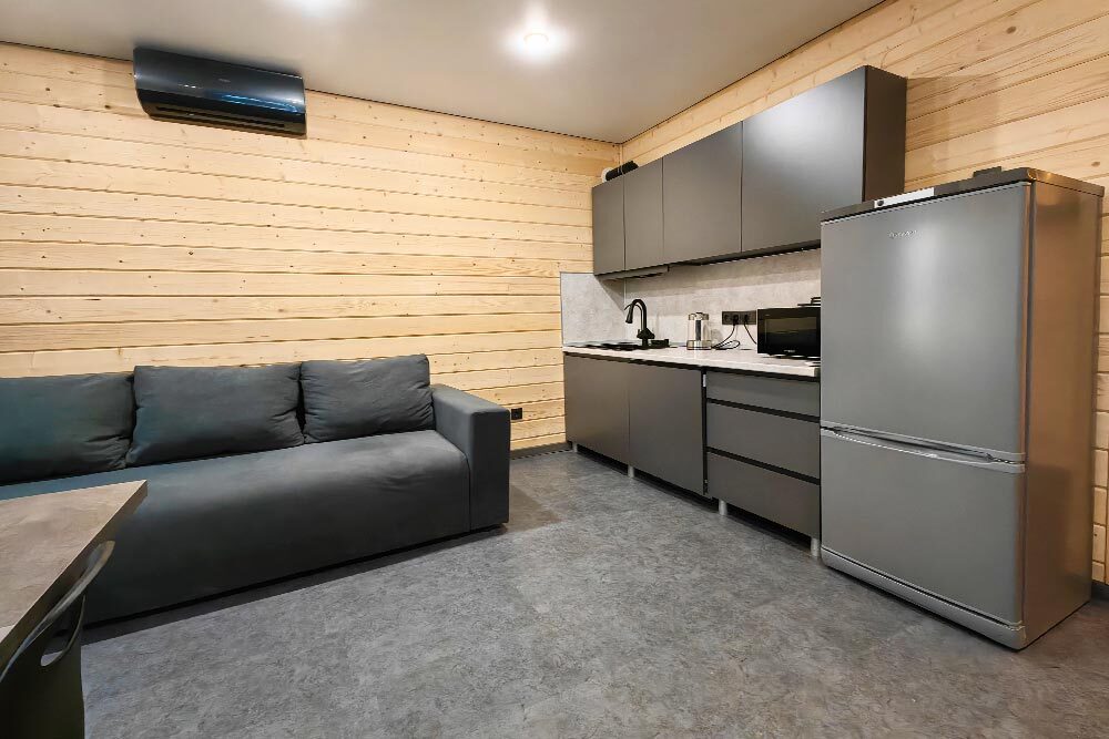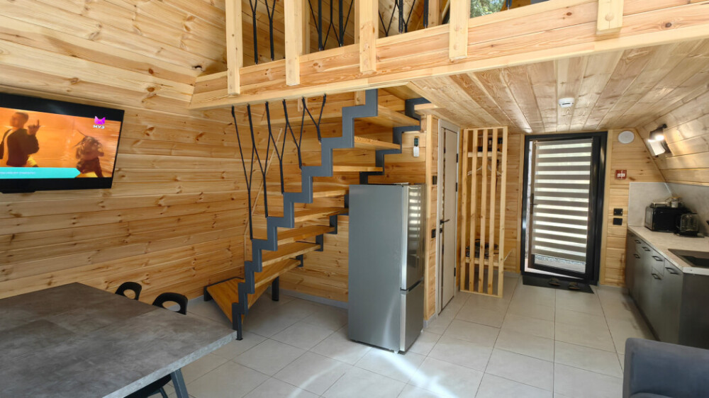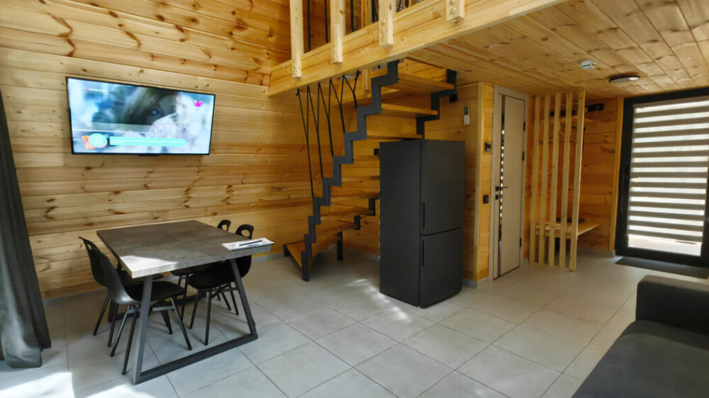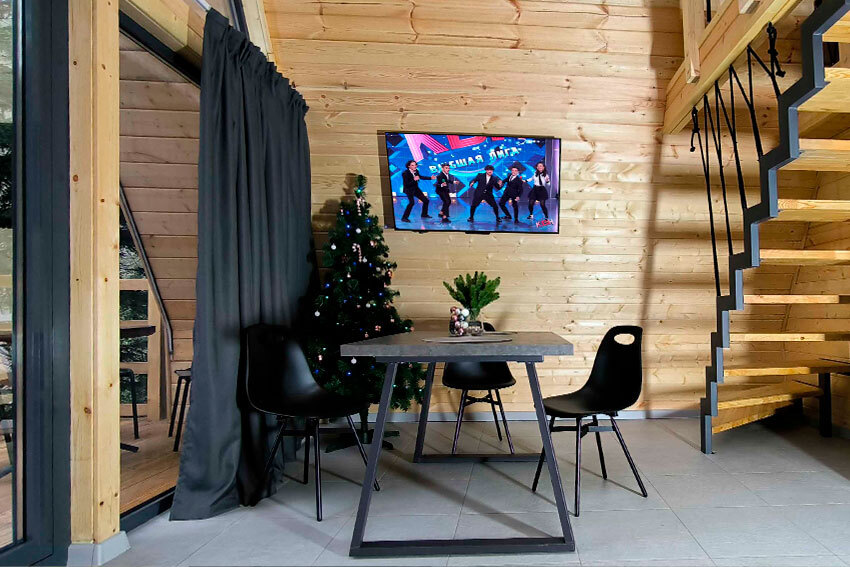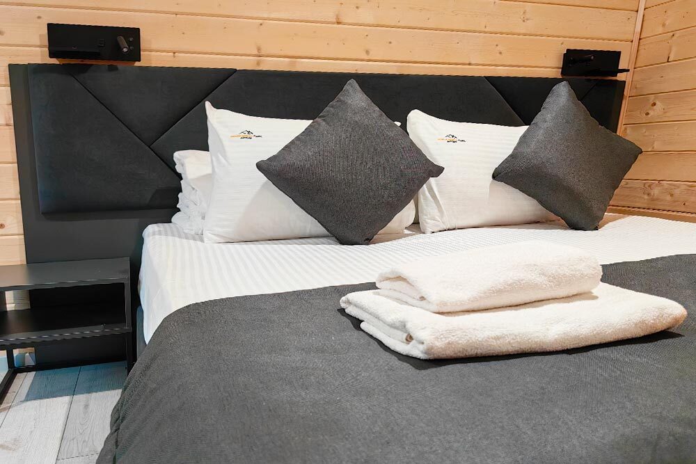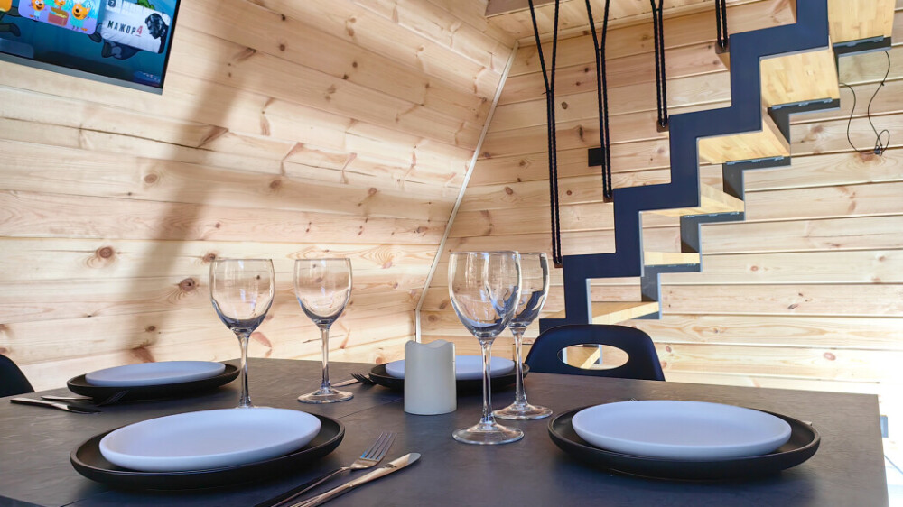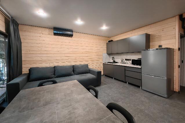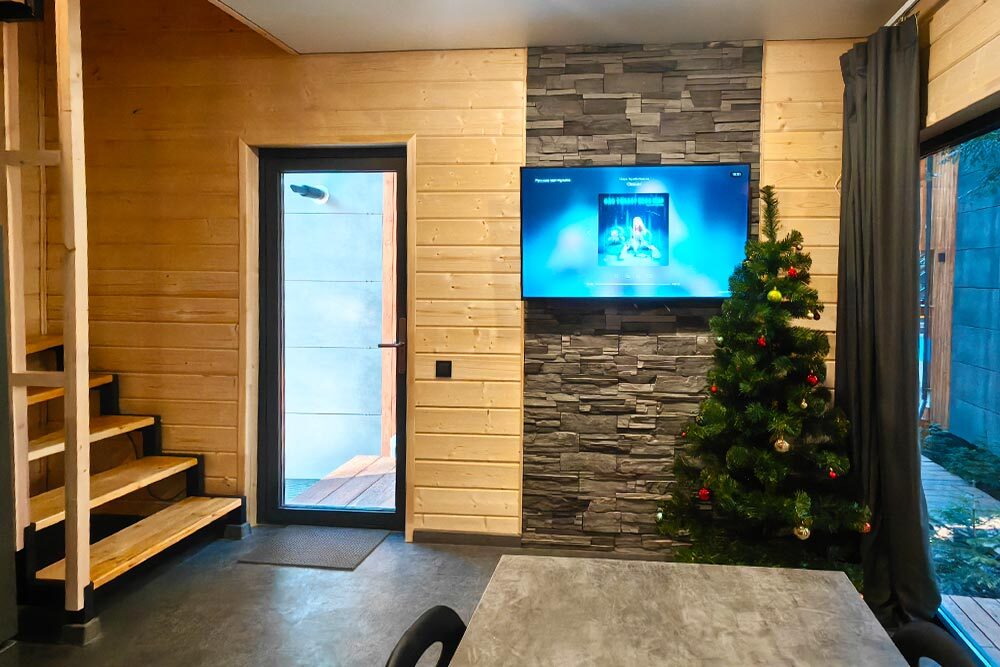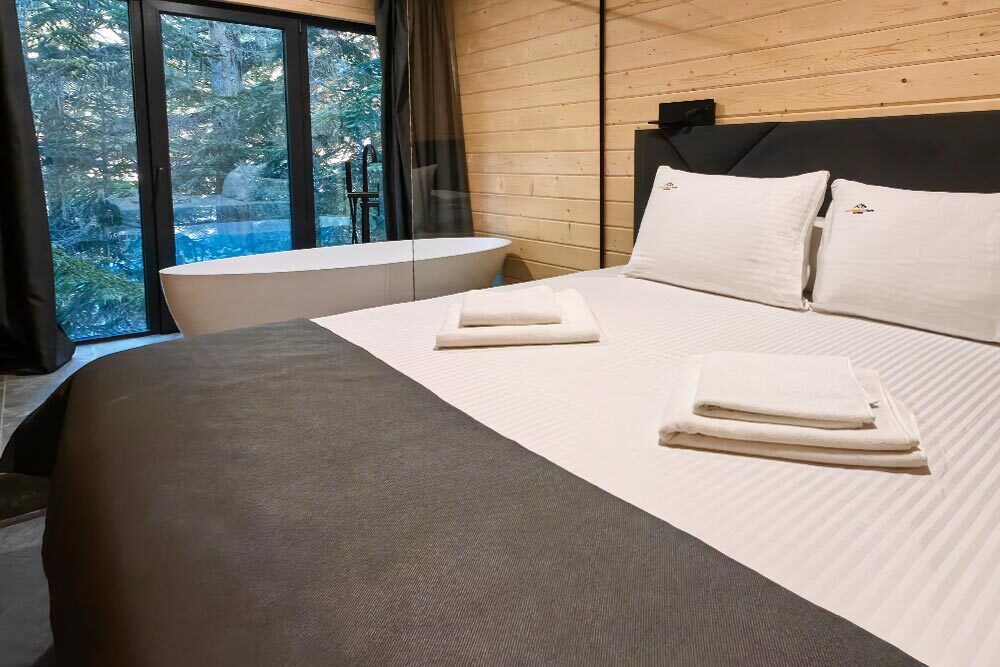 Оборудование домов: Смарт ТВ, Колонка Яндекс Алиса с элементами «умного дома», бесплатный Wi-Fi, полноценная кухня с необходимой утварью, посудомоечная машина, холодильник, микроволновка, плита, чайник, кондиционер, фен, розетки у кроватей, сушилка для белья. Постельное белье премиум-качества, ортопедические матрасы, гипоаллергенные подушки и одеяла, шторы на электрокарнизе. В каждом санузле гигиенический душ.
