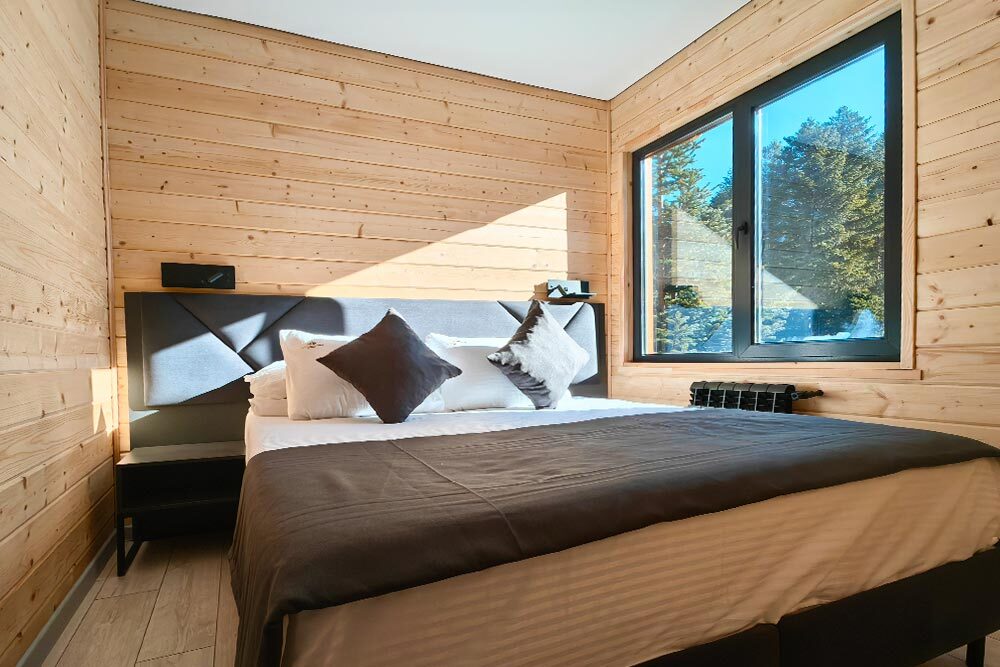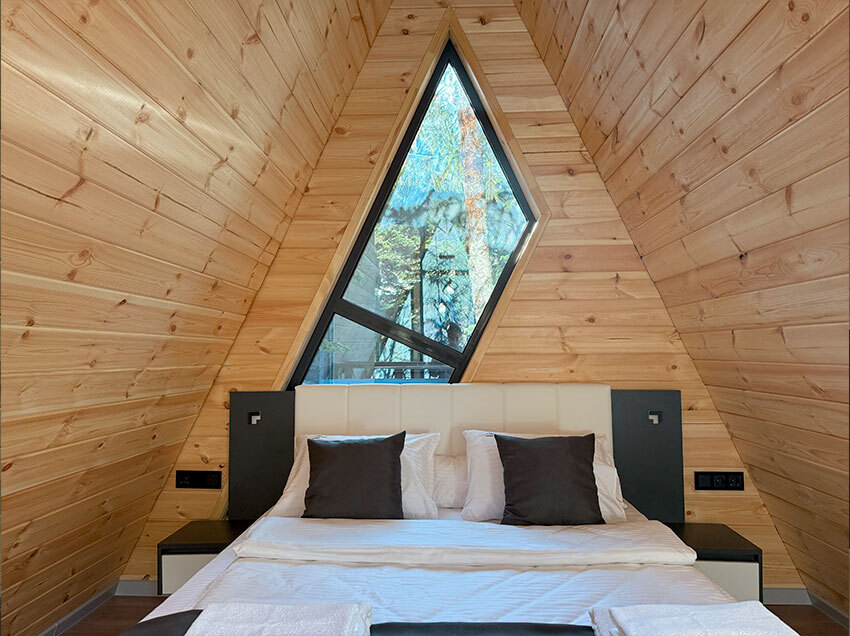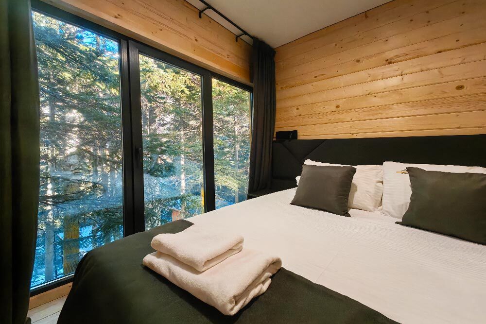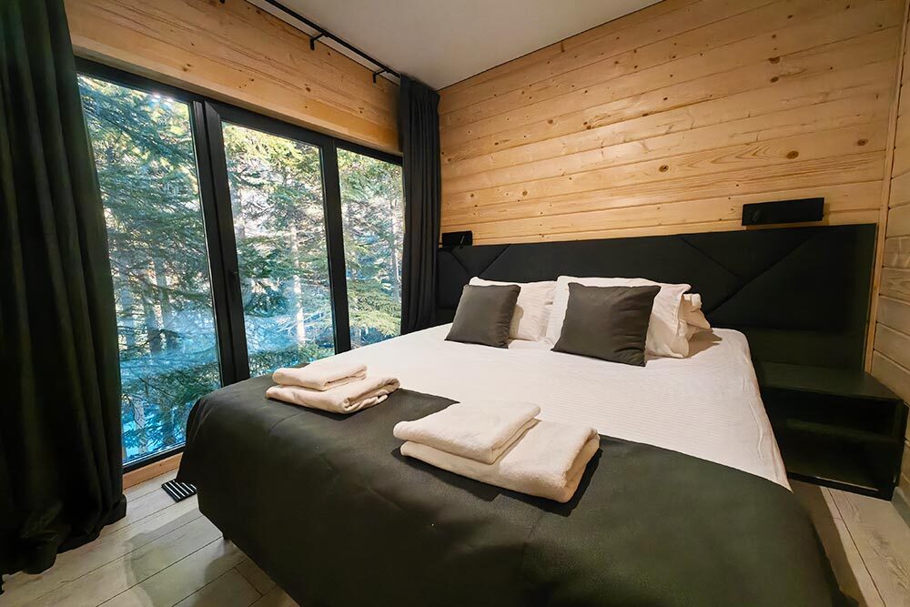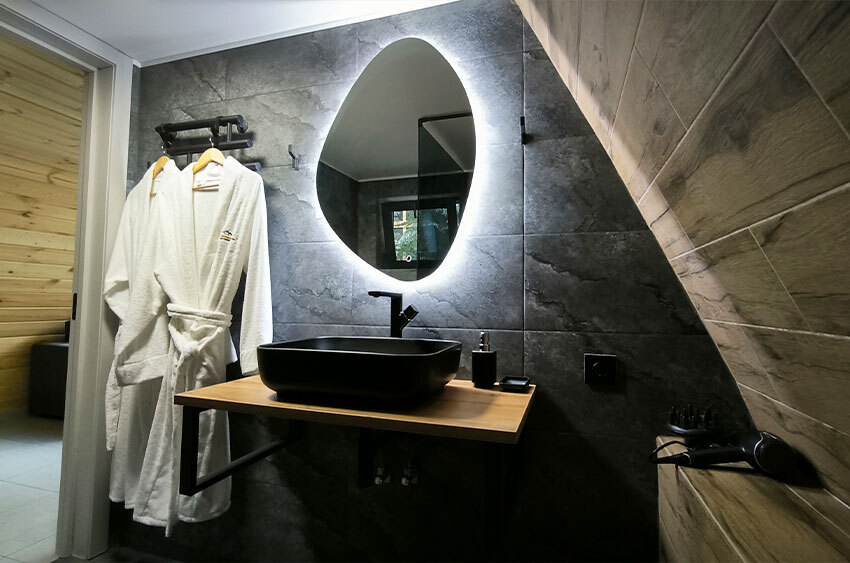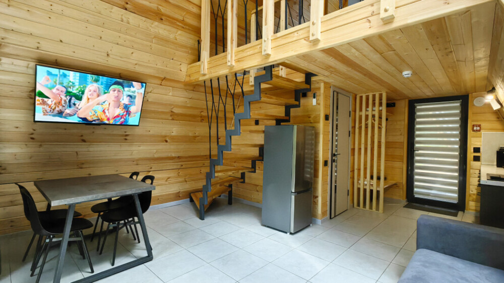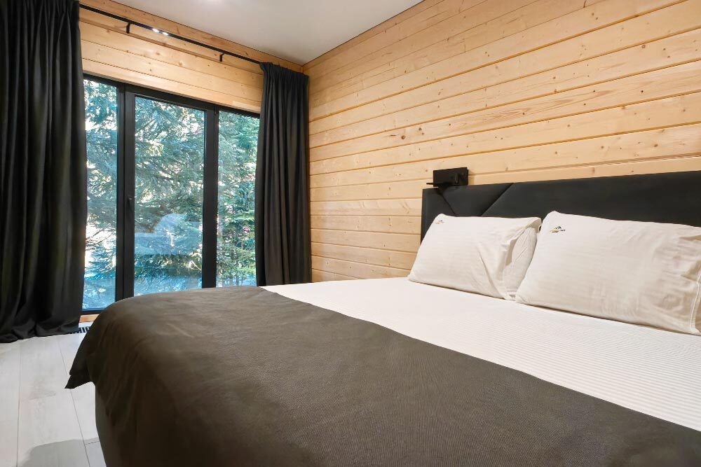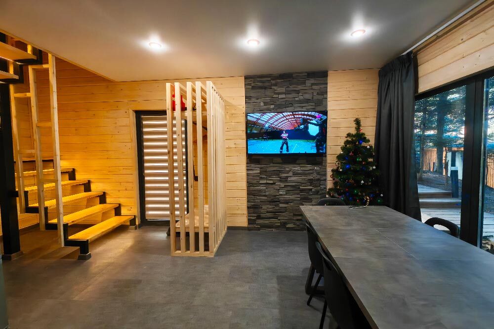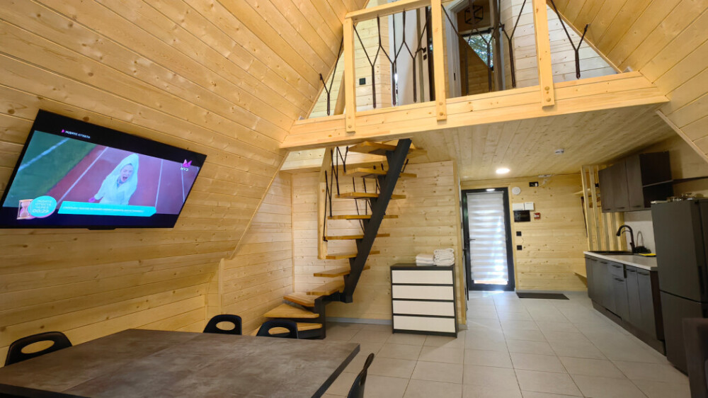 Оборудование домов: Смарт ТВ, Колонка Яндекс Алиса с элементами «умного дома», бесплатный Wi-Fi, полноценная кухня с необходимой утварью, посудомоечная машина, холодильник, микроволновка, плита, чайник, кондиционер, фен, розетки у кроватей, сушилка для белья. Постельное белье премиум-качества, ортопедические матрасы, гипоаллергенные подушки и одеяла, шторы на электрокарнизе. В каждом санузле гигиенический душ.
