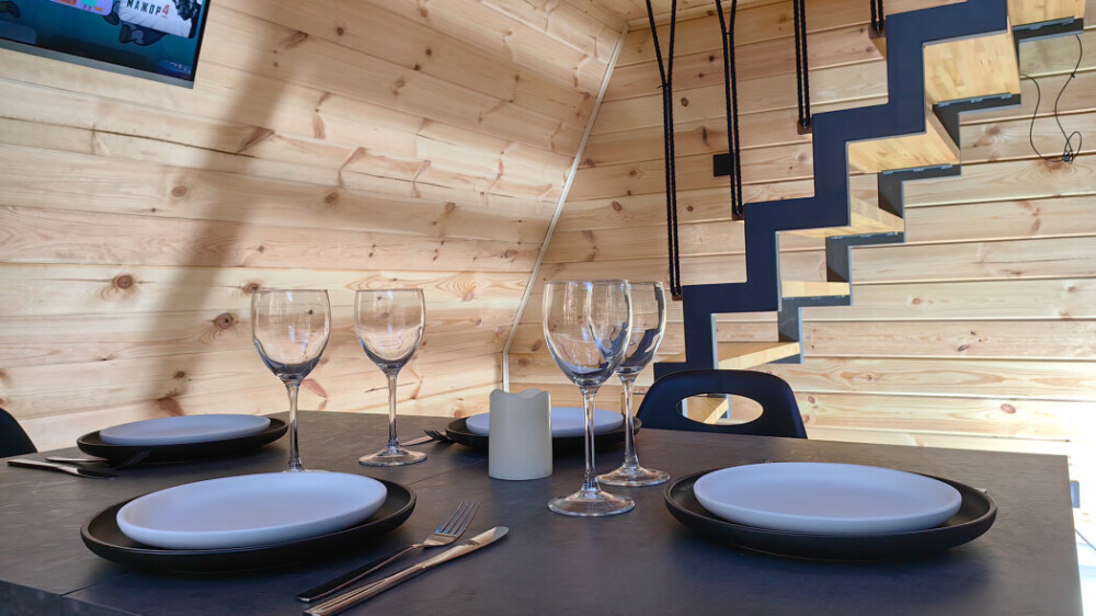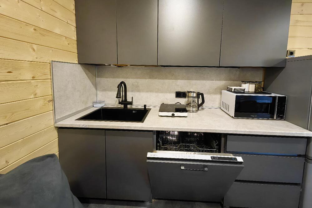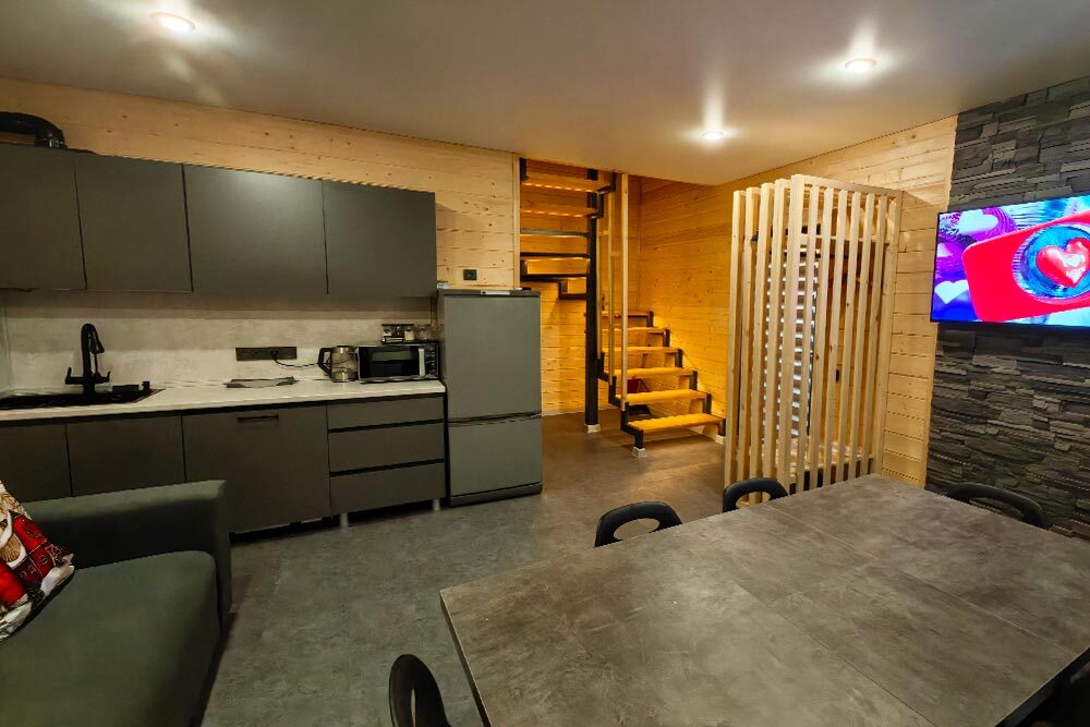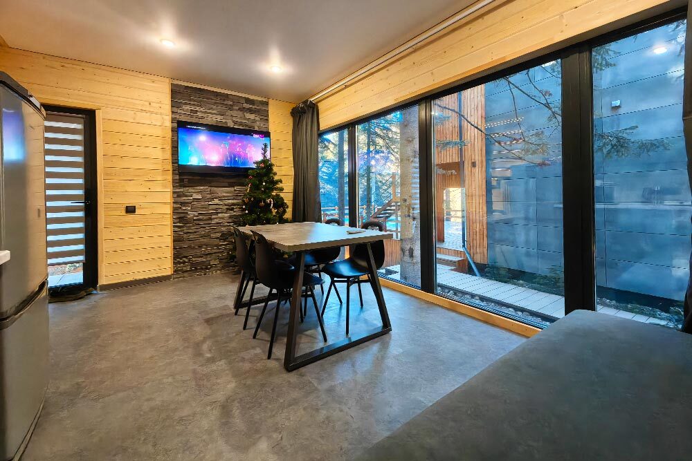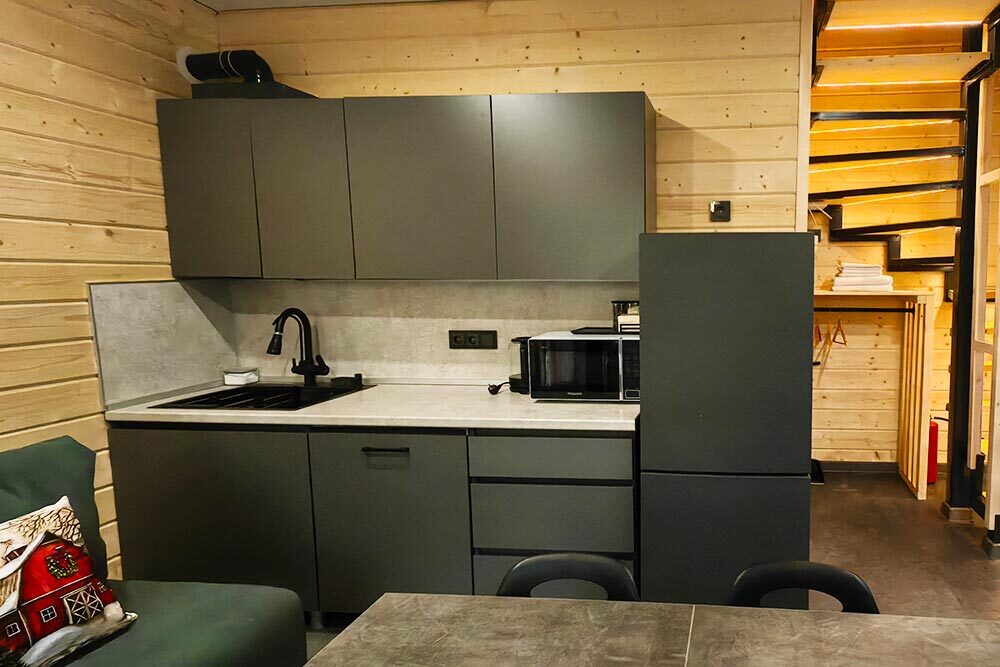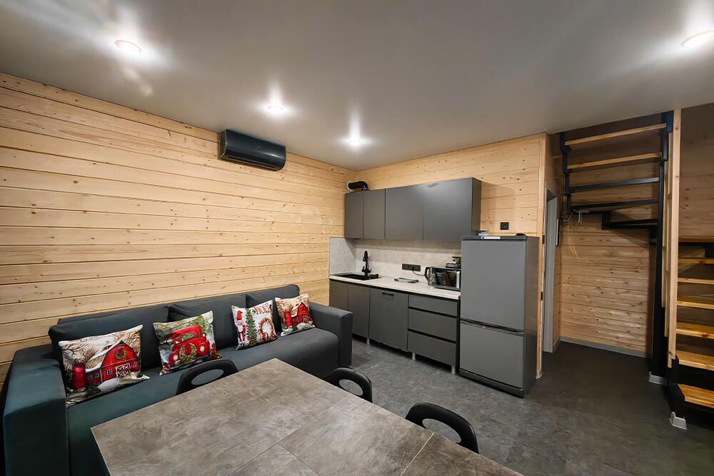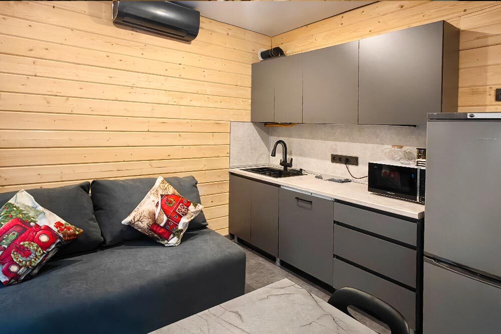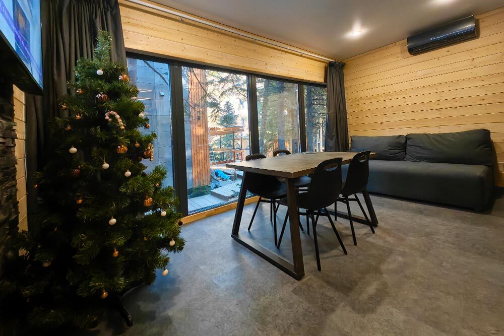Домик с кухней и посудомоечной машиной. Панорамное остекление. Умный дом с Алисой. В санузле гигиенический душ. Подогреваемые полы. Магнитная зарядка для смартфонов у кроватей. Большая терраса с видом на горы.