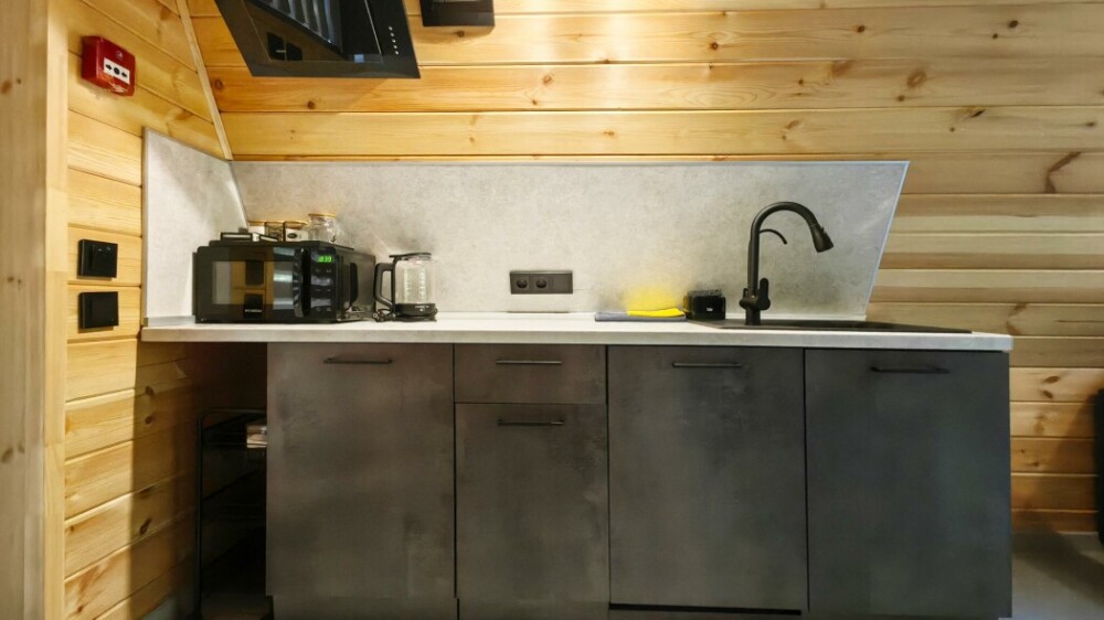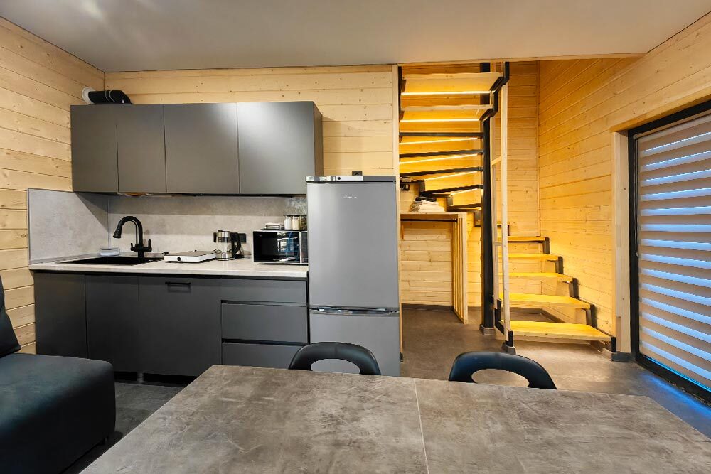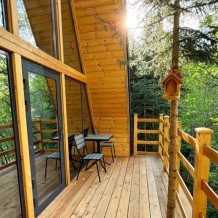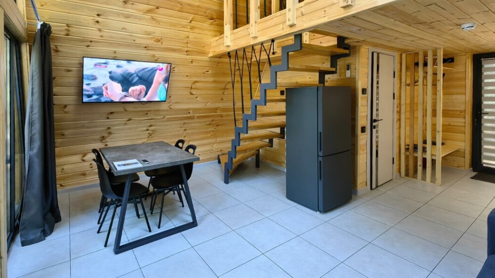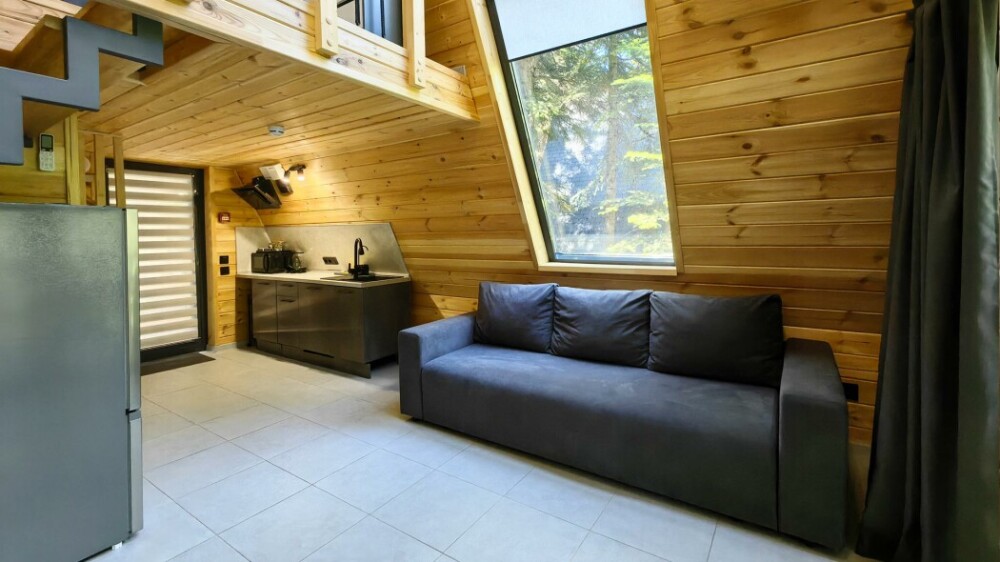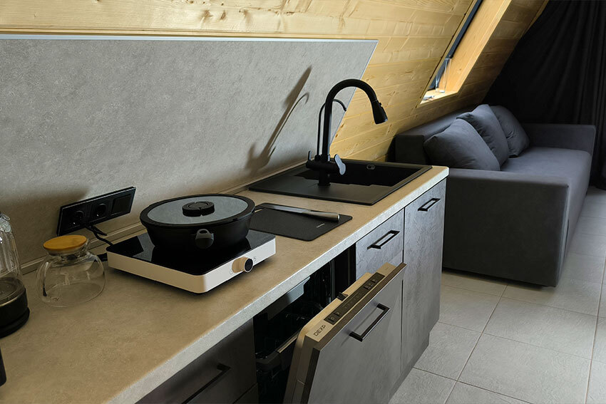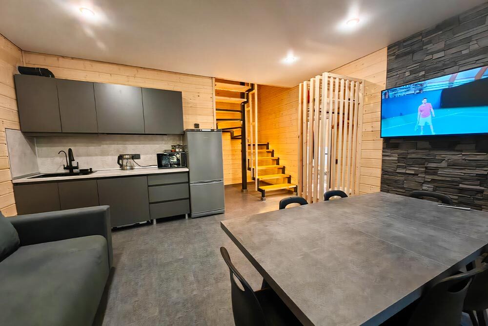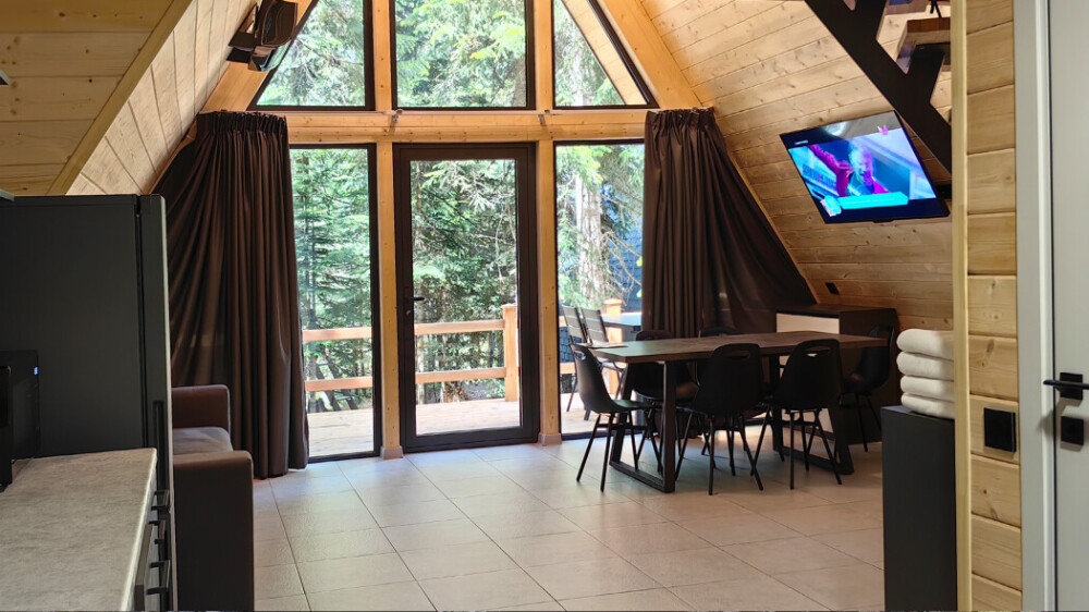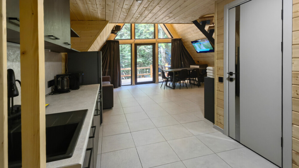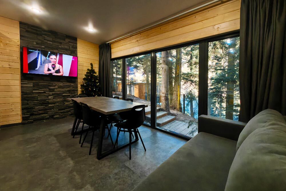 Домик с кухней и посудомоечной машиной. Панорамное остекление. Умный дом с Алисой. В санузле гигиенический душ. Подогреваемые полы. Магнитная зарядка для смартфонов у кроватей. Большая терраса с видом на горы.
