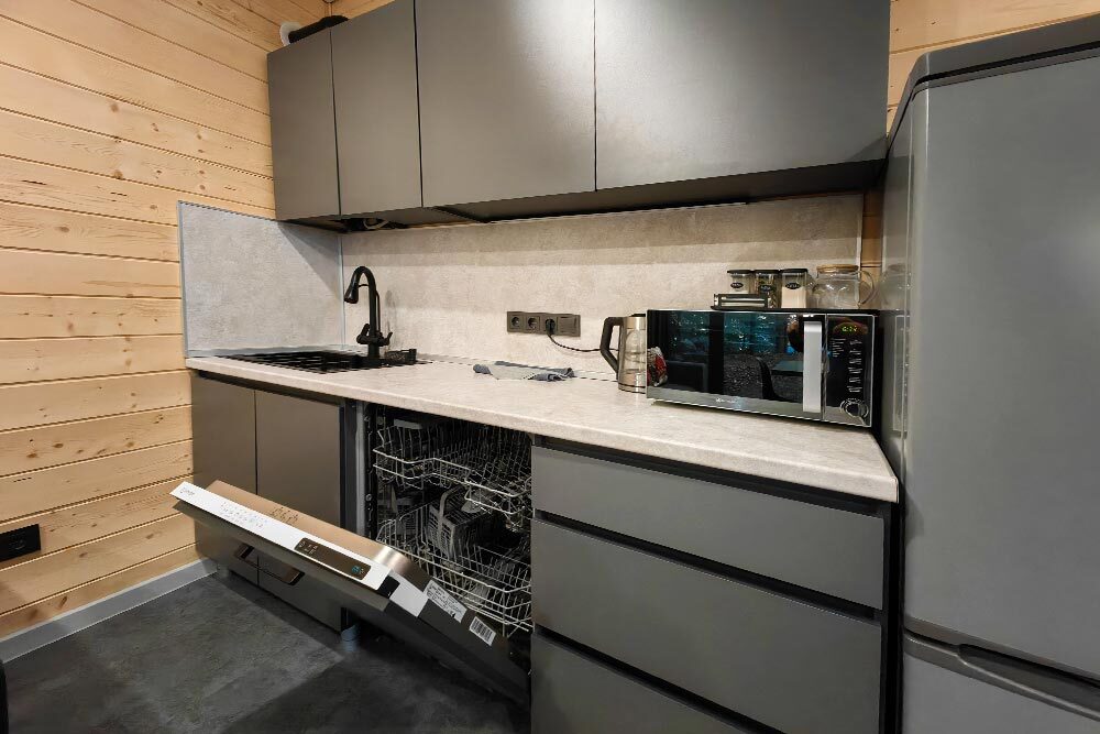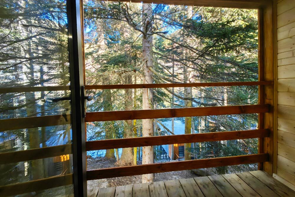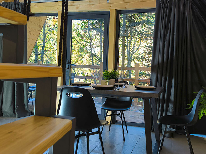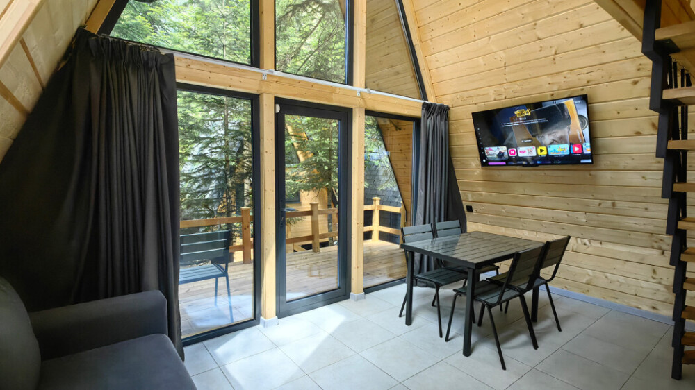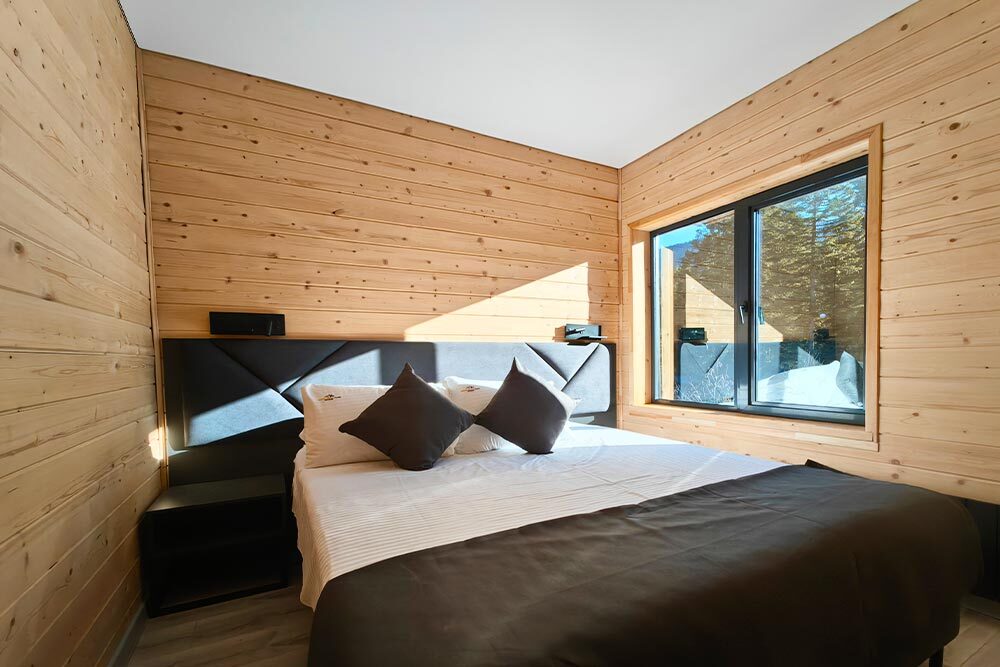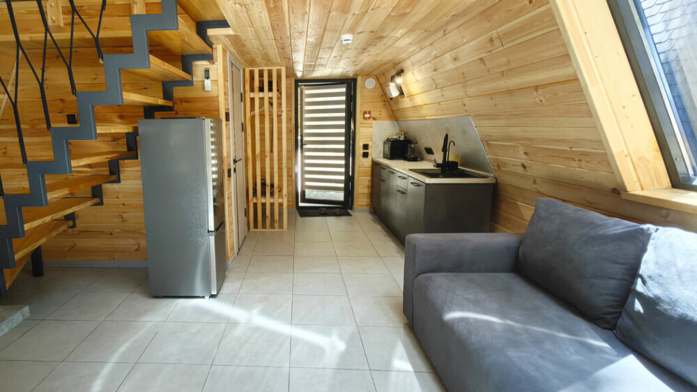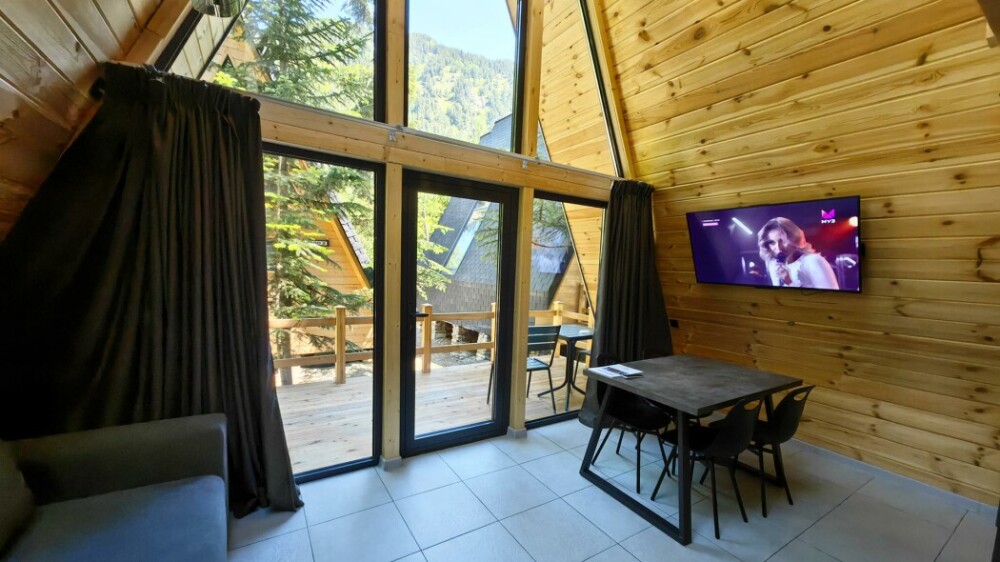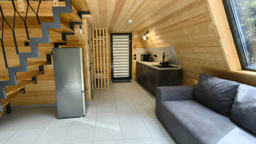 Домик с кухней и посудомоечной машиной. Панорамное остекление. Умный дом с Алисой. В санузле гигиенический душ. Подогреваемые полы. Магнитная зарядка для смартфонов у кроватей. Большая терраса с видом на горы.