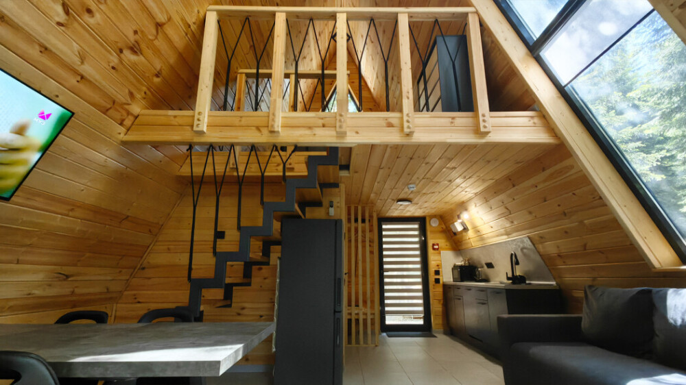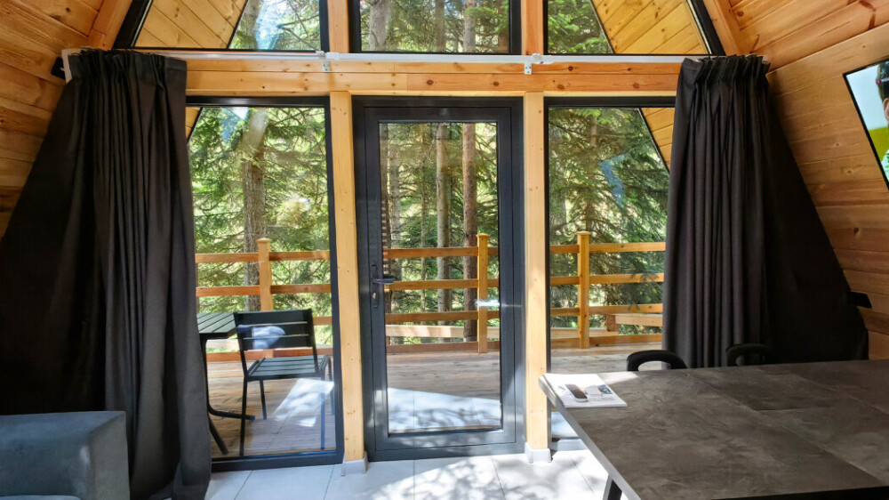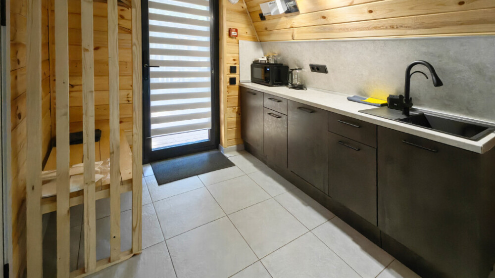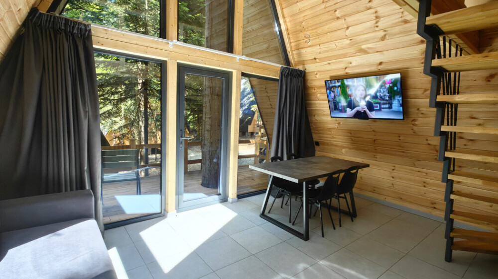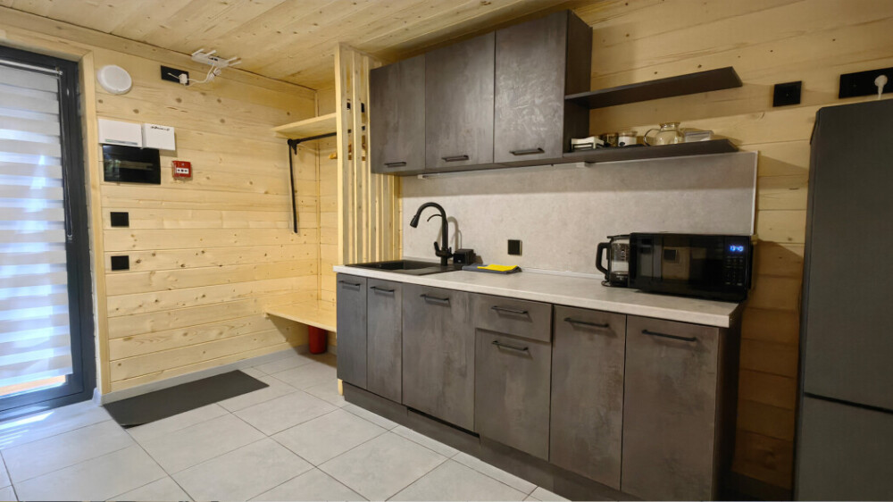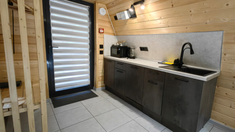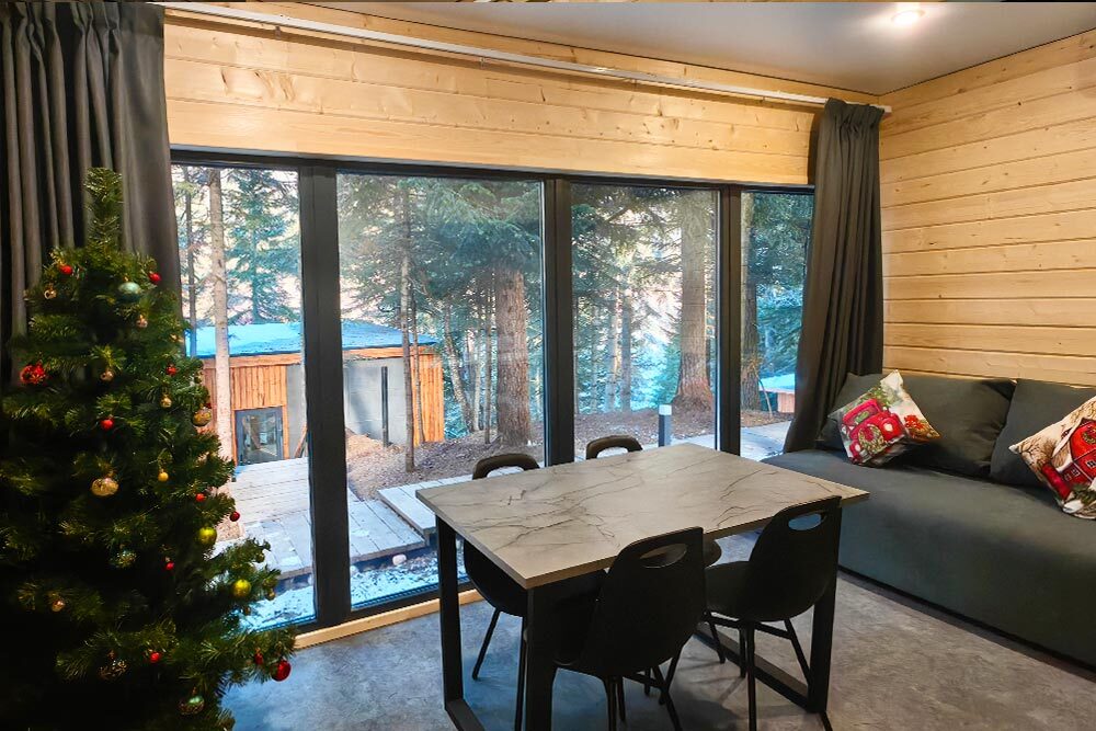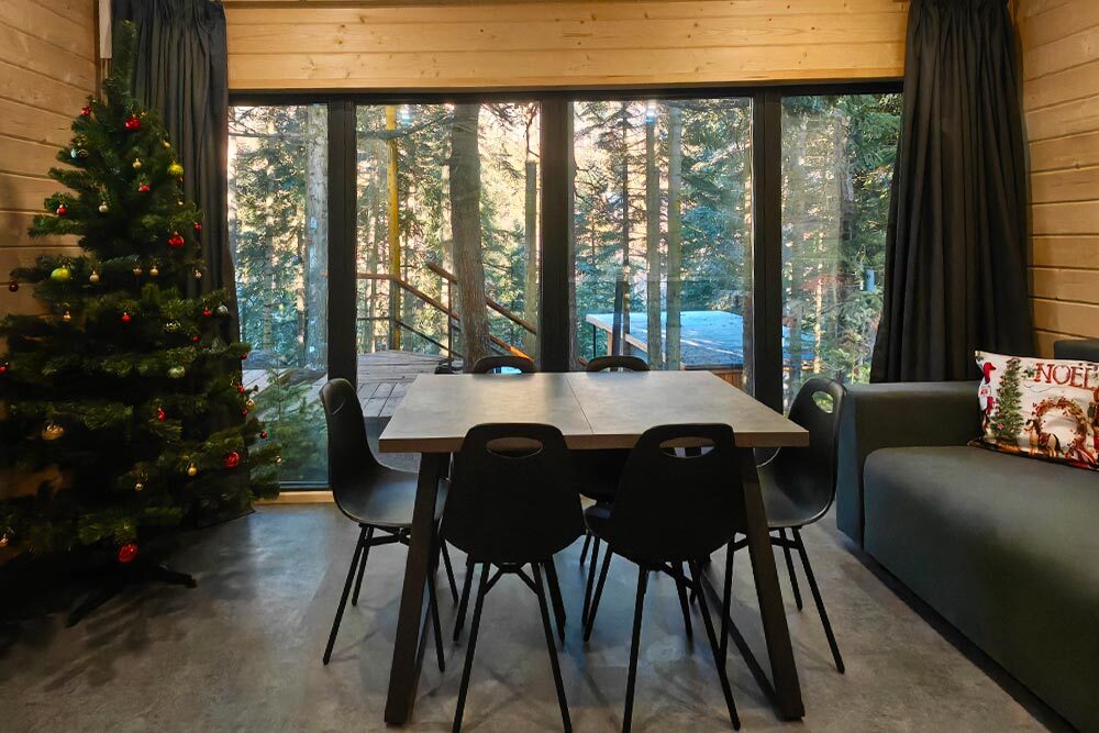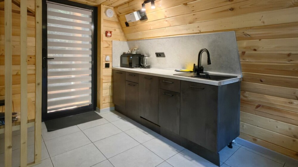 Домик с кухней и посудомоечной машиной. Панорамное остекление. Умный дом с Алисой. В санузле гигиенический душ. Подогреваемые полы. Магнитная зарядка для смартфонов у кроватей. Большая терраса с видом на горы.