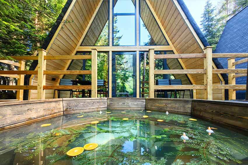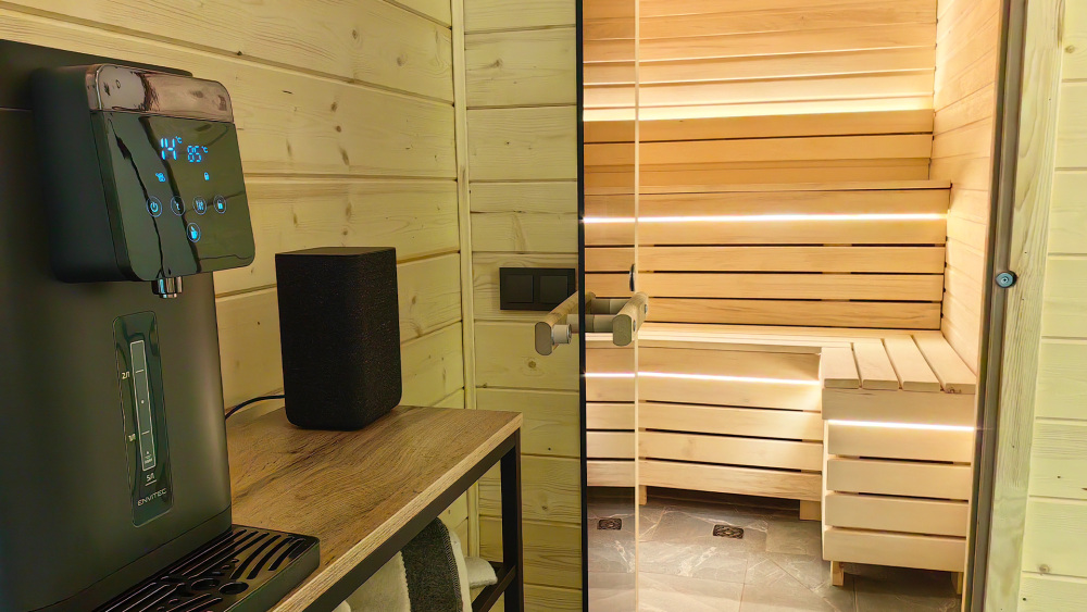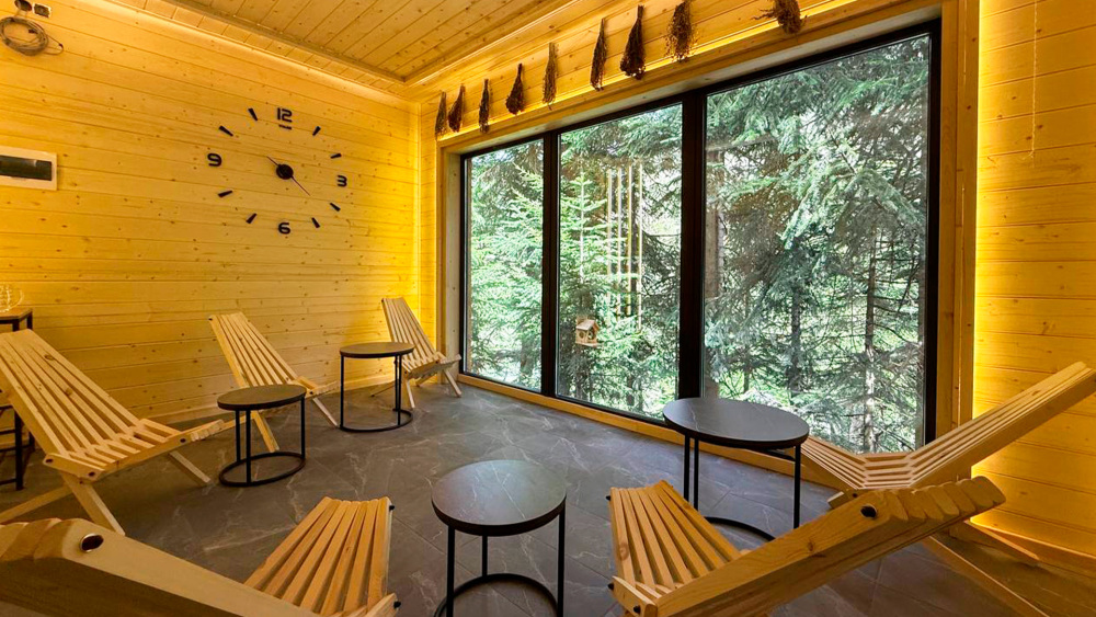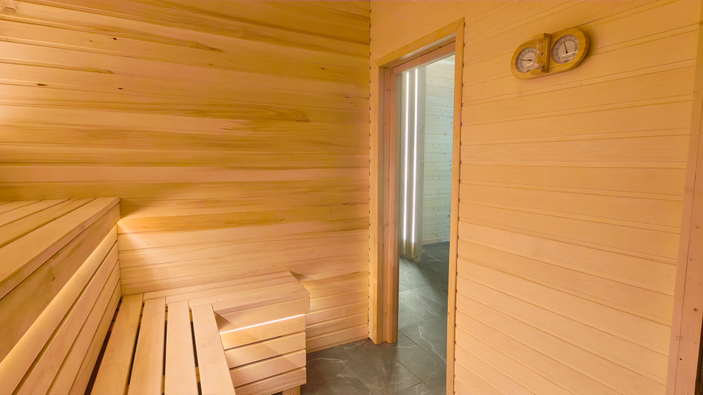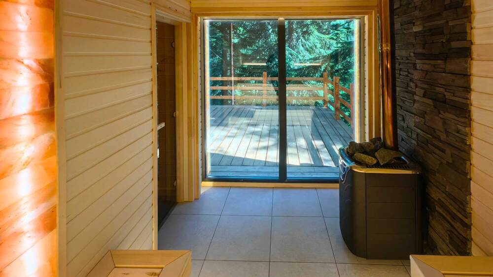 На территории отеля открытый подогреваемый бассейн размером 7,5 х 3,5 м, две панорамные бани, банные чаны. Посещение бани и бассейна оплачивается отдельно. Баня «Панорама» с видом на лес и реку предполагает посещение от одного до 8 гостей с оплатой за трехчасовой сеансы. Русская баня / финская сауна «Вершина» (до 6 гостей) с панорамным видом из парной и комнаты отдыха сдается целиком на срок от двух часов. Вы можете также заказать банный чан. Посещение бассейна входит в стоимость бань.