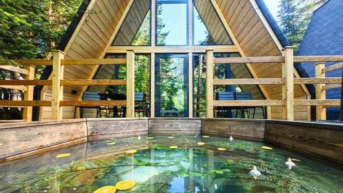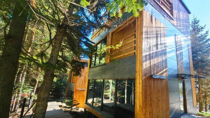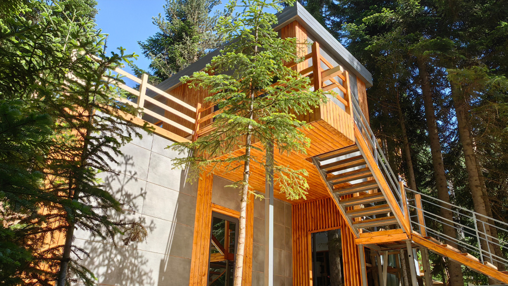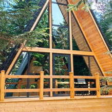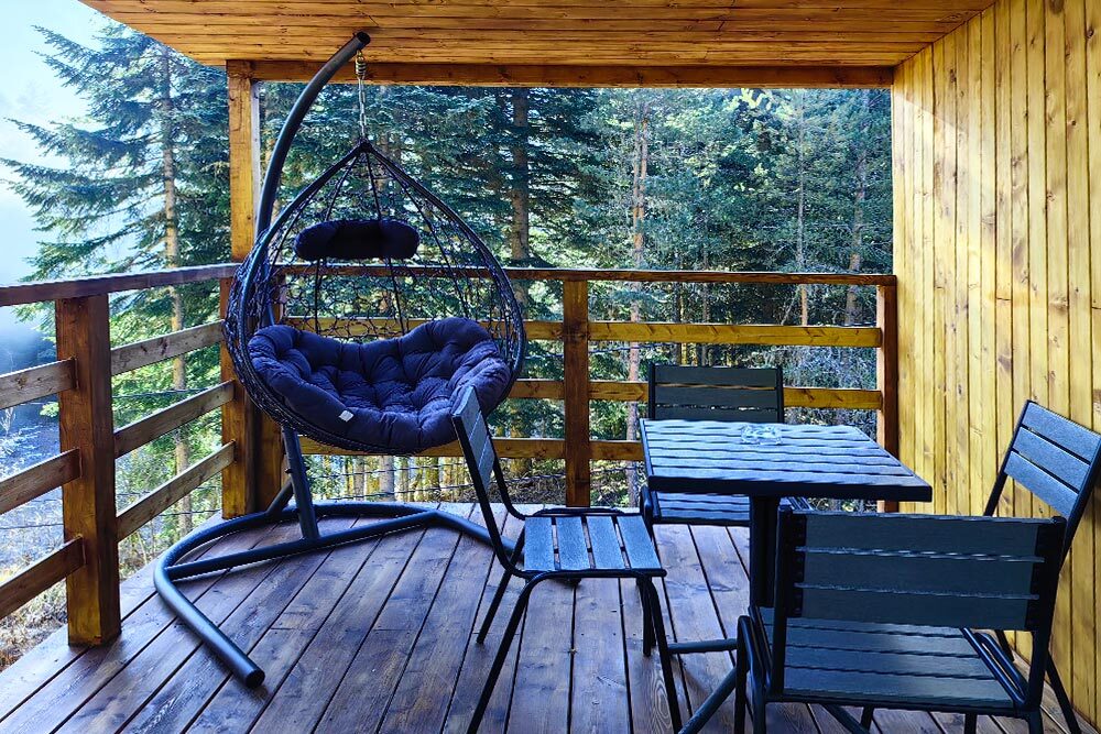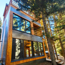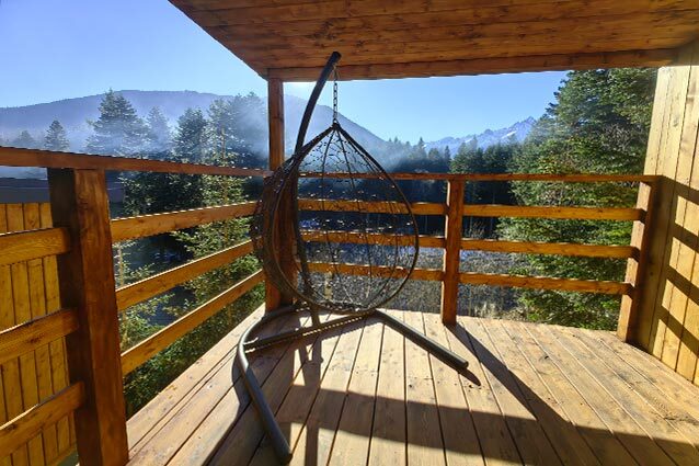 Дом с индивидуальным банным чаном на террасе и великолепным видом из панорамных окон на реку Архыз, лес и горы.