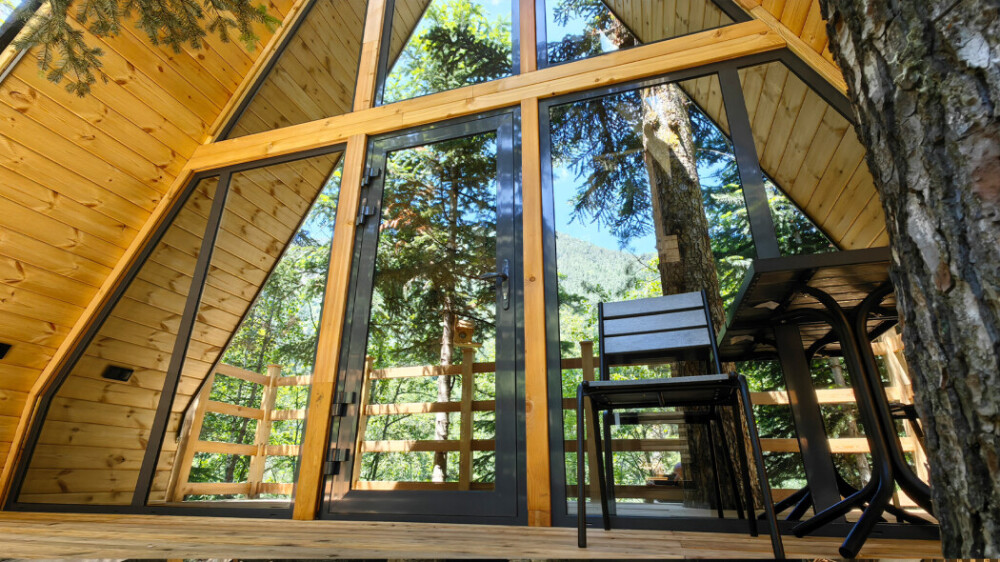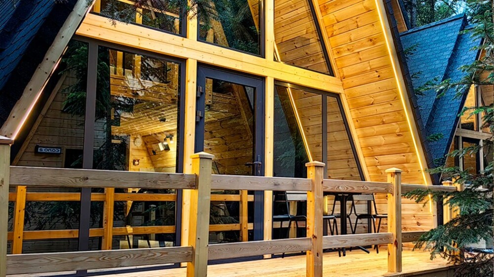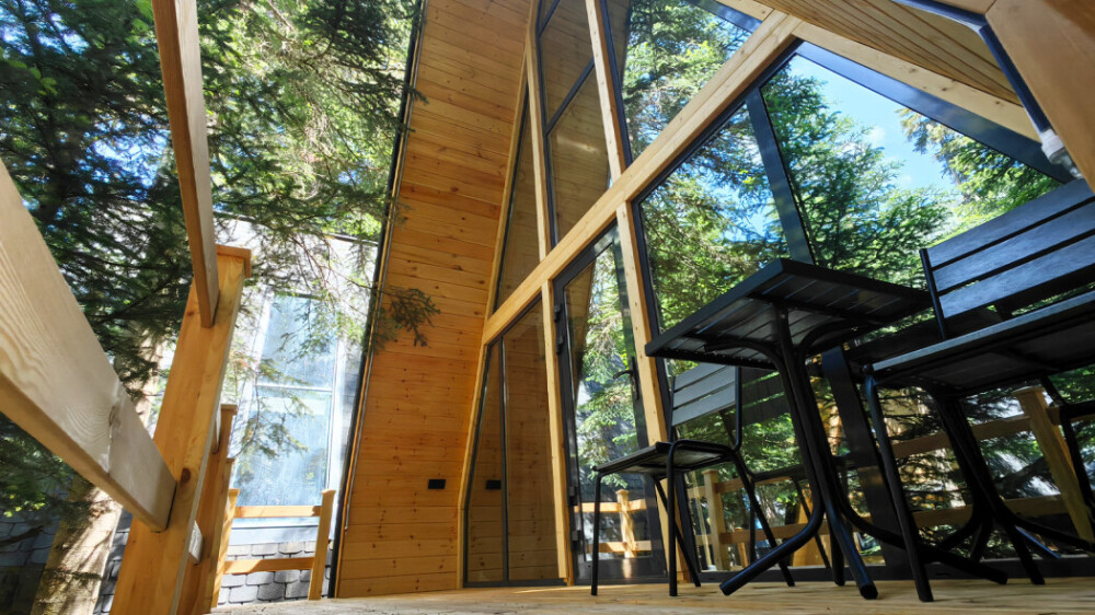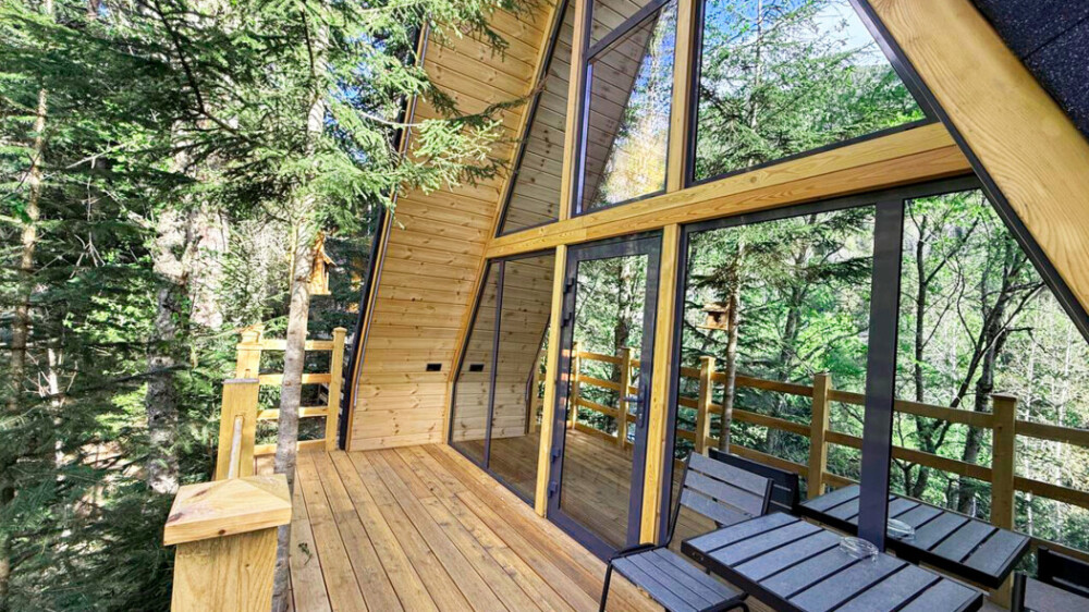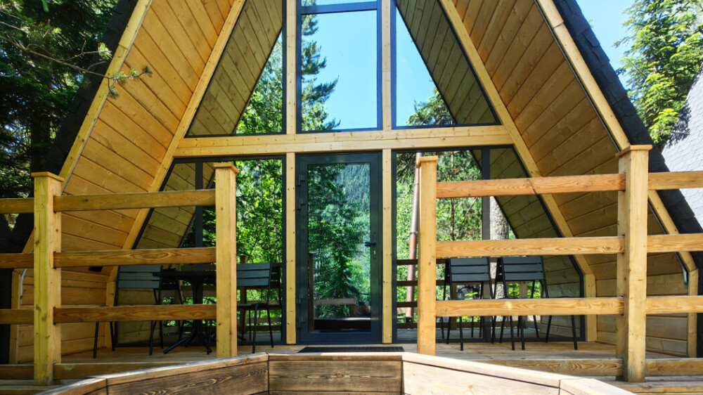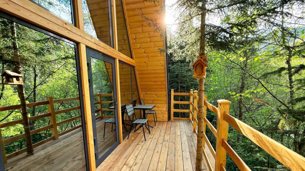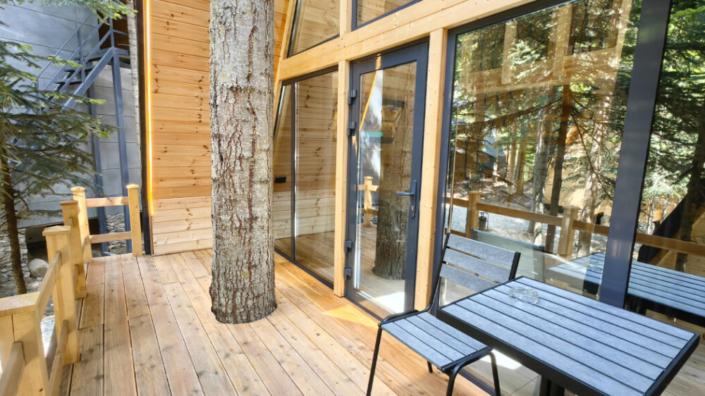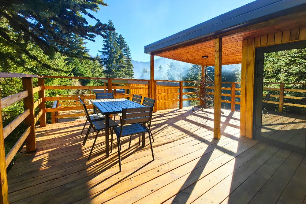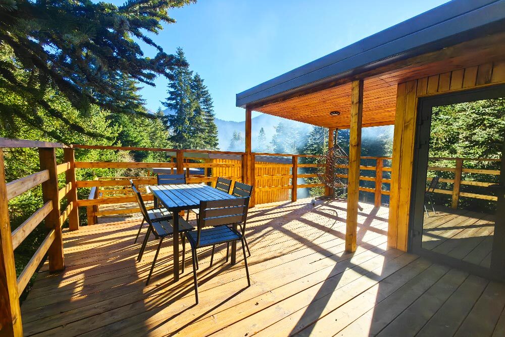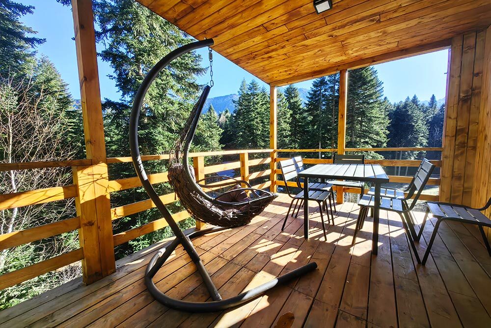 Дом Соло 2 с террасой и великолепным видом из панорамных окон на реку Архыз, лес и горы.