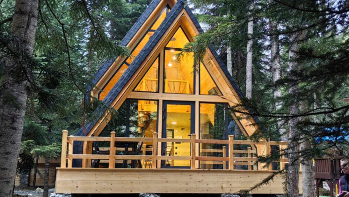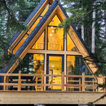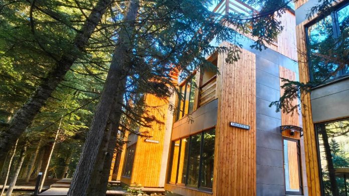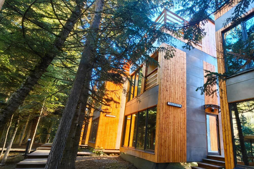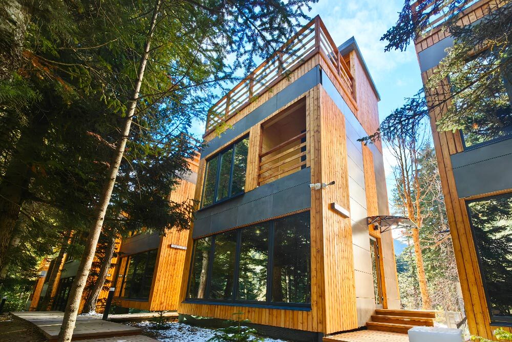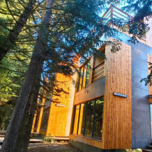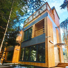 Современный двухэтажный дом в прямоугольной архитектуре, идеально подходящий для отдыха с семьёй или друзьями. Из панорамных окон открывается завораживающий вид на лес и горы.