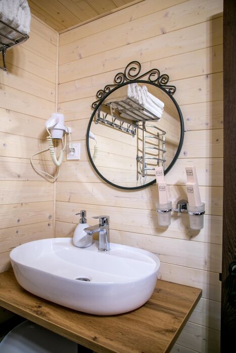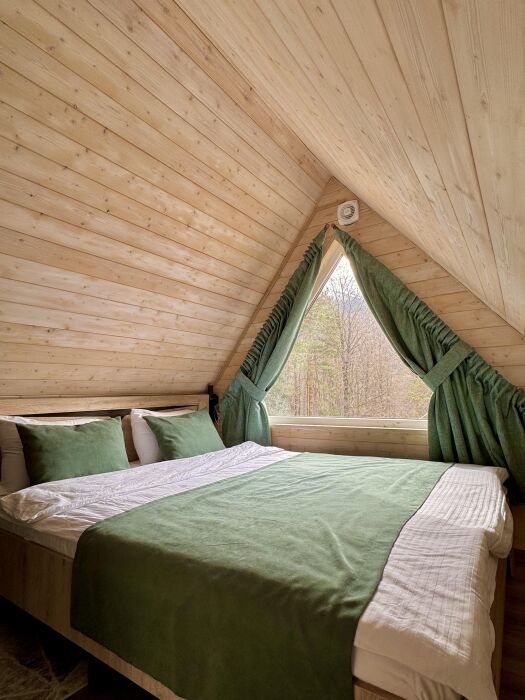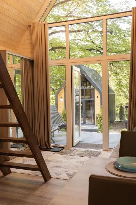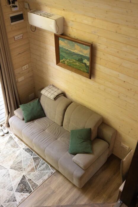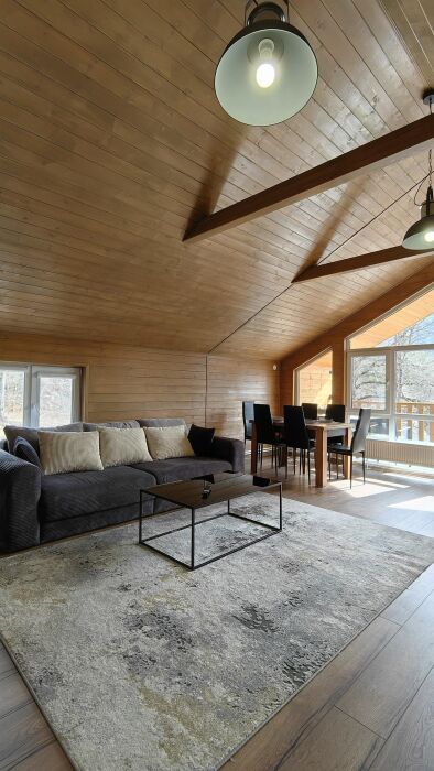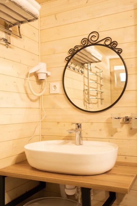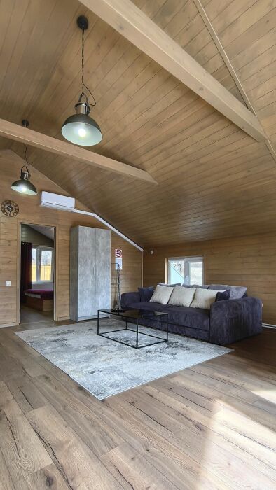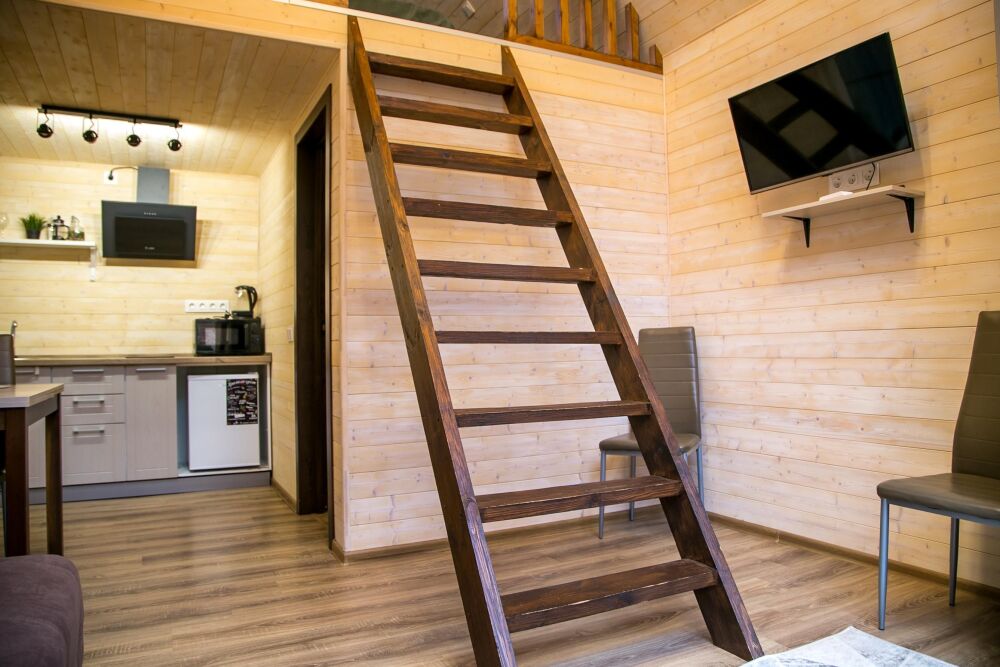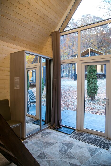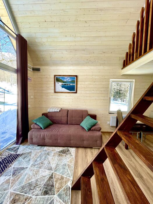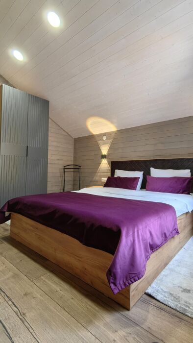 Барнхаусы: современные 4- местные дома с панорамным видом на горы и лес. расположена двуспальная кровать, светильники с USB разъемом и прикроватный столик. В комнате находится диван, шкаф-купе, телевизор. В горнолыжный сезон предоставляется сушилка для одежды.