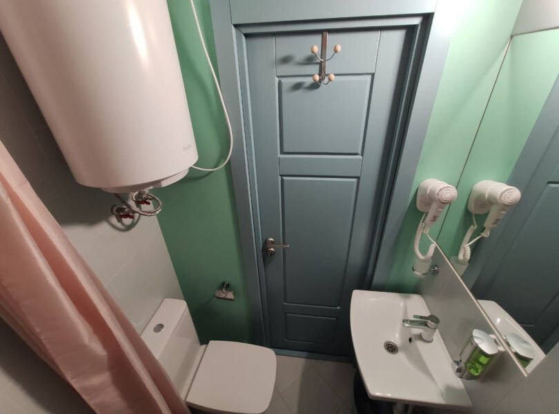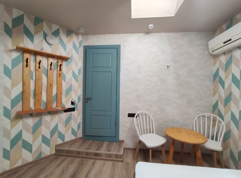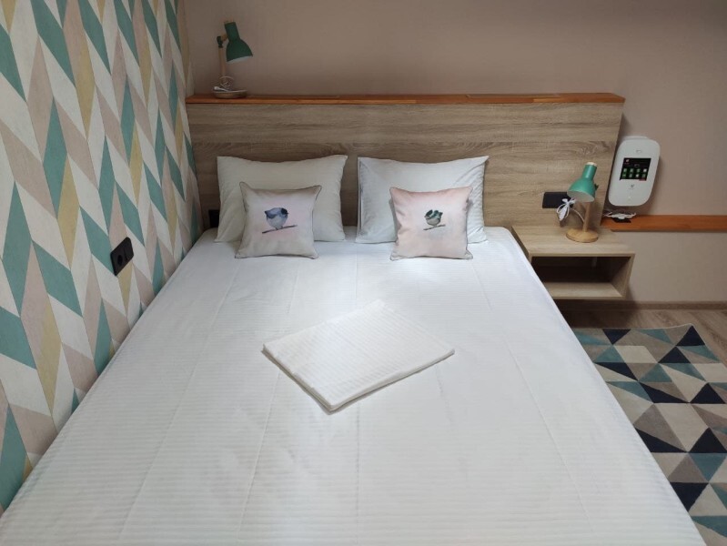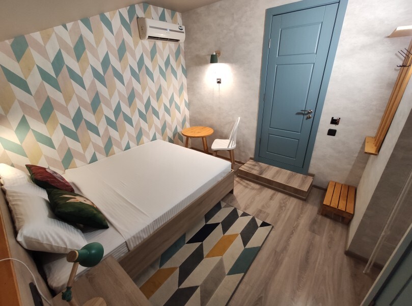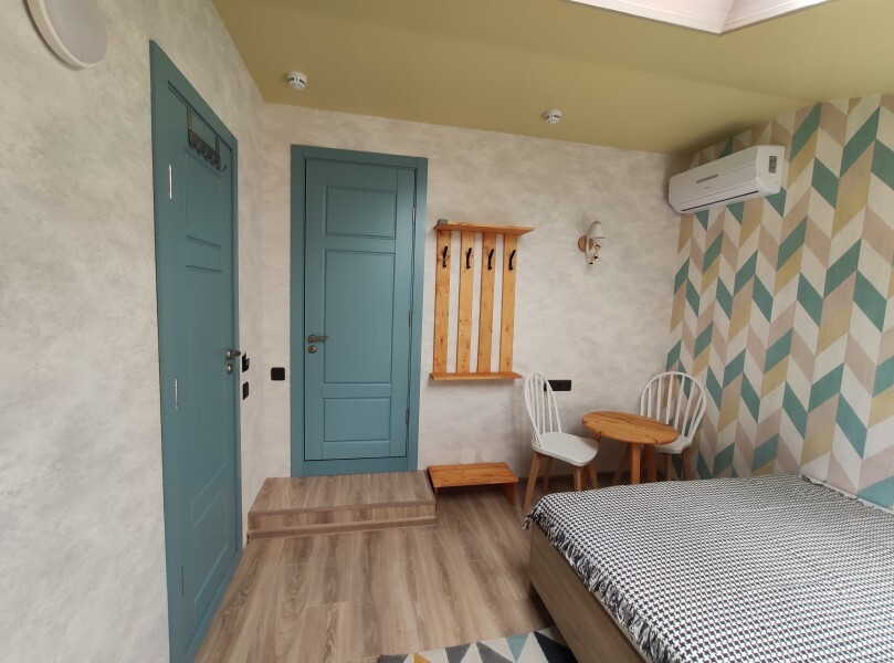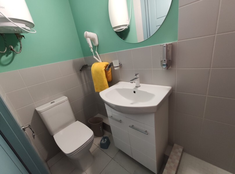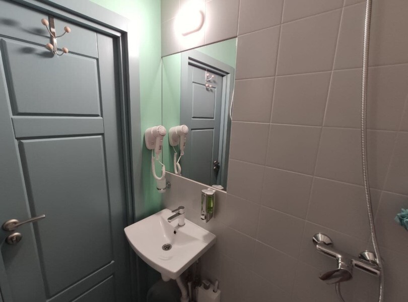 Уютный номер с собственным санузлом без окна. В номере двуспальная кровать с ортопедическим матрасом, комплект полотенец, принадлежности для душа (шампунь, гель), фен, горячая вода из бойлера. Номер оборудован приточно-вытяжной системой вентиляции с бризером (очиститель уличного воздуха) и кондиционером.