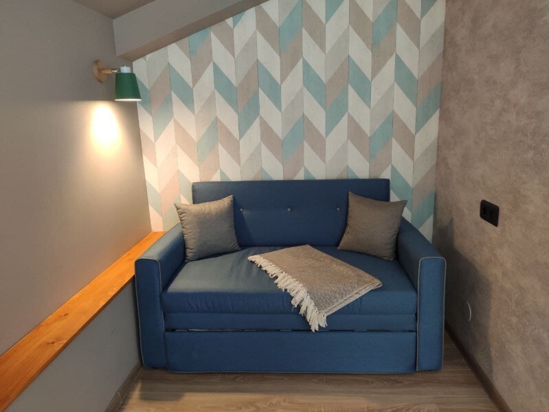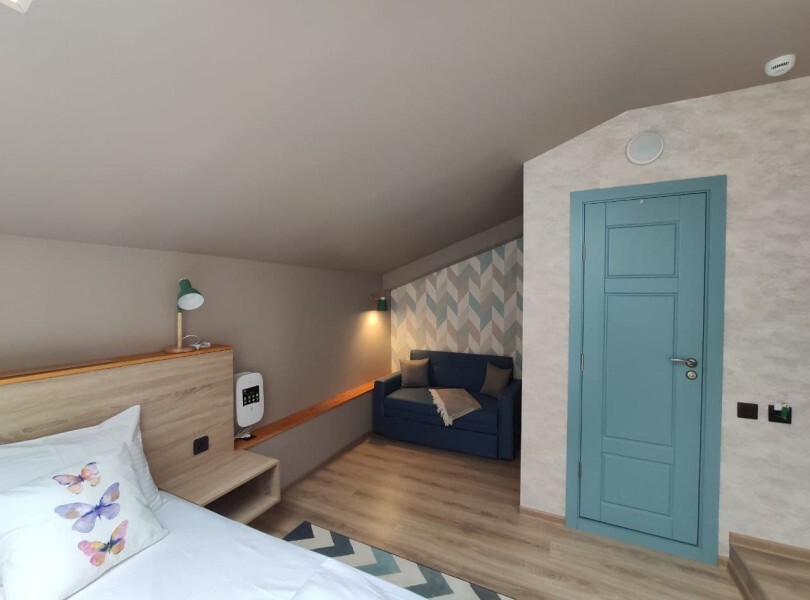 Уютный семейный номер с собственным санузлом и мансардным окном. В номере двуспальная кровать с ортопедическим матрасом и двухместный раскладной диванчик с дополнительным спальным комплектом. Комплект полотенец, принадлежности для душа (шампунь, гель), фен, горячая вода из бойлера. Номер оборудован приточно-вытяжной системой вентиляции с бризером (очиститель уличного воздуха) и кондиционером. Мансардное окно со шторкой блэкаут.