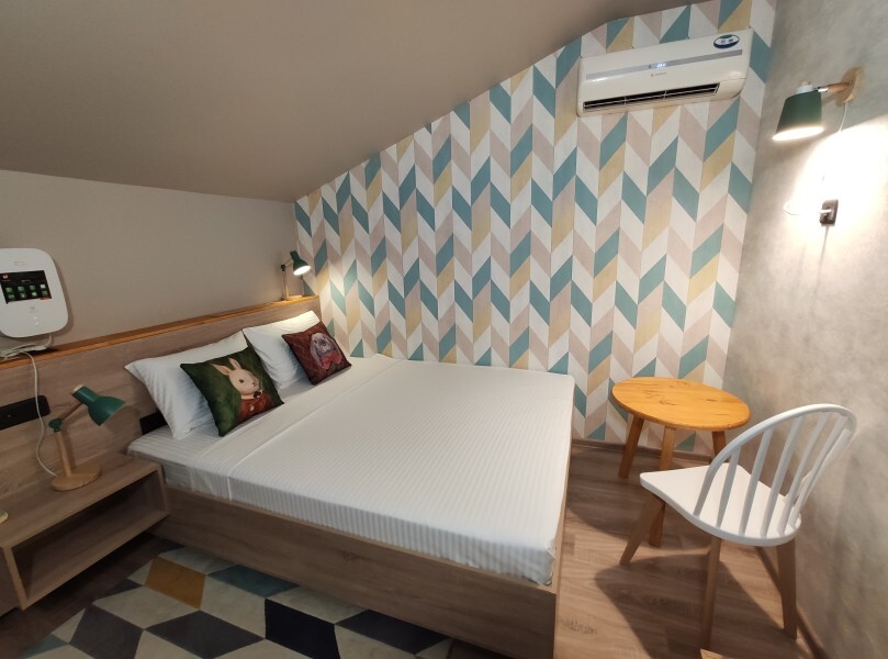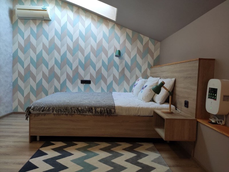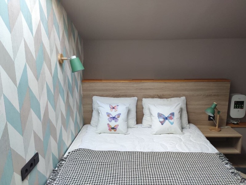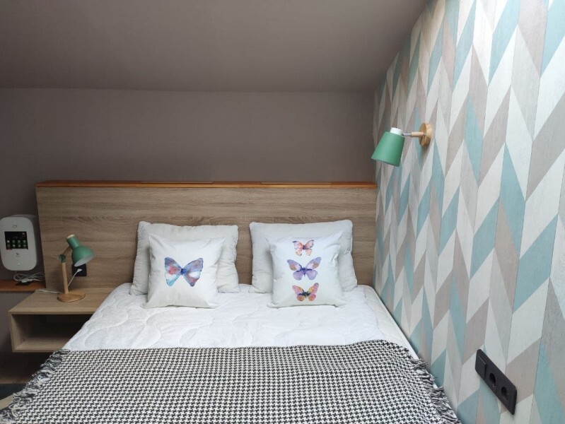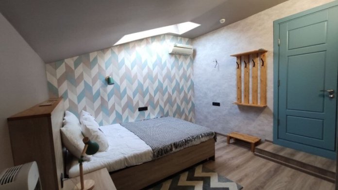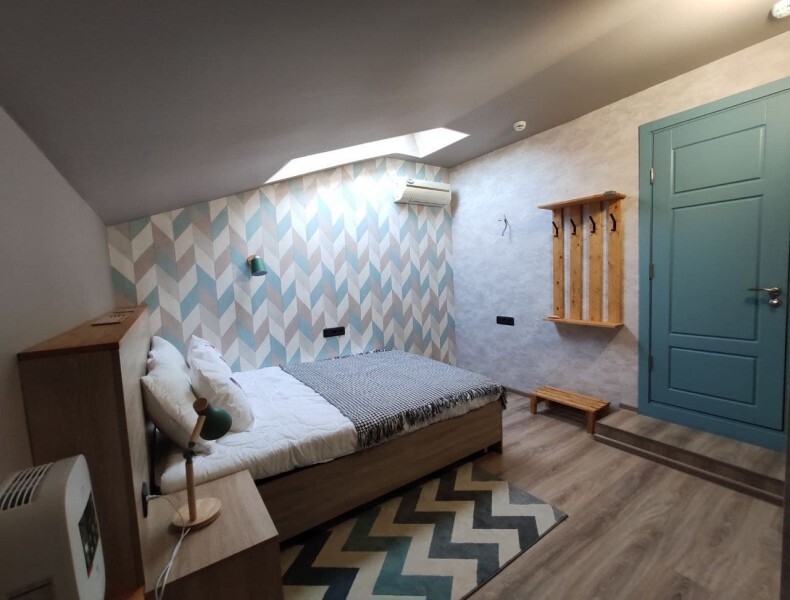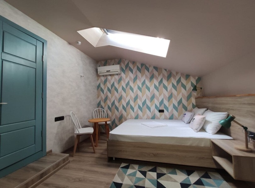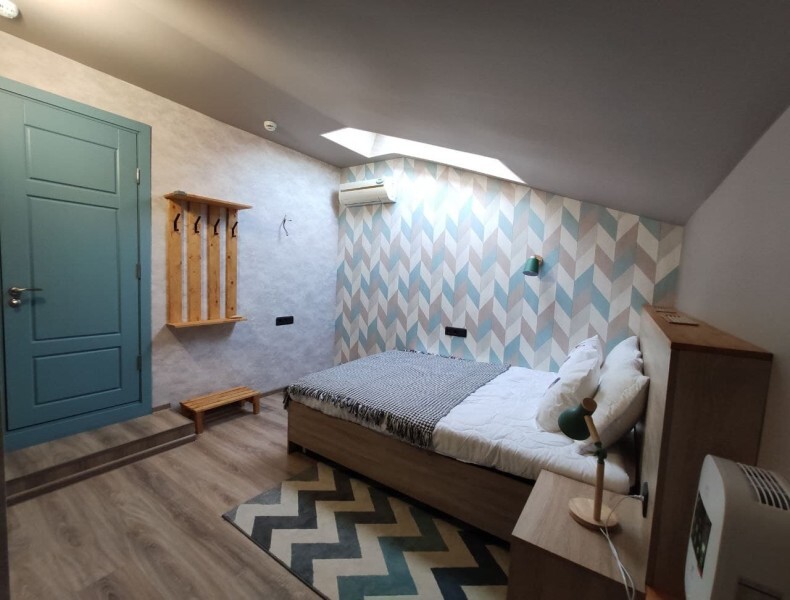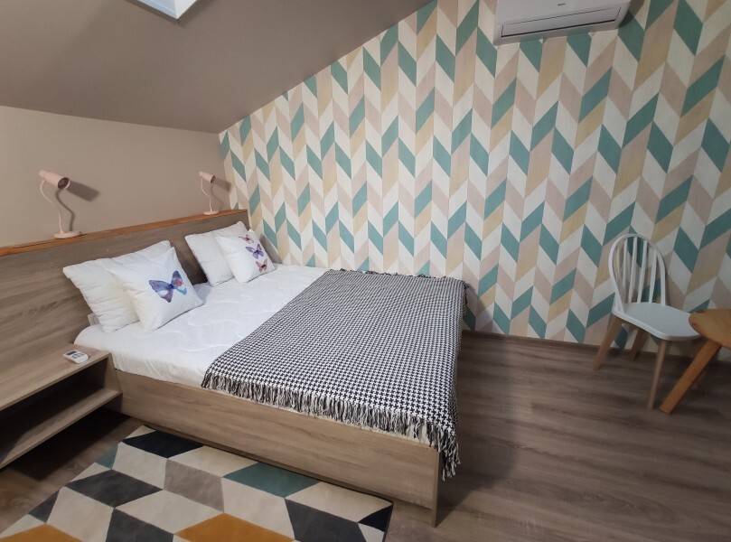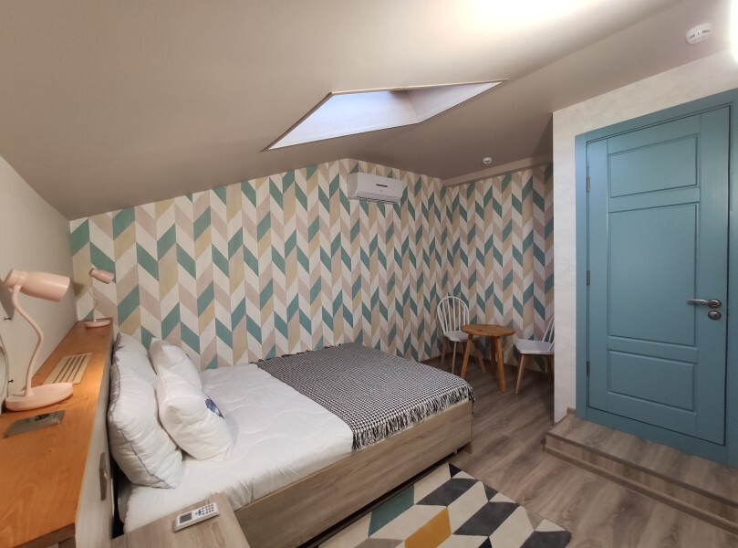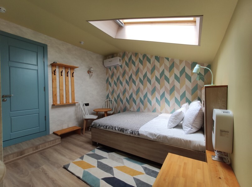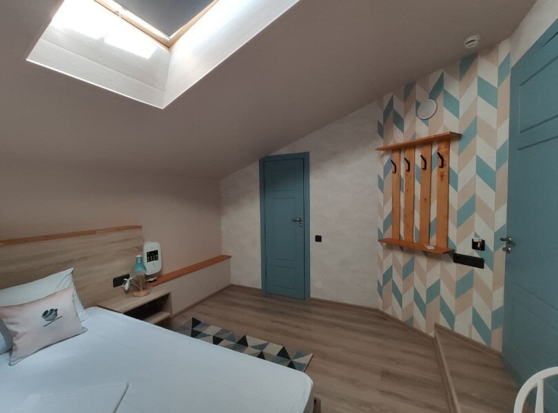 Уютный номер с собственным санузлом и мансардным окном. В номере двуспальная кровать с ортопедическим матрасом, комплект полотенец, принадлежности для душа (шампунь, гель), фен, горячая вода из бойлера. Номер оборудован приточно-вытяжной системой вентиляции с бризером (очиститель уличного воздуха) и кондиционером. Мансардное окно со шторкой блэкаут.