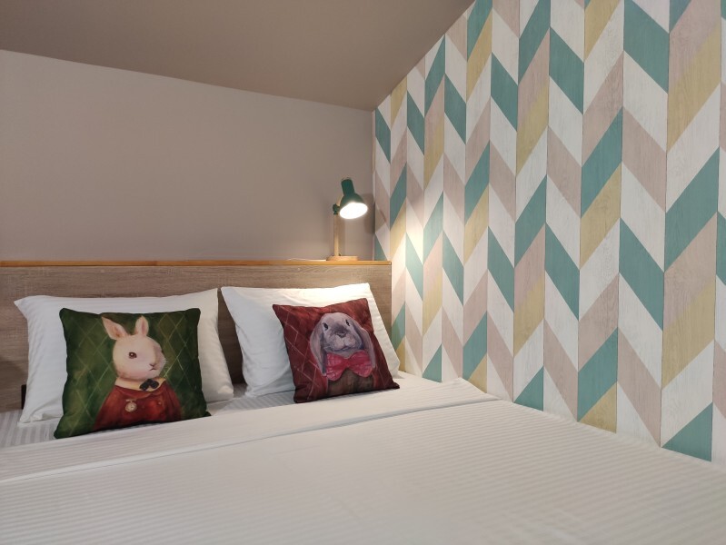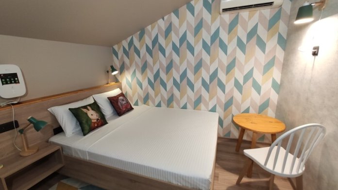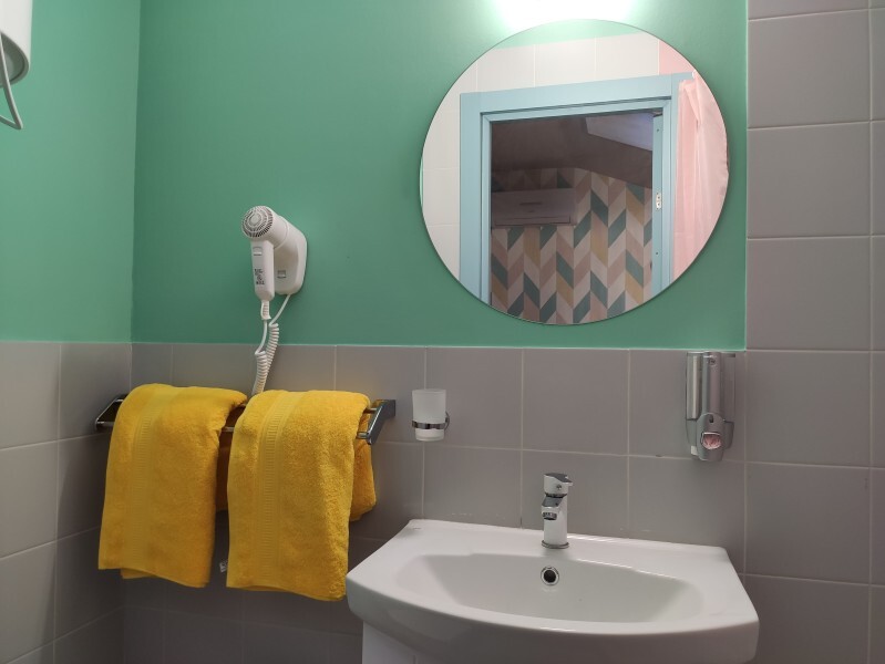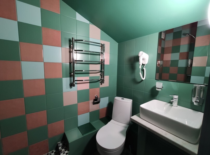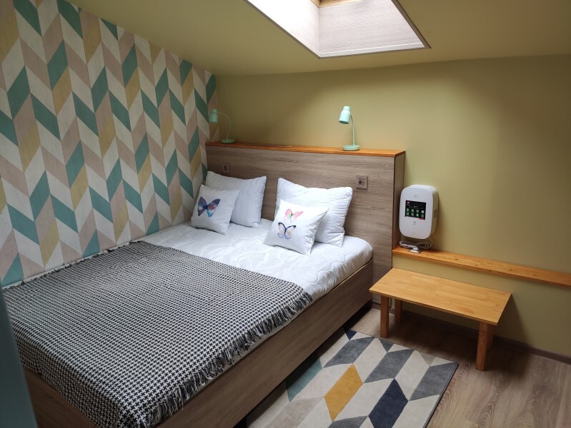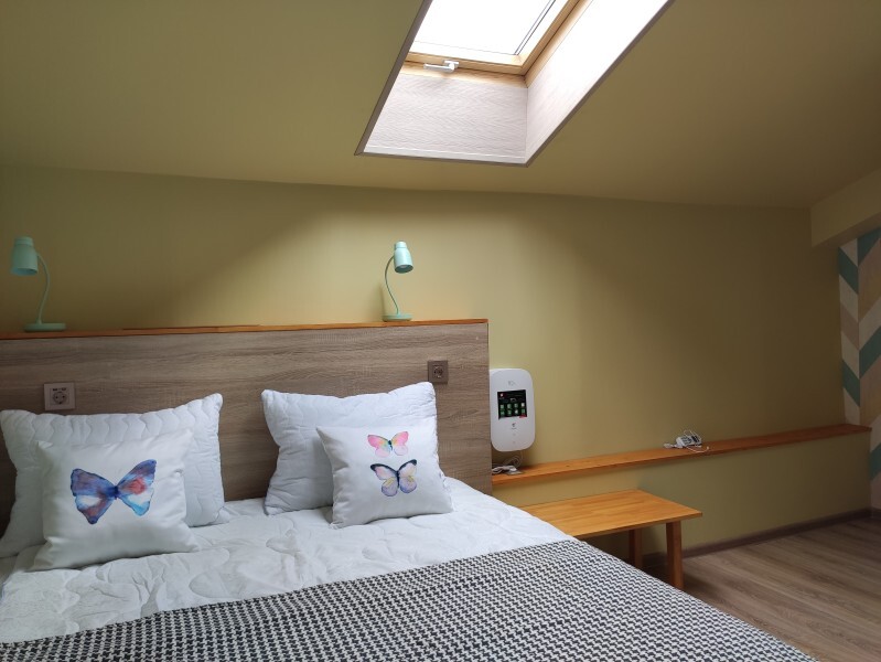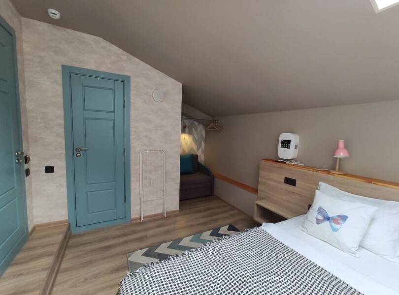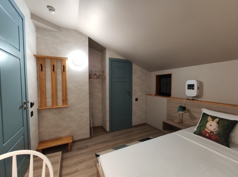 ютный семейный номер с собственным санузлом и мансардным окном. В номере двуспальная кровать с ортопедическим матрасом, есть возможность установить ортопедическую раскладушку с дополнительным спальным комплектом. Комплект полотенец, принадлежности для душа (шампунь, гель), фен, горячая вода из бойлера. Номер оборудован приточно-вытяжной системой вентиляции с бризером (очиститель уличного воздуха) и кондиционером. Мансардное окно со шторкой блэкаут.