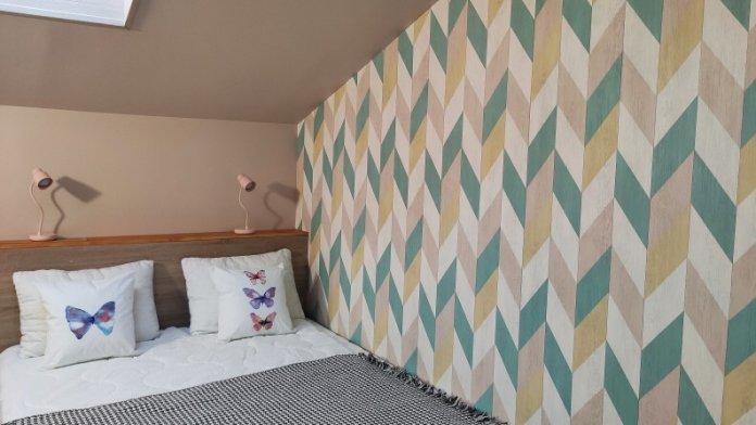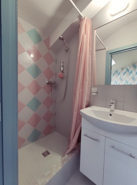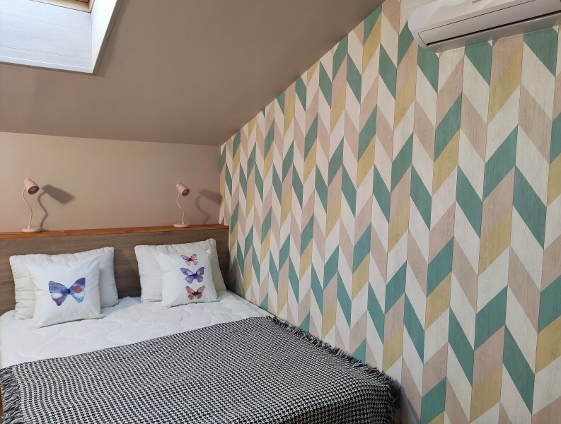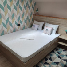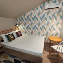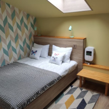 Уютный семейный номер с собственным санузлом и мансардным окном. В номере двуспальная кровать с ортопедическим матрасом, есть возможность установить ортопедическую раскладушку с дополнительным спальным комплектом. Комплект полотенец, принадлежности для душа (шампунь, гель), фен, горячая вода из бойлера. Номер оборудован приточно-вытяжной системой вентиляции с бризером (очиститель уличного воздуха) и кондиционером. Мансардное окно со шторкой блэкаут.
