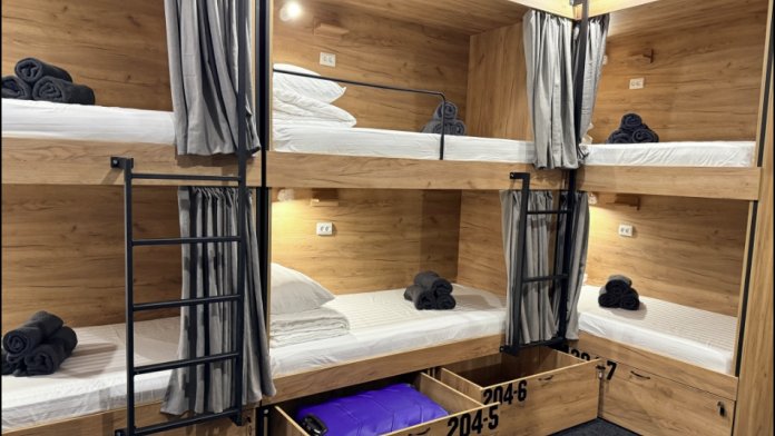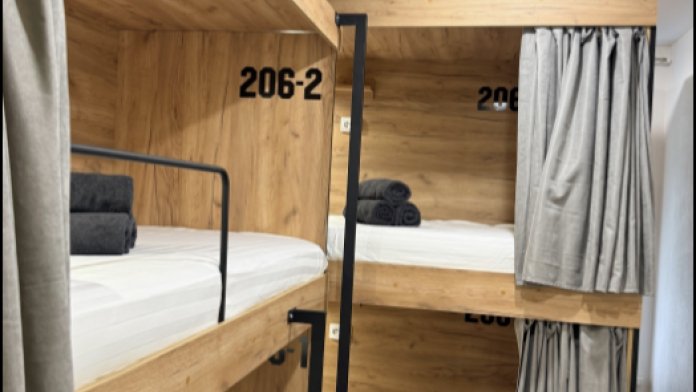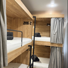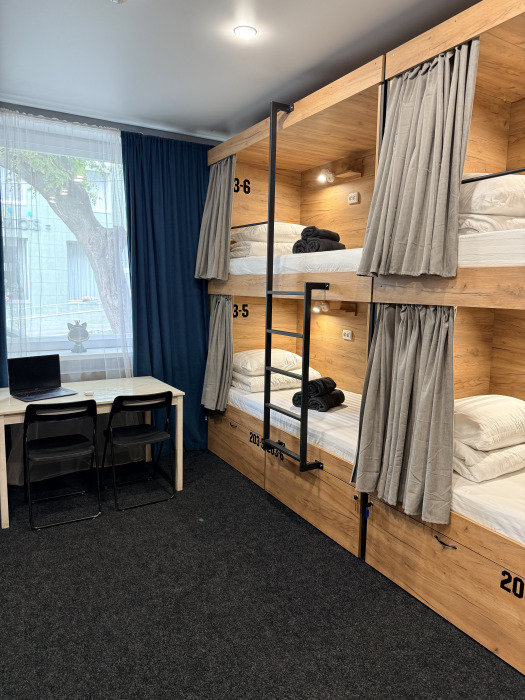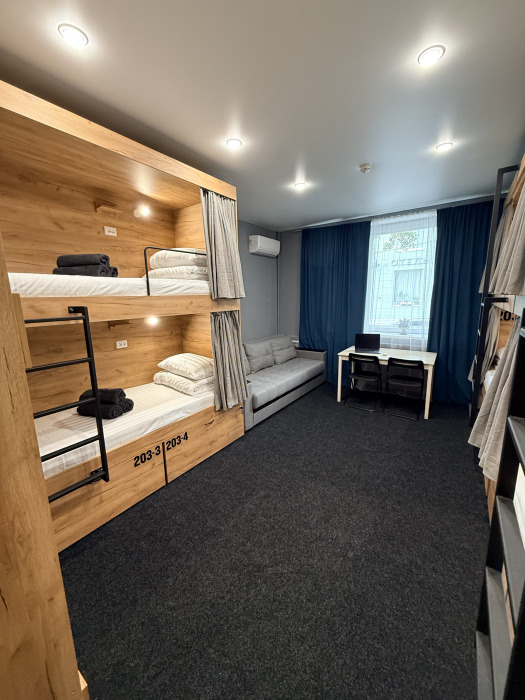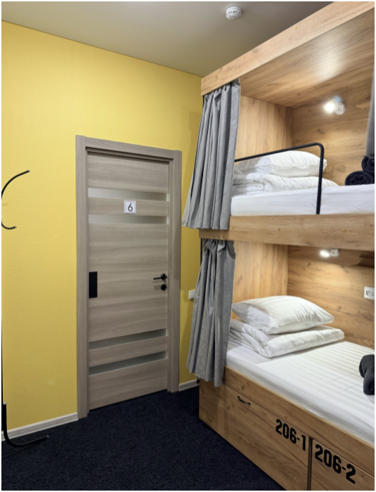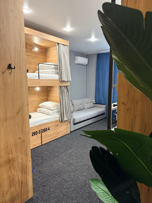 3 Двухъярусные кровати со шторками. Индивидуальные шкафчики. Вешалка. Прикроватные светильники. Кондиционер. Ламинат. Индивидуальные полотенца.