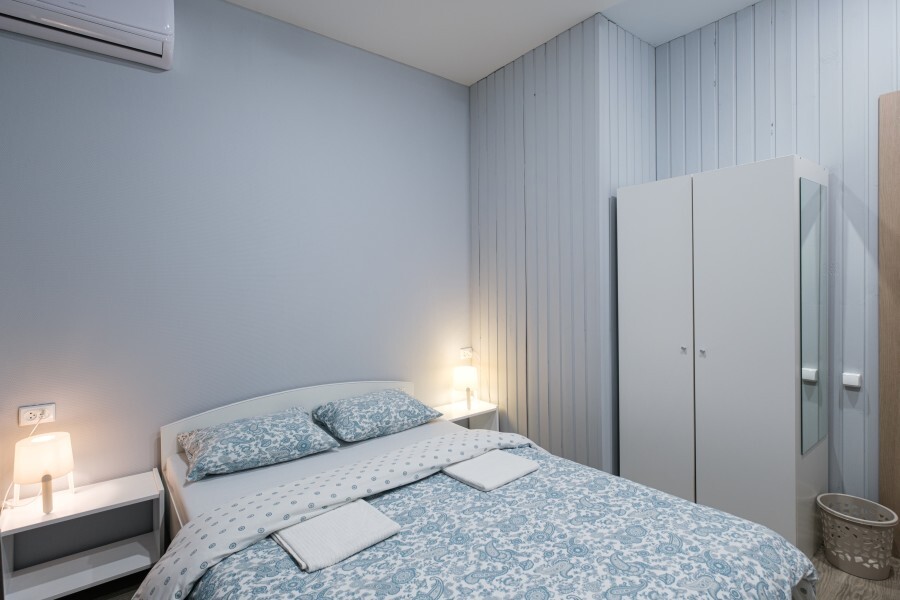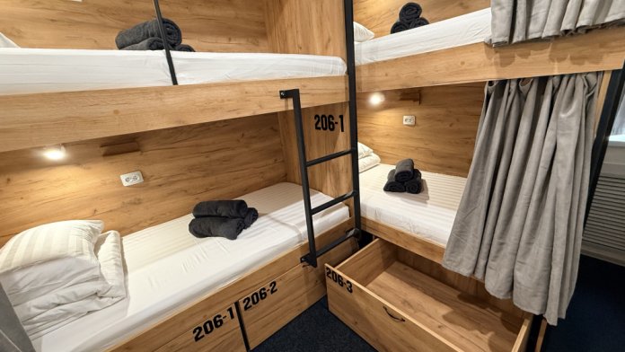 5 Двухъярусных кроватей со шторками. Индивидуальные выкатные шкафчики. Вешалка. Прикроватные светильники. Кондиционер. Ламинат. Индивидуальные полотенца.