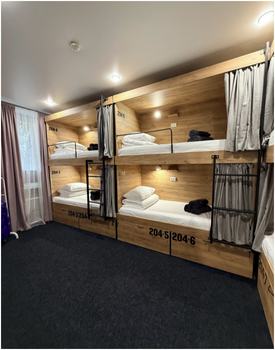 5 Двухъярусных кроватей со шторками. Индивидуальные выкатные шкафчики. Вешалка. Зеркало. Прикроватные светильники. Кондиционер. Ламинат. Индивидуальные полотенца.