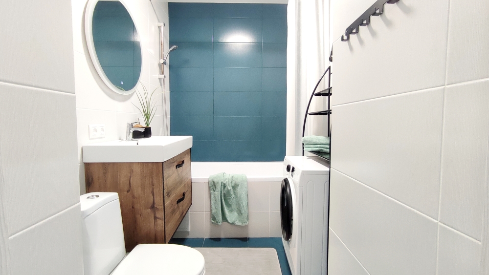 Бытовая техника: телевизор и беспроводной интернет, кондиционер, большой холодильник, электроплита, чайник, микроволновая печь, фильтр-кувшин для воды, стиральная машина, фен, полотенцесушитель, бойлер, утюг, пылесос, гладильная доска.