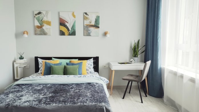 Мебель: кровать с ортопедическим матрасом, диван-кровать, консольный столик, обеденная зона на 4 человек, большая гардеробная зона в прихожей для хранения вещей.